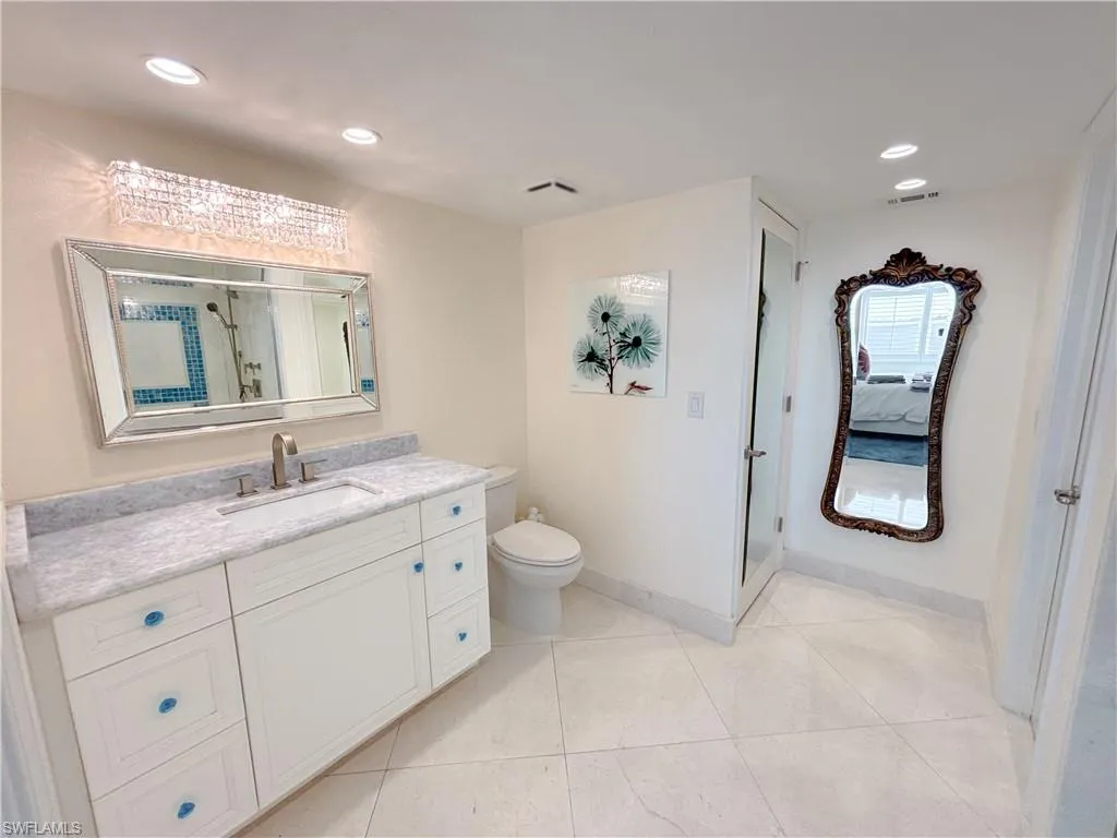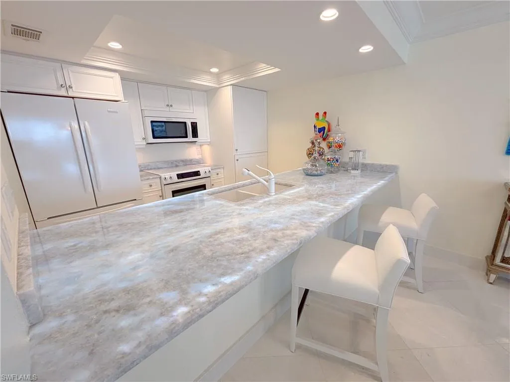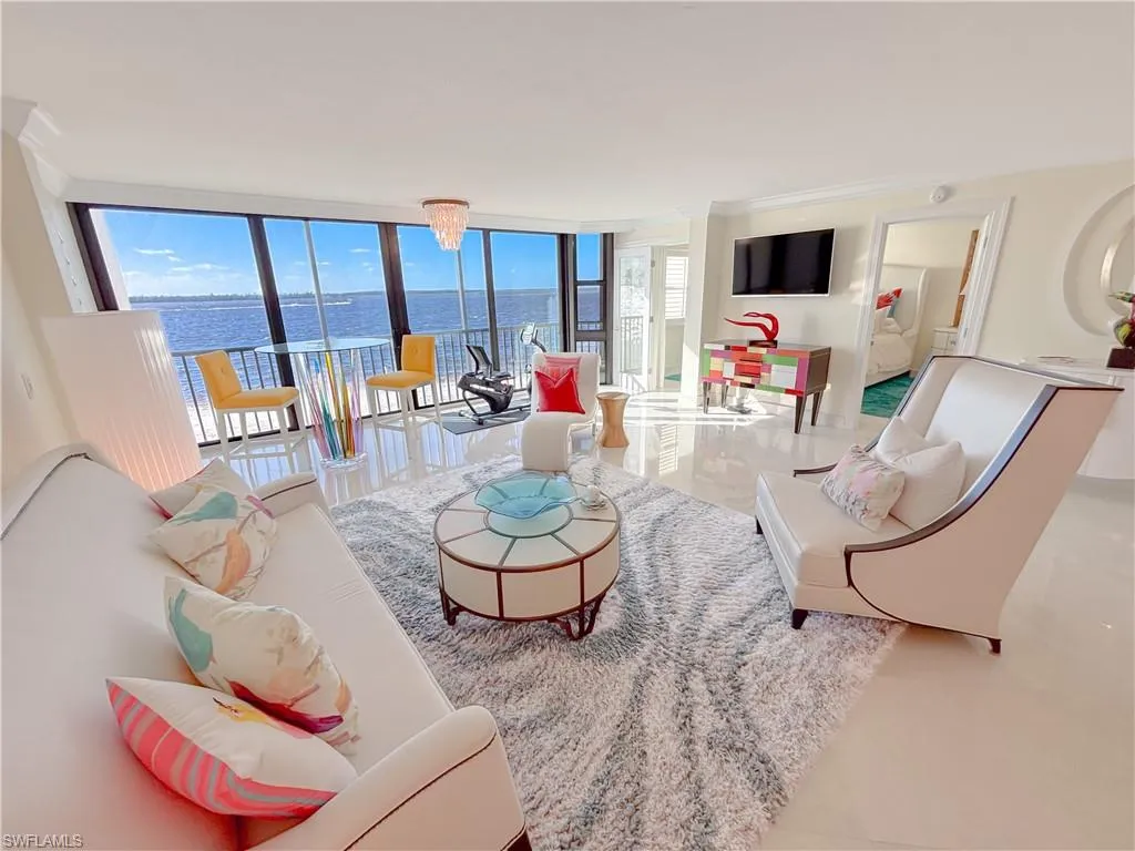 The Perfect Beach Get Away! Open your sliding doors and windows and let the warm, coastal fresh air in! This 2 bedroom/2 bathroom, unfurnished condo is situated in the highly sought after Sanibel Harbour Towers and includes many upgrades. In 2024 New Hurricane windows were installed, a new Washer and Dryer installed, a new water heater was installed, A/C was just installed in 2021 and Hurricane Impact sliding door in 2014. Through the front door you are greeted by luxurious marble flooring that flows through the entire condo, beautiful crown molding in main living areas and bedrooms, a fantastic light monochromatic theme providing the perfect base to showcase you personal design style & pieces. The Living room has been expanded by converting lanai to living space and showcasing the stunning gulf/bay water views. The kitchen is sleek featuring Quartzite counters and undermount counter lighting. The primary suite is spacious and boast picturesque views and large