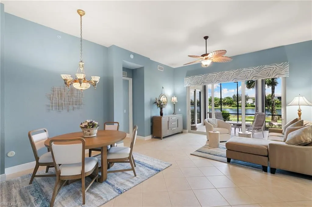 CDD PAID IN FULL! Step into this charming, meticulously maintained 3-bedroom, 3-bath condo, and be instantly captivated by panoramic WATER views. Thoughtfully designed for comfort and peace of mind, this residence boasts Storm Smart roll-down shutters on the lanai, a NEWER ROOF and IMPACT windows and sliders throughout. The open-concept layout features neutral tile floors, with CoreTec (luxury vinyl) in the bedrooms adding warmth and durability. Volume ceilings enhance the spacious feel, allowing for an abundance of natural light. The primary suite is a true retreat, with serene Falkland Blue walls, a frameless glass, SPA-LIKE shower, and a separate soaking tub. Dual sinks offer added convenience, making this space as functional as it is tranquil. For culinary enthusiasts, the kitchen is a dream. With GAS COOKING, custom white cabinetry, lovely granite counters, a large island perfect for meal prep, and a generous pantry, you’ll have PLENTY of space to create and entertain. The kitchen is finished in a soothing Violet Mist, complementing the elegant and inviting custom draperies in the home. Best of all, the kitchen, great room, and many other rooms in the home overlook the WATER, offering peaceful views to enhance your everyday living. The two additional guest bedrooms provide privacy and comfort, making this home ideal for hosting family and friends. The courtyard entry, complete with a cozy seating area, welcomes you into this inviting space, while the expansive lanai provides plenty of room for lounging and dining al fresco—ALWAYS with serene water views in the background. Other recent updates include lanai screen, tankless hot water heater and a new garage door opener-offer peace of mind and ease of ownership. The Laguna community also has its own pool, perfect for a refreshing dip just steps from your door. Fiddler’s Creek is a prestigious resort-style community where luxury and nature exist in perfect harmony. Featuring world-class amenities such as the Club & Spa, casual and fine dining, championship golf courses, and beautifully landscaped grounds, residents enjoy a lifestyle that blends relaxation with recreation. Optional memberships for beach, boating, and marina access provide even more ways to enjoy the coastal lifestyle. Minutes from Marco Island AND downtown Naples, Fiddler’s Creek offers an unparalleled living experience.