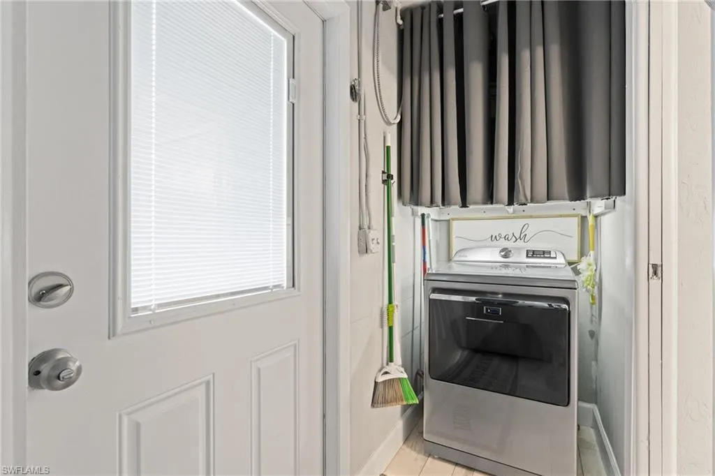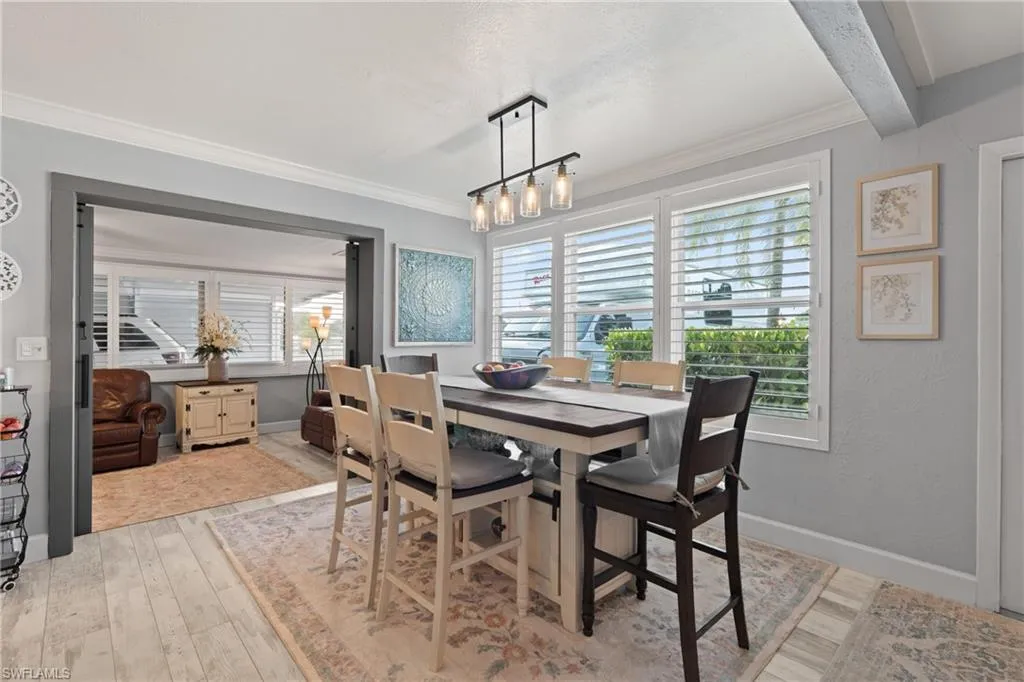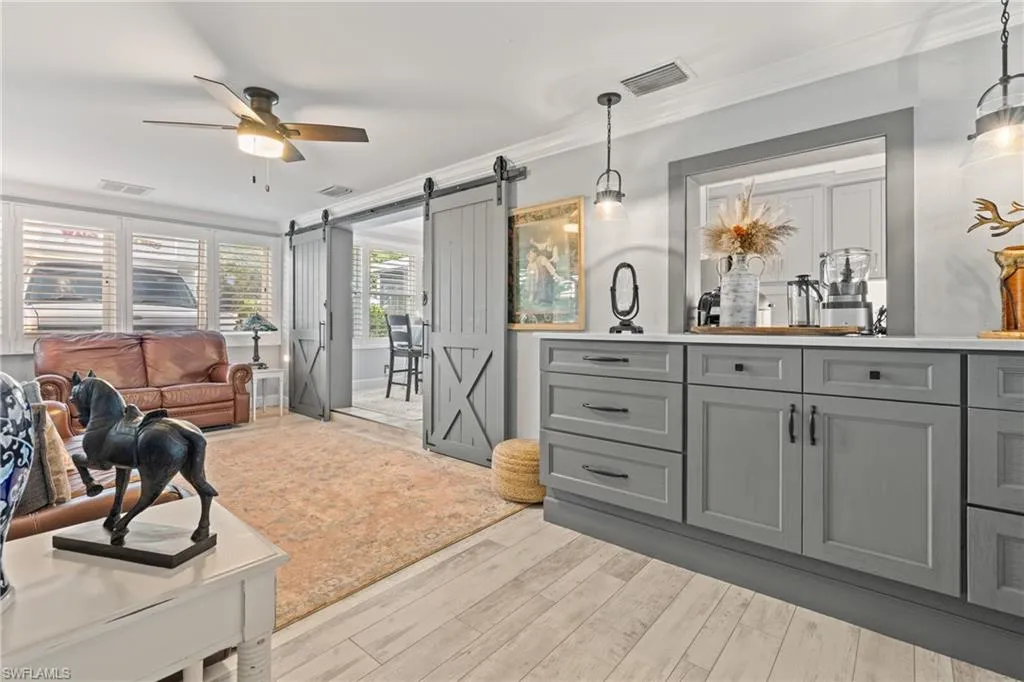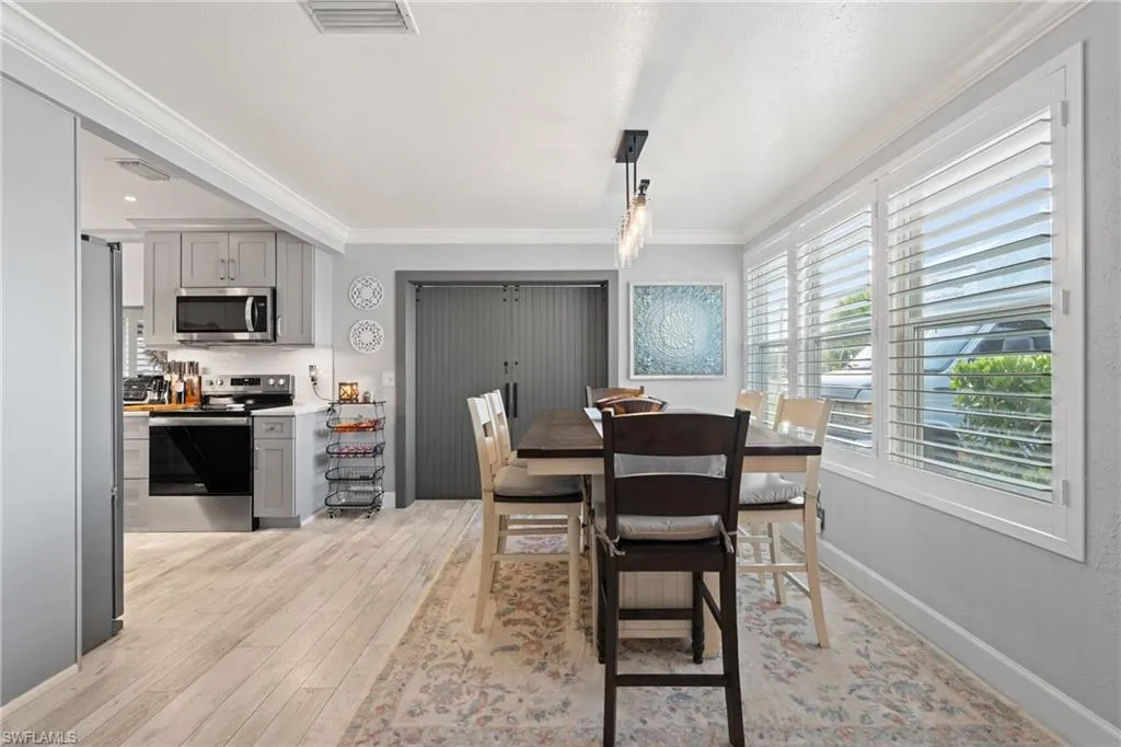 Step into this beautifully upgraded residence offering the perfect combination of modern luxury, timeless style, and sustainable living. Featuring 3 bedrooms, 2 bathrooms, and a fenced front and backyard with a private gate, this home is designed to impress inside and out. The master suite features a spacious walk-in closet along with an additional closet in the master bathroom, offering exceptional storage and organization. The interior showcases plantation shutters throughout, waterproof hardwood flooring, and crown molding in the dining room, kitchen, and family room. The gourmet kitchen is a chef’s dream with rich wood cabinetry, quartz countertops, a farmhouse sink, and a voice-activated touchless faucet. Sleek upgrades include smudge-resistant stainless steel appliances, under-cabinet LED lighting, and unique cabinet features such as a spice rack drawer and garage-style cabinet door. A full subway tile backsplash to the ceiling completes the space with a high-end designer touch. Both bathrooms feature new vanities, while the master suite includes a spa-inspired shower with a built-in bench and floor-to-ceiling tile. Additional peace of mind comes with a newer roof, a new A/C system, and two hot water heaters, all less than a year old—making this home as reliable as it is beautiful. The outdoor living spaces are equally impressive. The fenced backyard is enhanced with tropical landscaping, Clusia hedges, Black Olive and Green Buttonwood trees, and a built-in irrigation system. At night, enjoy commercial-style low-voltage landscape lighting highlighting the lush grounds. Brick pavers accent the courtyard creating a refined exterior look. Sustainability meets convenience with solar panels and backup batteries, ensuring reliable power during storms—and no electric bill year-round. Additional perks include city water and septic, plus a well-fed sprinkler system for cost-efficient lawn care. This stunning property offers style, comfort, and peace of mind in one of the most desirable locations. Move right in and enjoy the best of Florida living.
