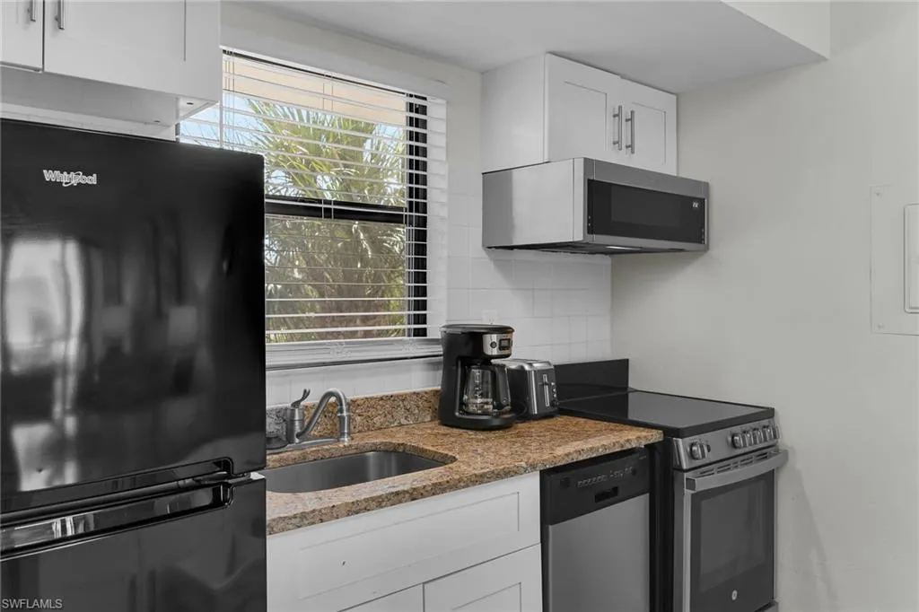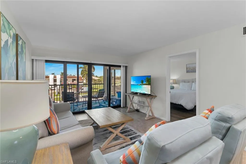 Anglers Cove condo with sunny west exposure. All new hurricane rates doors and windows already permitted and installed in 2024 for maximum protection. Great investment condo with weekly rentals allowed and electric included in condo fee. Anglers Cove is a waterfront resort style community with boat docks available for leasing and is direct Gulf access. Along with 2 huge pools 2 hot tubs, 2 tennis courts. Walk into a beautiful open floor plan with functional kitchen with newer appliances, granite countertops, tiled backsplash, new shaker style cabinets and updated lighting. A kitchen island with stools, a perfect place to entertain while in the kitchen. Big master bedroom with 2 beds and a pull out couch in living room a great set up for family and or a rental unit. A lanai to sit on to enjoy the tropical Florida air and watch the world go by. This condo is sold turnkey furnished for a convenience. Don’t wait to make this your new Florida home!