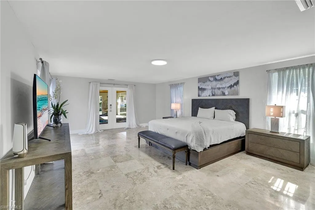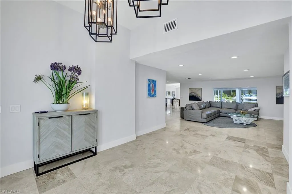 This newly updated home on an oversized water direct-gulf access estate lot boasts six bedrooms, three baths, and a spacious den with an open concept living area. The well-equipped designer kitchen features Cambria quartz countertops, a center island with a waterfall edge, contemporary white and navy blue cabinets, custom lighting and stainless steel appliances. The primary suite, designed to resemble a spa, includes dual sinks with a makeup vanity, a standalone tub and shower and ample space for relaxation. The lanai area offers a separate pool and spa, equipped with a new dual pool pump, heater and Aqualink system. Additionally, the estate features a new upgraded metal roof, new extra high seawall, new oversized 14,000-pound boat lift capable of accommodating a 40-foot boat, a new water heater, new upgraded air-conditioning systems and ductwork, a new screen enclosure, attic insulation, impact windows, entry door and impact garage door. Notably, the home is being sold furnished, providing potential buyers with a hassle-free move-in experience.