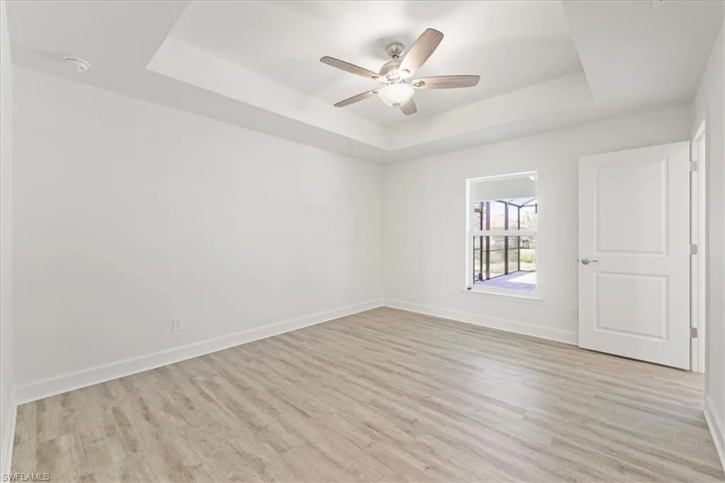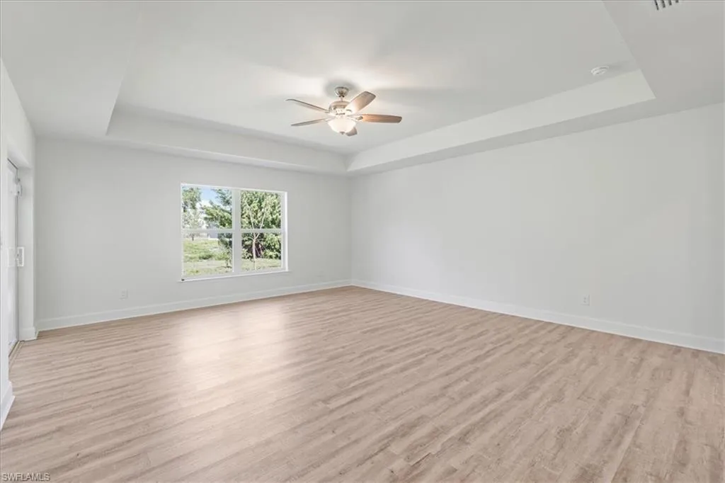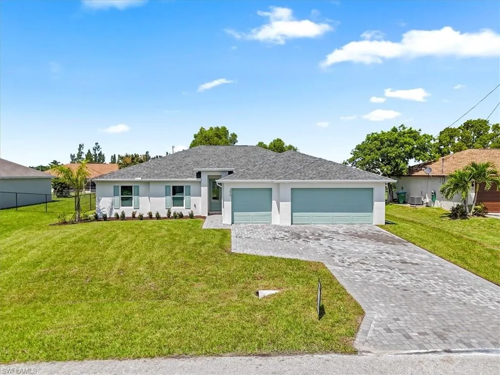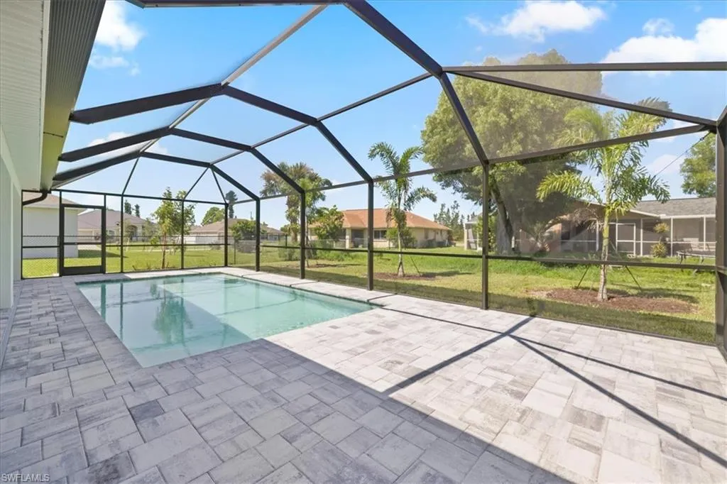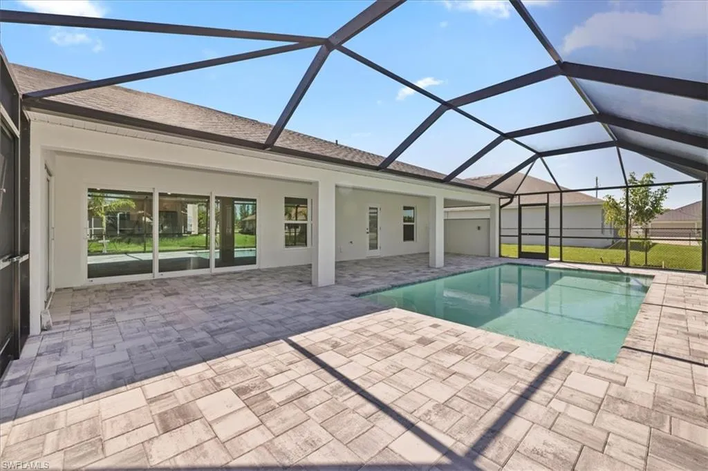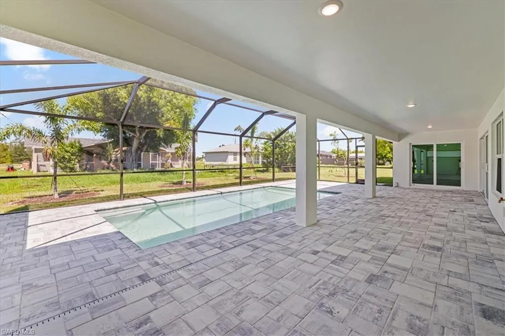 NEW FENCE JUST INSTALLED! SPACIOUS POOL HOME WITH DUAL PRIMARY SUITES! City water and sewer with ALL ASSESSMENTS PAID! Welcome to the Paradise Cove Plan—a stunning, expansive retreat designed for comfort and elegance! This huge 4-bedroom, 3-bath home boasts two luxurious primary suites, making it perfect for multi-generational living or accommodating guests in style. Step inside to discover an open-concept great room with soaring ceilings seamlessly blending indoor and outdoor living. The heart of the home is the gourmet kitchen, featuring soft-close, all-wood cabinetry, quartz countertops, stainless steel appliances, and an oversized walk-in pantry—a dream for any chef! The first primary suite is a private oasis, spacious enough for a king-size bed and a cozy seating area. Enjoy direct access to the lanai and pool, plus a spa-inspired ensuite with a freestanding soaking tub and separate shower. The second primary suite is equally impressive, offering a full bath that also serves as a convenient pool bath, along with a generous walk-in closet. Outside, relax on the lanai or take a dip in the heated pool, perfect for year-round enjoyment. Built by a trusted local builder, this home offers incredible value in Cape Coral with impact windows for added security and lower insurance costs, no flood zone offering peace of mind and savings, and a 10-year structural warranty for long-term confidence. This is The Paradise Cove Plan.