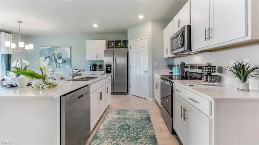 Under Construction. The appealing one-story home includes many contemporary features, and an open-concept design with 8’8″ ceilings that enhance the wonderful feel of this home. The well-appointed kitchen includes a large island perfect for bar-style eating or entertaining, a walk-in pantry, and plenty of cabinets and counter space. The dining room and living room both overlook the covered lanai, which is a great area for relaxing and dining al fresco. The large primary bedroom located at the back of the home for privacy, can comfortably fit a king-size bed, and includes an En Suite bathroom with double vanity, big walk-in closet, and separate linen closet. This open concept Home comes with designer cabinets and hardware, 6”x24” Plank tile through, 18” tiled showers, Quartz counters throughout, all Stainless Steel kitchen appliances, Washer/Dryer, blinds on all windows, Storm Shutters, and the latest Smart Home technology with a smart thermostat, smart door lock, video doorbell, smart garage controller, hands free commands and more. We also provide your homesite fully sodded and landscaped. These homes move quick so don’t miss out!