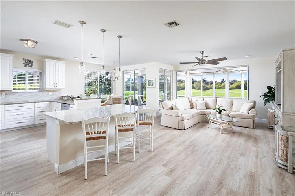 Delightfully sunny, this pristine end-unit coach home offers fabulous forever lake and golf course vistas of the picturesque seventh hole with no other buildings in sight, complete with preferred southern exposure. IMMEDIATE FULL GOLF MEMBERSHIP AVAILABLE. The light and bright airy feel is complemented by an open great room layout, fabulous renovated white kitchen is ideal for entertaining with large counter-level quartz island, beverage refrigerator, 42-inch cabinetry, stainless steel appliance package, new wide plank white oak LVT flooring, new light fixtures, fans and LED lighting throughout. Perched on one of the best lots in the complex with across the street to the community pool, eight guest parking spots and the mailboxes, this lovely condominium comes complete with one of the quietest locations in the development. Features include a wraparound lanai with pocket sliders and hurricane shutters, additional golf cart garage, newer building roof, loads of storage, main closet custom built-ins, large walk-in closet in one guest room, built-in desk in the other guest bedroom and paver driveway completes the package. Immediate full golf membership available in this one-of-a-kind club with an active lifestyle and a variety of memberships available (minimum social membership required). Estero Country Club offers a beautiful, award-winning Gordon Lewis golf course, recently renovated clubhouse with fabulous dining options inside and out, four tennis courts, six pickleball courts, state-of-the-art fitness center, bocce and an abundance of social activities throughout the year.