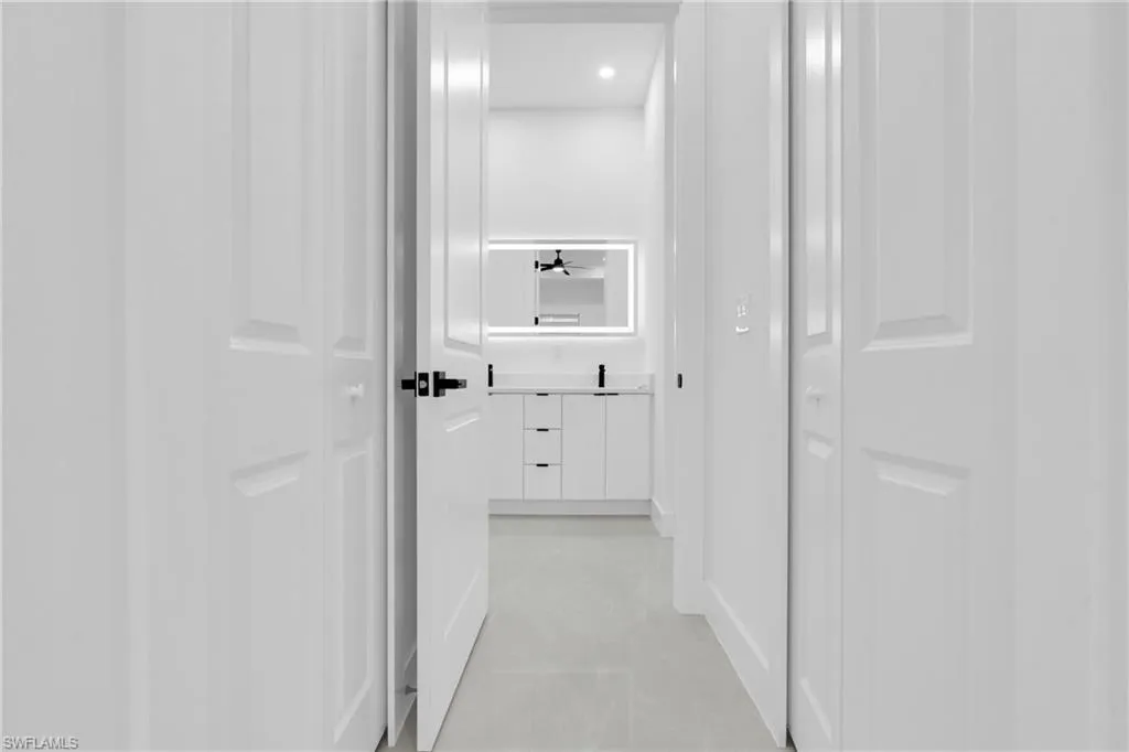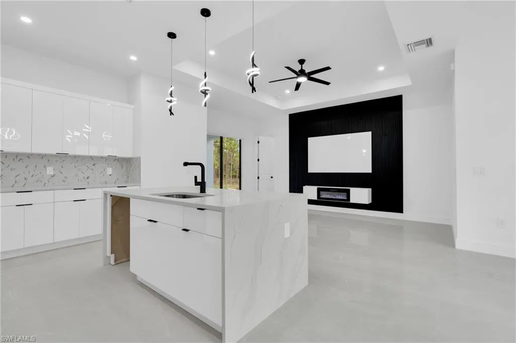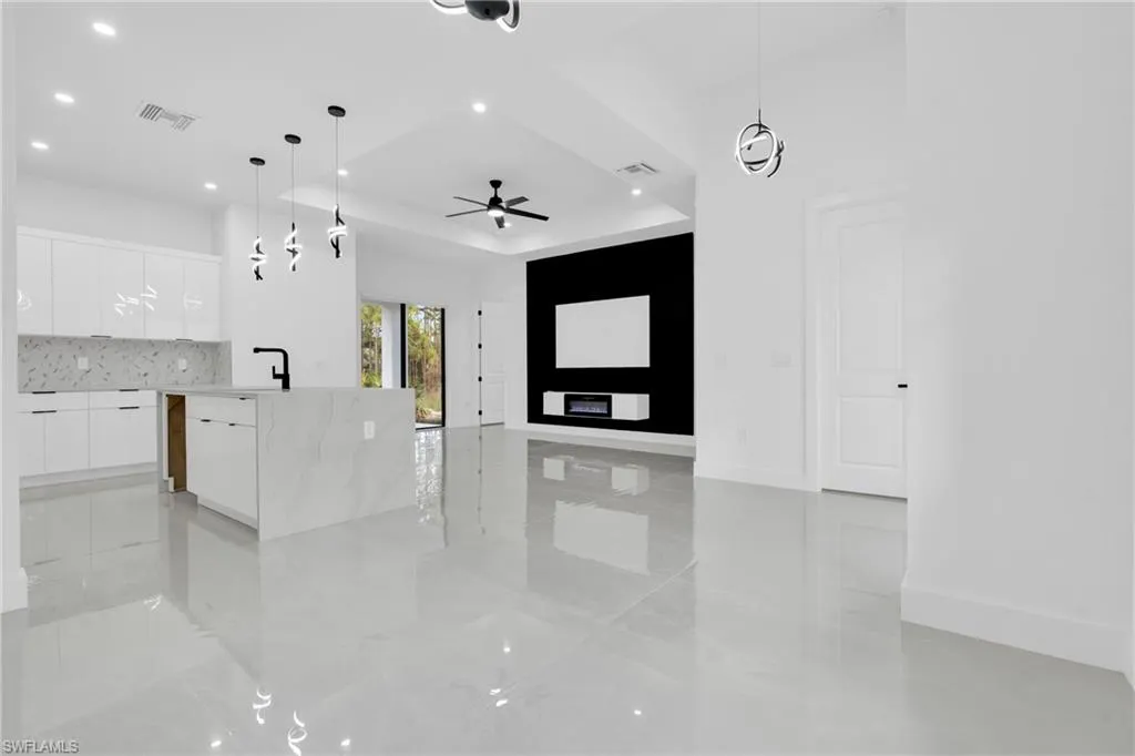 The interior features large-format porcelain tile flooring throughout, creating a sleek and easy-to-maintain environment. The modern kitchen showcases European-style cabinetry, quartz countertops, and contemporary finishes designed for both style and functionality.