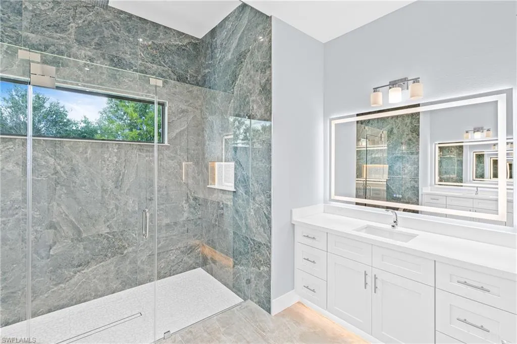Enjoy the outdoors year-round in the oversized lanai, complete with a summer kitchen and wide sliding glass doors that open to expansive views of your private backyard.