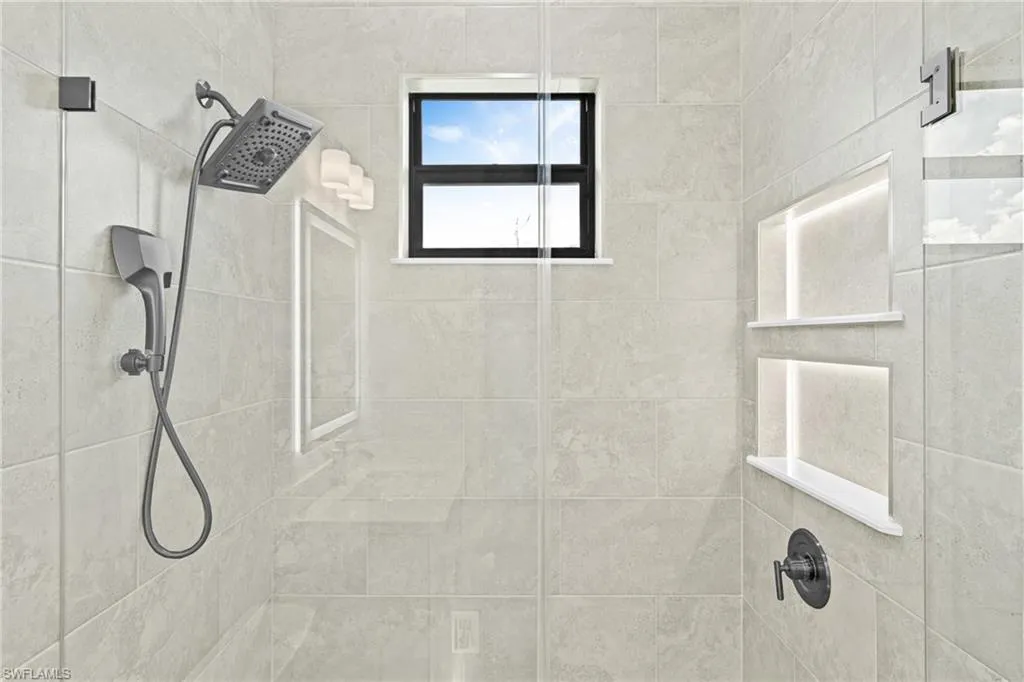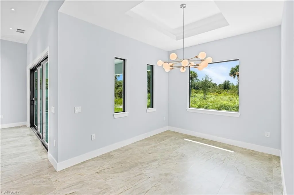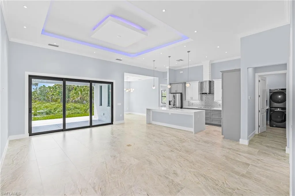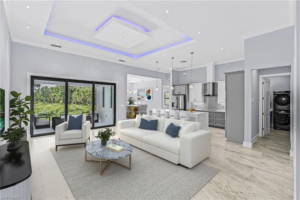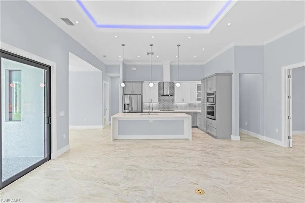 Step inside to discover a thoughtfully designed interior boasting high-end finishes throughout, including elegant porcelain floors, impact-resistant windows and doors, and high ceilings with tray and coffered ceiling details. The home is equipped with a whole-house surge protector, two A/C units with smart thermostats, smart LED lighting, and a reverse osmosis water system.