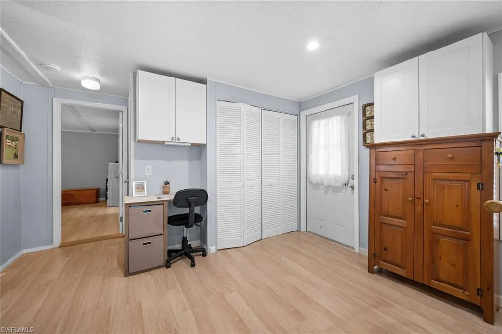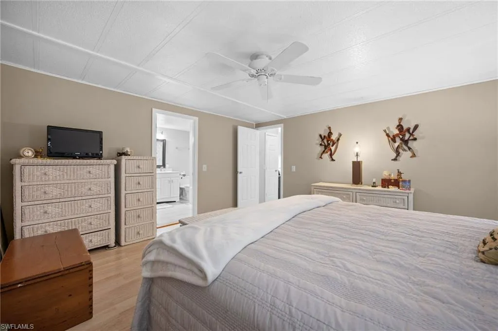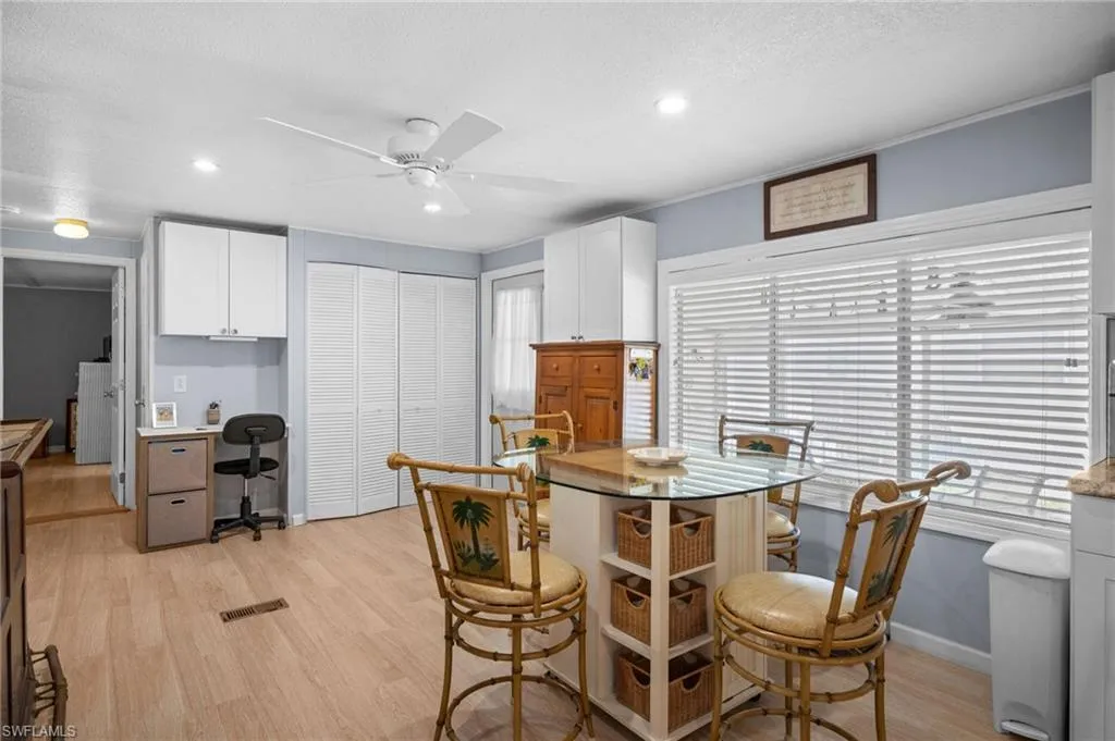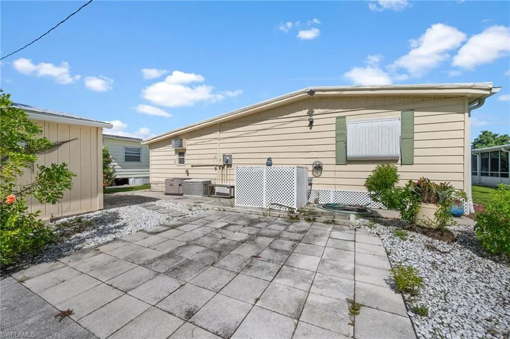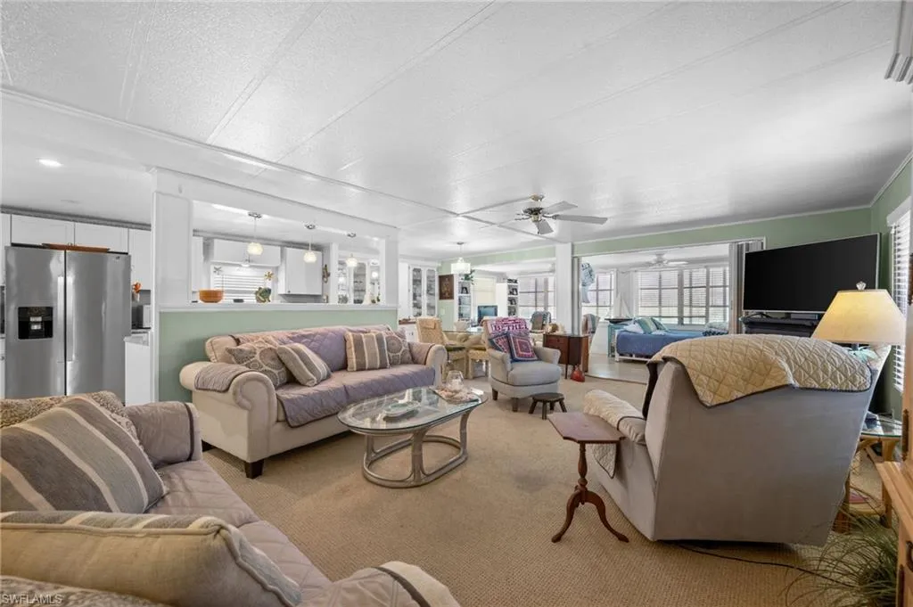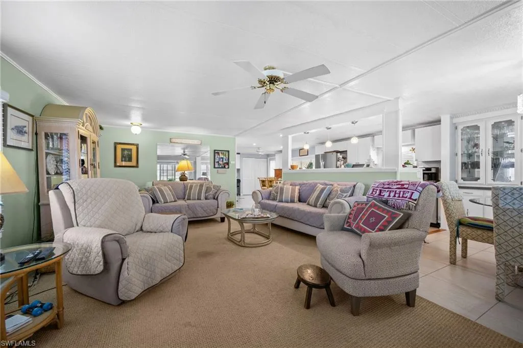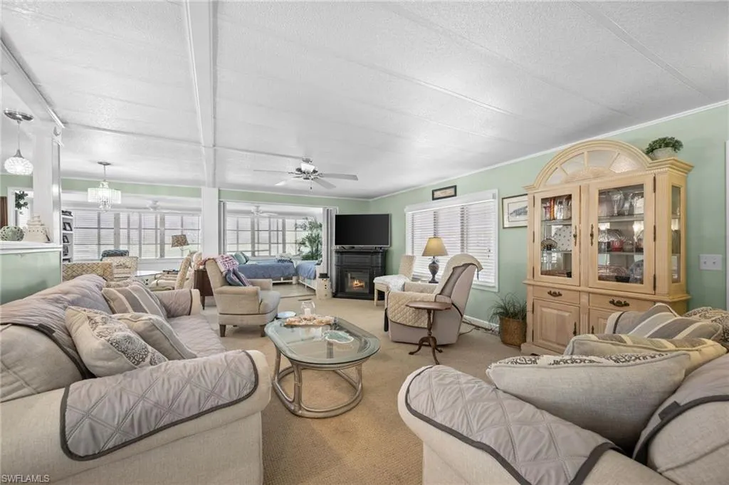 Lot behind is included in the sale! Turnkey 2-bedroom, 2-bath manufactured home with 1,584 sq. ft. of living space located on a quiet cul-de-sac in Riviera Colony, a 55+ community in Naples. This residence offers a functional floor plan with an attached carport, screened lanai, and a paver patio for outdoor enjoyment. The kitchen, updated in 2018, features plenty of cabinet space, a breakfast area with high-top seating, and a built-in desk. The dining room includes a built-in china cabinet, while the spacious living room comes furnished with sofas, recliner, and accent furniture. The large primary suite includes an ensuite bath with dual vanities. A secondary bedroom and bath provide space for guests, along with a second living area already set up with additional beds. A storage shed and shop are conveniently located off the lanai for hobbies or extra storage. Additional updates include a hot water tank (2019), A/C (2020), and ceiling fans throughout. Community amenities include a clubhouse, pool, community room, and shuffleboard. Situated just minutes from Route 41, this home offers easy access to Naples’ shopping, dining, and entertainment.