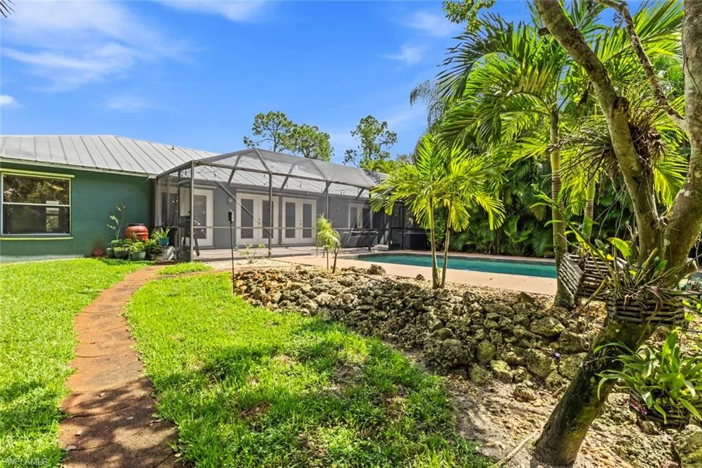 This beautiful Old-Florida courtyard-style home combines space, privacy (fully fenced front and back yard) and timeless character on over an acre of land in the heart of Naples. From the moment you arrive, the inviting 3-car garage and covered breezeway welcome you into a stunning private courtyard—perfect for outdoor games, family gatherings or relaxing in the Florida sunshine. Step through French doors into the expansive great room, featuring vaulted ceilings and an open, airy floor plan. The spacious kitchen offers a NEW dishwasher (Sept. 2025), ample cabinetry, a large breakfast bar and a dining area with courtyard views—ideal for entertaining or everyday family meals. The thoughtful split floor plan includes two guest bedrooms with a full bath, along with a private primary suite, featuring a walk-in shower, generous closet space and direct access to the screened lanai. For added flexibility, this property also includes a private attached in-law suite with its own full kitchen, dining area and two oversized rooms with vaulted ceilings, skylights and beautiful views of the courtyard and front entry. Whether used for multi-generational living or hosting guests, this suite provides endless possibilities. The outdoor space is designed for true Florida living. Enjoy a large swimming pool (NEW motor, Sept. 2025), screened lanai, hot tub, fire pit and a fully fenced backyard with mature fruit trees—offering plenty of room for gardening, recreation or creating your dream backyard retreat. With no HOA fees and an unbeatable location just minutes from many hot spots in Naples, you’ll enjoy both privacy and convenience. Easy access to I-75 makes commuting and travel simple. Don’t miss this rare opportunity to own a spacious courtyard-style pool home in Naples, FL. Appraised in August 2025 for $965,000, move in with EQUITY —an added bonus for buyers ready to make this one-of-a-kind property their own. NEW WELL PUMP AND WATER SYSTEM PRESSURE TANK (Sept. 2025).
