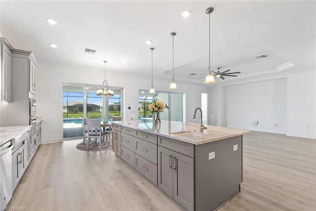 Discover luxury living and resort-style amenities in the highly sought-after gated community of Esplanade by the Islands. This recently completed Pallazio home 2024 is ideally situated on a quiet cul-de-sac and boasts 3,071 sq. ft. of elegant living space, featuring 3 spacious bedrooms, 3 full bathrooms, and a large den—designed to combine comfort, privacy, and flexibility. Enjoy breathtaking lakefront views with western exposure from your custom heated natural gas pool, complete with an extended deck, automatic pool filler, sun shelf, and electric hurricane shutters. The outdoor living space is further enhanced by a fully equipped outdoor kitchen with a natural gas grill, making it perfect for entertaining and everyday relaxation.