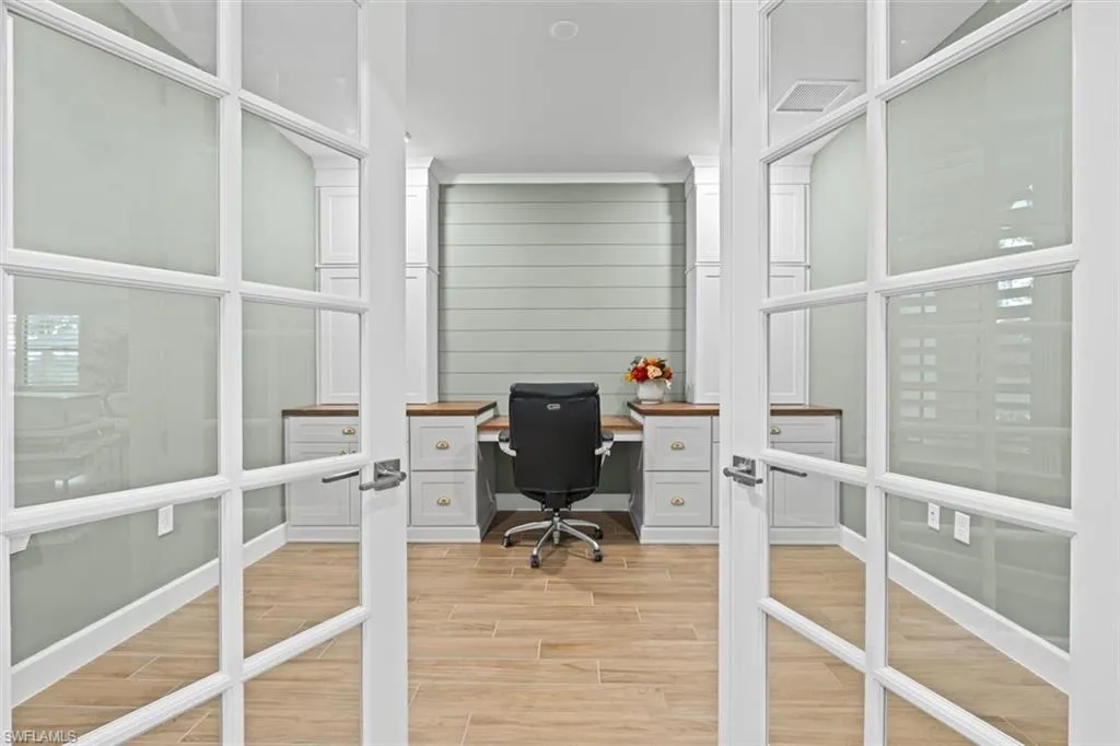 Experience refined elegance in this stunning, model-inspired home nestled on a serene cul-de-sac lot with breathtaking water and golf course views in the prestigious River Hall Country Club. From the moment you enter, exquisite craftsmanship captivates, with soaring coffered ceilings in the living room, elegant tray ceilings in the primary and guest suites, and custom built-ins in the private office, complete with cabinets and a desk for work or relaxation. Vibrant custom accent walls, designer paint, and a dramatic entertainment wall in the living room create a sophisticated ambiance. The open-concept chef’s kitchen, with sleek darker island cabinets for bold contrast, flows seamlessly into the great room and dining area—an entertainer’s dream. Plantation shutters throughout add timeless charm. The primary suite is a tranquil sanctuary, featuring custom wall accents, a spa-inspired bath with dual vanities, an oversized walk-in shower, and a meticulously organized walk-in closet. Guests will feel pampered in private retreats, one with an en-suite bath and another offering ample comfort and privacy. Glass zero-corner sliding doors open to an expansive covered lanai, perfect for unforgettable gatherings, complete with a heated pool and spa for year-round relaxation and generous deck space for lounging or games. The three-car garage, ideal for car enthusiasts or golf cart lovers, provides abundant storage, blending function with luxury. River Hall Country Club offers a vibrant lifestyle with HOA and golf fees covering an array of premium amenities: cable, high-speed internet/WiFi, irrigation water, lawn/land maintenance, exterior pest control, access to recreational facilities, 24/7 security, street lights, street maintenance, and the renowned championship golf course. Enjoy pickleball courts, a resort-style pool, a state-of-the-art fitness center, a clubhouse, and on-site dining. Seize this extraordinary opportunity—schedule your private tour today and elevate your lifestyle in this unparalleled haven of luxury and leisure! No Flood Insurance required…located in desireable Zone “X”