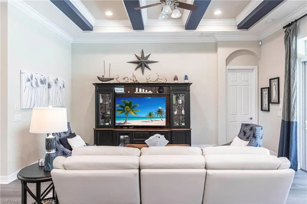 The primary suite is a luxurious retreat, with his-and-her walk-in closets, a spacious en suite bathroom with double vanities, a soaking tub, and a large walk-in shower. The private screened lanai boasts an auto-fill custom pool with an elevated jetted spa. The Anna model also features hurricane impact glass, coffered ceilings, laundry cabinets with a sink, and a brand new washer and dryer. Additional features include an alarm system with cameras, built-in surround sound, upgraded landscaping, and pavers on the driveway and lanai.
