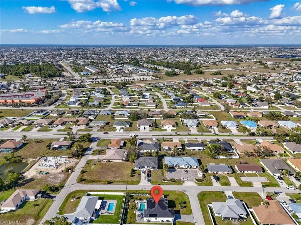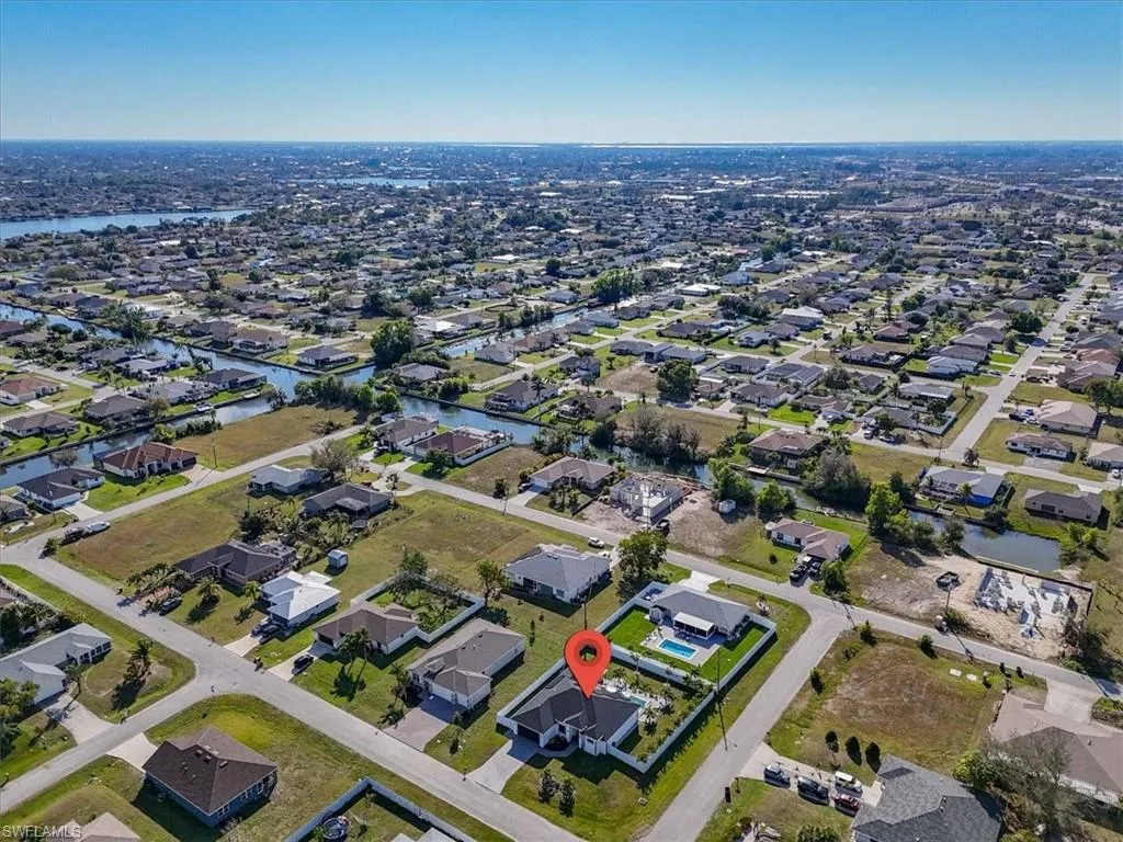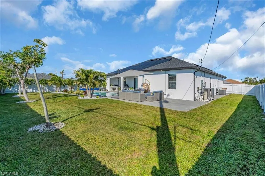 Completed in 2022, this 4-bedroom, 2.5-bath home sits on a double lot in a quiet Cape Coral community near shopping, dining, and entertainment. Located in an X flood zone, no flood insurance is required. The open floor plan features tray ceilings, tile flooring throughout, and a gourmet kitchen with quartz countertops, custom cabinetry, Cafe appliances, under-mount lighting, and a water purifier conveniently located under the kitchen sink. A spacious primary suite includes his-and-her walk-in closets, dual vanities, and a spa-inspired super shower with dual rain shower heads, while three additional bedrooms provide flexibility. Upgrades include 10.4 KW solar panels, new pool heater, Nest thermostat, Ring security system with indoor and outdoor cameras, blackout blinds, enhanced landscaping, and fully paid assessments for water and sewer. The private lanai features a saltwater pool, summer kitchen, and air-conditioned pool bath, complemented by impact-resistant windows and doors, 8-ft interior doors, and an epoxy-finished, air-conditioned garage with an EV charger. Seller is offering a $5,000 concession toward points or closing costs.