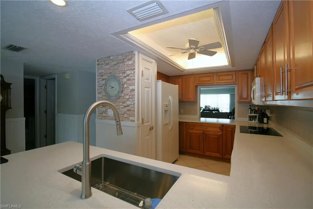 DIRECT GULF ACCESS CONDO/NO BRIDGES! Located on 200 ft. wide intersecting canals with expansive water views. This first floor unit has been beautifully updated featuring an updated kitchen with quartz countertops and tile backsplash, plantation shutters and bead board wainscoting for a coastal vibe. Lots of water views from the spacious greatroom area, with room to accommodate a dining table or extra seating for guests. Flexible space off the kitchen can be used as a breakfast/dining area or home office. Primary Suite has slider doors leading to the screened lanai with a beautiful water view. Both bathrooms feature quartz countertops and stylish tile accents with a large walk-in tub in the guest bath and double sinks in the primary bath. Large laundry room with extra cabinets for storage. Plenty of extra storage space in this unit with a large walk-in closet in the primary suite bathroom. Dock space is assigned by the association. Well funded HOA, they are currently resurfacing the community pool for residents to enjoy.