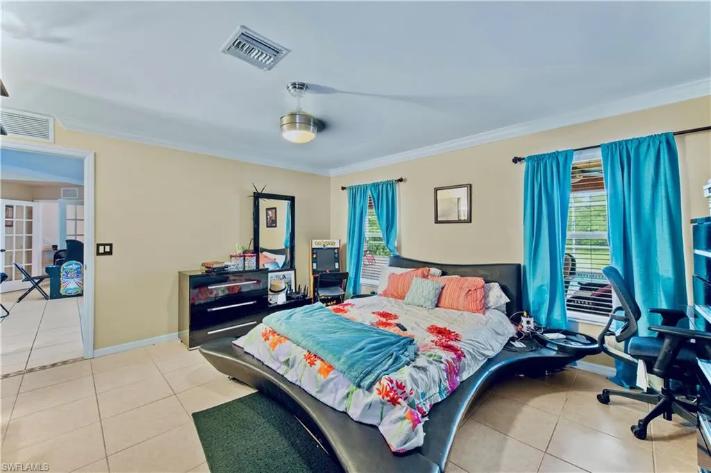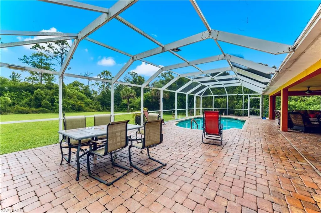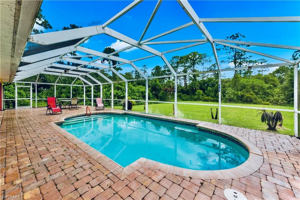 Welcome to this MAGNIFICENTLY REMODELED 3 Bed+Den 2.5 Bath almost 2000 Sq. Ft. HEATED SALT WATER POOL home nestled away on an awarding HALF ACRE! This peaceful property has been professionally landscaped & recently painted while spotlighting an ENORMOUS 31 by 54 ft screen enclosed back patio GREAT for entertaining, dazzling level 4 GRANITE wrapped breakfast bar countertops & backsplash, LUXURIOUS illuminated rope trim cabinets with glass displays, a generous master with a walk in closet, desirable oversized SOAKING tub, an attractive FRAME-LESS glass shower & flattering TILED walls, and an astounding dual Vessel CUSTOM built vanity with FROSTED glass display tower. This rewarding floor plan with GREAT ROOM also highlights IMPACT WINDOWS, a (2020)HVAC system, a whole house R/O system, newer pool pump & electric heater, a (2024) Water heater, whole house generator hookup, and a walk way of pavers around the entire house’s perimeter. It also features GLASS French doors, a Jack & Jill half bath, a High efficiency washer & dryer under air, porcelain tile throughout, and is located on a quiet street just minutes from major amenities & a quick commute to Fort Myers. Schedule your showing today!