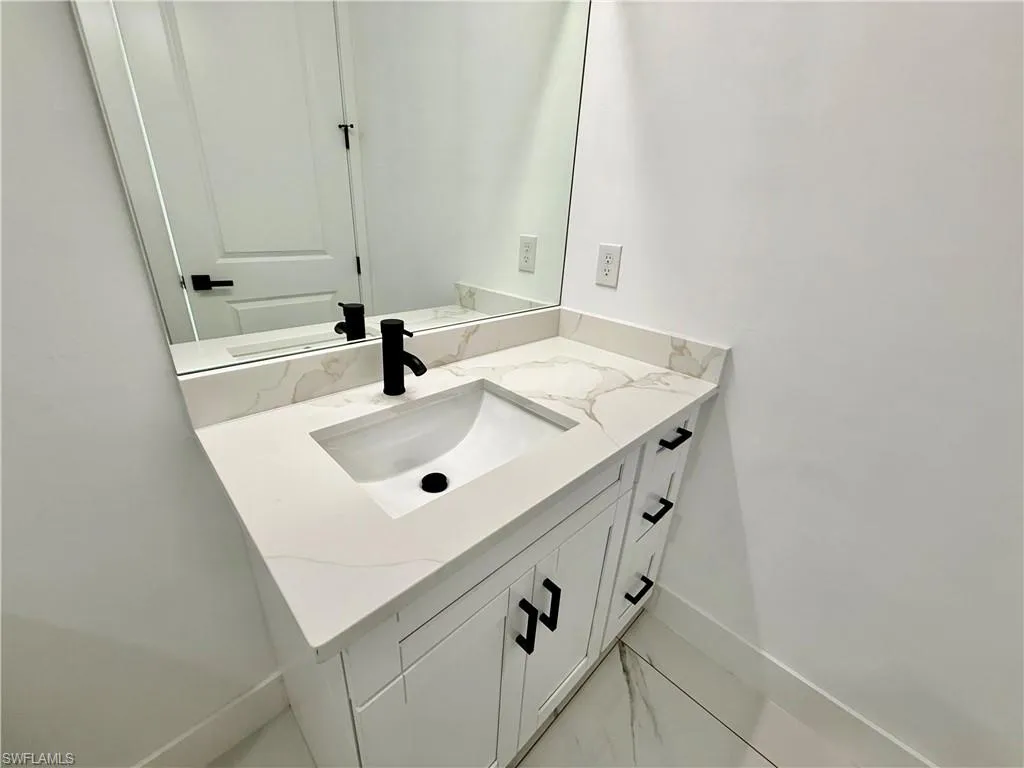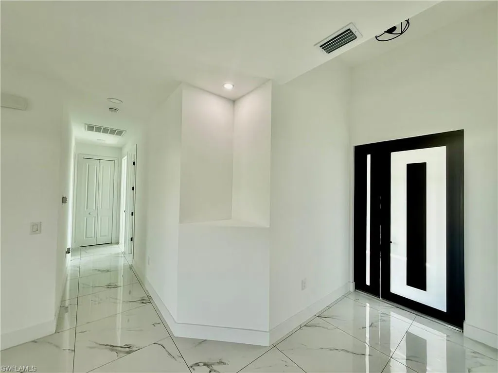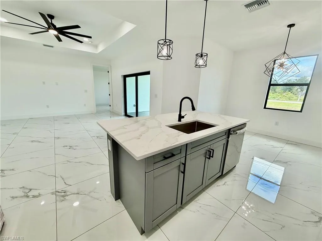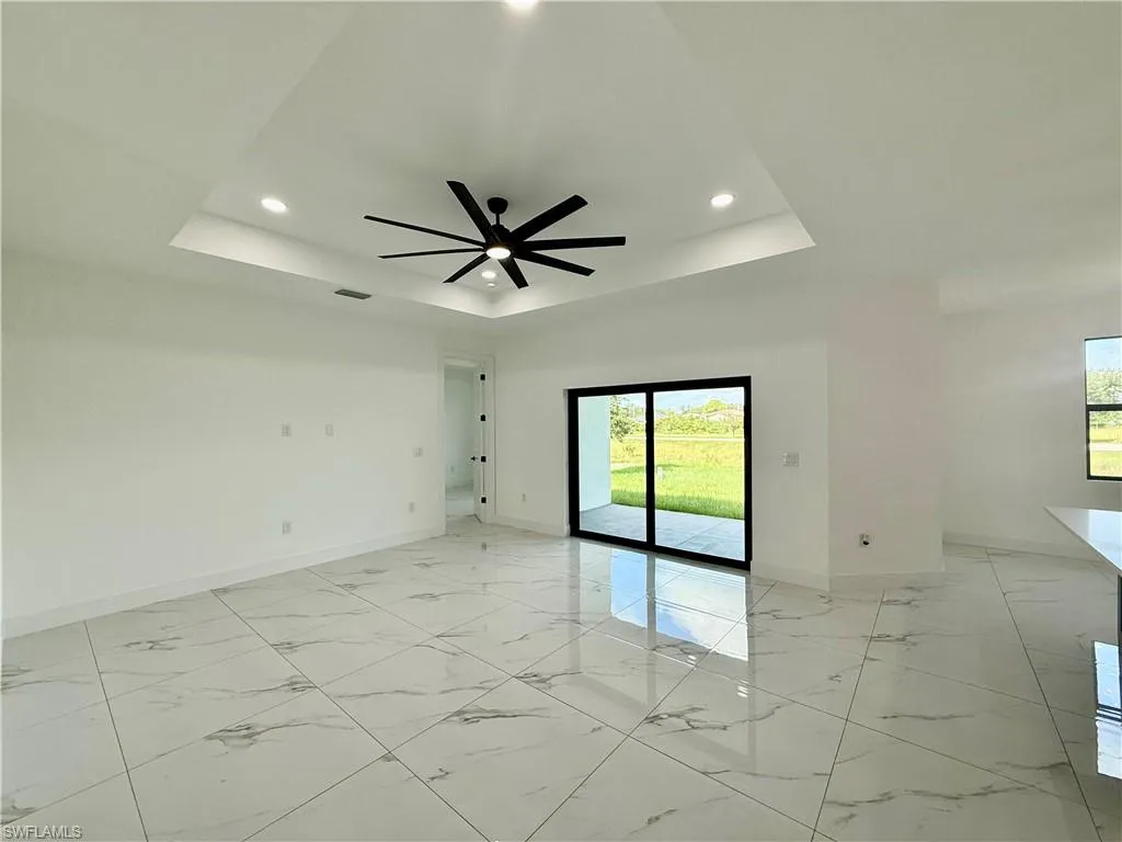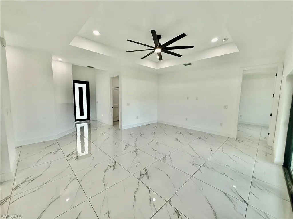 Brand New Home located in Southwest Lehigh, MOVE IN READY 4 BEDROOM 3 FULL BATHROOMS with TWO MASTER SUITES, EXCELLENT FOR IN LAW QUARTERS, C.O. HAS BEEN ISSUED, 32 X 32 POLISHED PORCELAIN TILE FLOORS THROUGHOUT THE ENTIRE HOME with 5 inch baseboards, impact resistant windows and doors, covered front porch leads to large great room, upgraded front door with side light that opens up to make moving in easy, high entry foyer with lighted decorative shelf, high volume ceilings throughout with tray ceilings in the living room and master bedroom, shaker cabinets with soft close doors and drawers, pendant lighting over breakfast bar, QUARTZ TOPS in kitchen and baths, stainless steel appliance package, large dining area with upgraded light fixtures, spacious master bedroom with dual walk in closets, private bath with dual sinks with upgraded light fixtures and built in controls in the mirror, tiled walk in shower with frameless glass doors, 4th bedroom guest quarters off of the kitchen area with it’s own private bathroom, indoor laundry room, covered porch in rear overlooking the backyard, covered front porch as well, double garage with grey seal coated floors, excellent location just minutes to SR 82, I-75, Ft Myers and the International airport. NO FLOOD INSURANCE REQUIRED HERE. LEHIGH IS THE HIGHEST ELEVATION IN LEE COUNTY.