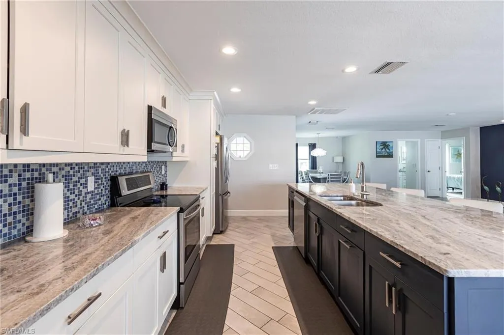 home sits at the end of the quiet street but the beginning of the canal. Kitchen includes white cabinets