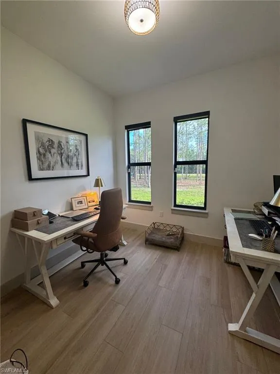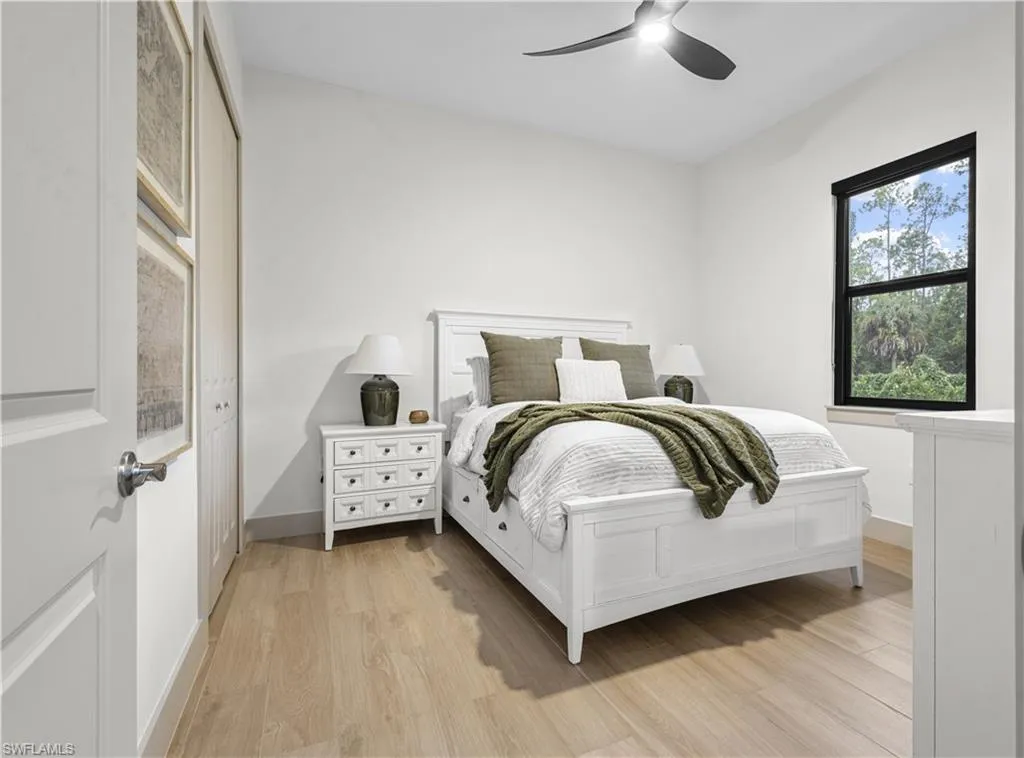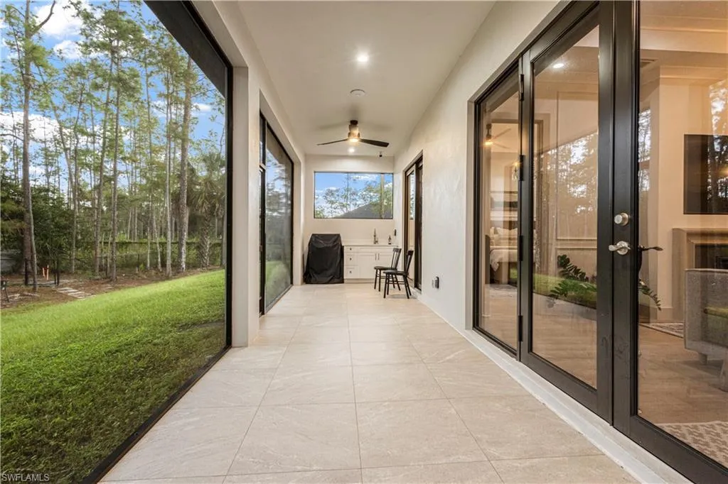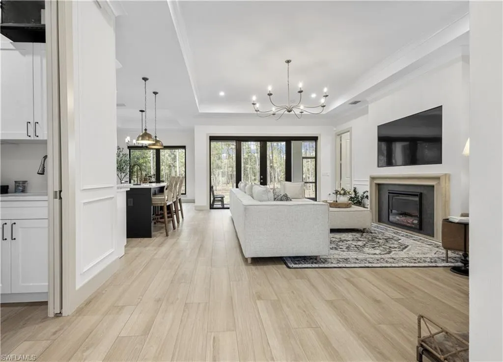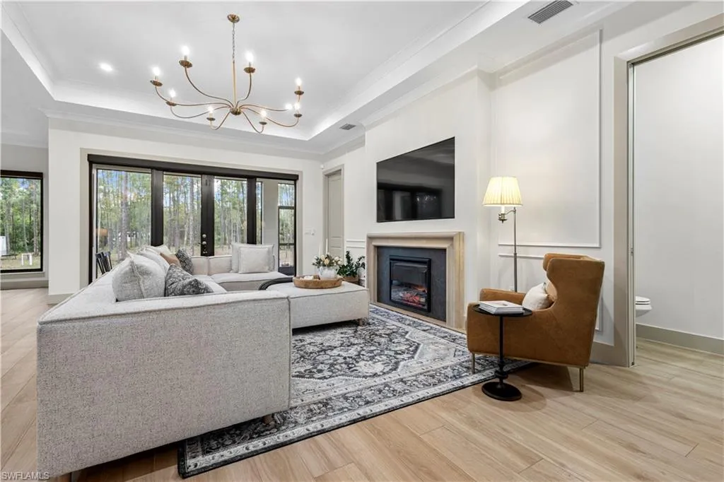 This is a one-of-a-kind home, impeccably designed, with open concept living area. Beautiful 3-bedroom + den/office, 2.5 bath home on 2.5 fully fenced acres in Golden Gates estates, offers stunning wooded views from every angle with a bright open layout. Features include impact doors/windows, osmosis water system, full camera wiring, updated kitchen hood, electric blackout shades throughout, and two electric fireplaces (one with a concrete marble mix mantle). Upscale finishes such as elegant moldings and designer lighting bring warmth and sophistication. Enjoy the fully panoramic screened-in lanai, 2-car garage, and a private road leading to the back of the property, perfect for RVs, boats, work trucks, and more.