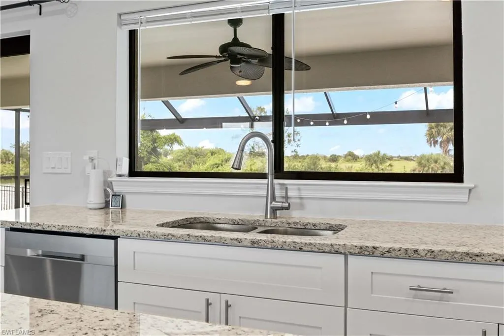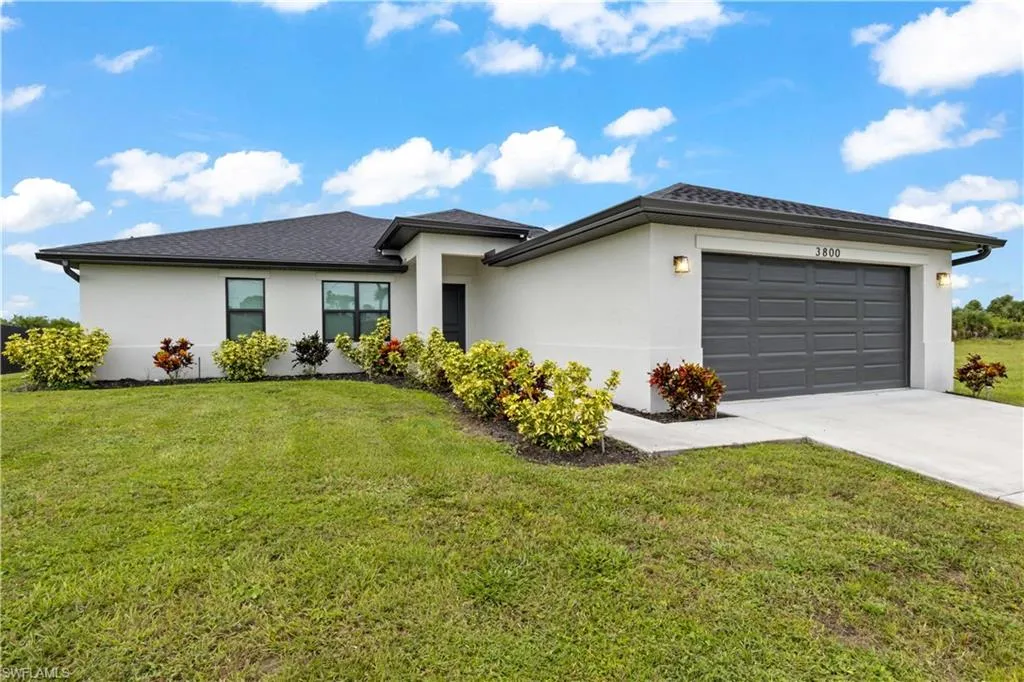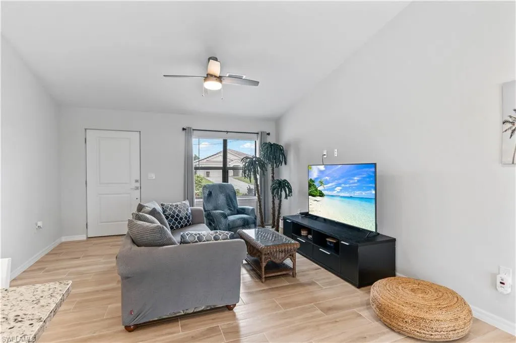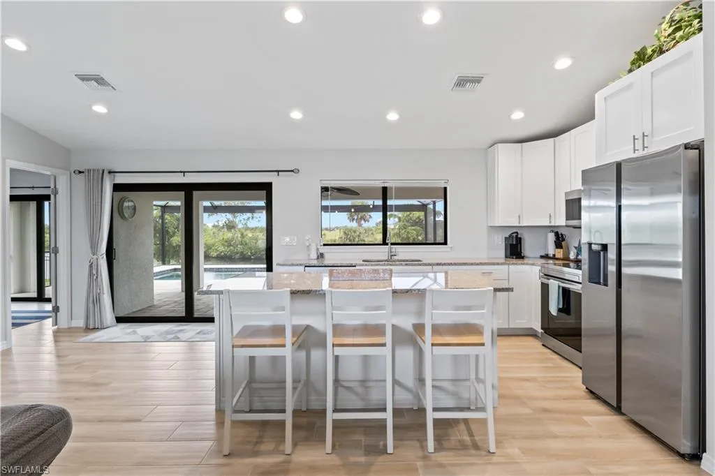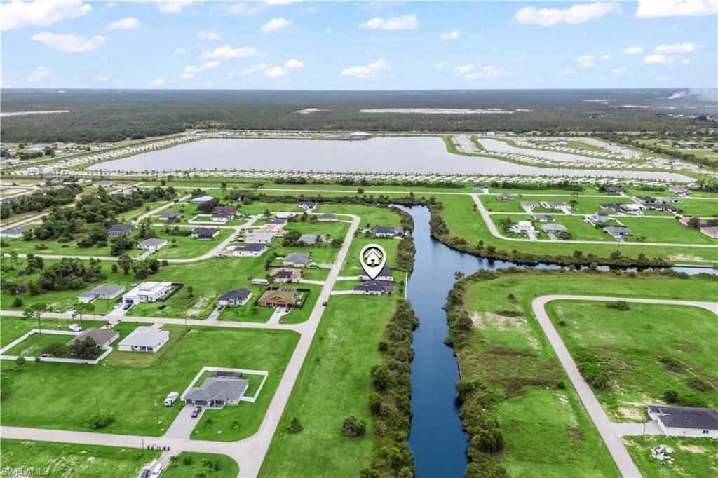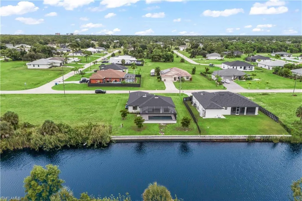 LIKE NEW 2023 WATERFRONT POOL HOME FEATURING SOUTHERN EXPOSURE WITH INTERSECTING CANAL VIEWS. Welcome to your Florida dream home! This nearly new 3-bedroom, 2-bathroom waterfront pool home, built in 2023, is packed with high-end finishes and sits on a premium southern exposure lot with gorgeous intersecting canal views—perfect for year-round sunsets and waterside relaxation.Step inside to an open-concept split-bedroom floor plan with vaulted ceilings and wood-look tile plank flooring throughout ideal for entertaining and everyday living. The designer kitchen features: All-wood white shaker cabinetry, Granite countertops, Stainless steel appliances, Large pantry and breakfast bar The spacious primary suite boasts a frameless glass walk-in shower, a generous walk-in closet, and serene water views. Each bedroom includes its own ceiling fan, and the oversized laundry room offers a utility sink and comes complete with a washer and dryer. Outdoor living shines here, with a covered under-truss lanai, clear-view screen panels, and concrete-backed patio pavers for added stability. Take a dip in the oversized saltwater pool, heated by a powerful 140KW electric heater, and enjoy peaceful days fishing, kayaking, or paddle boarding from your backyard. Additional Features: Hurricane-impact windows, sliders & doors, Security system, Full-yard irrigation system, Oversized lot with intersecting canal frontage, Southern rear exposure for optimal sunlight. Location Perks: Situated just seconds from the Crystal Lake Park which includes a lagoon-style lake with a beach, scuba diving, boat ramps, walking & biking trails, fitness stations, and more. Located in a beautiful, quiet residential neighborhood in NW Cape Coral, surrounded by new construction homes and just minutes to Burnt Store Marina. This is your chance to own a like-new, move-in-ready waterfront pool home in a fast-growing area—before prices rise!