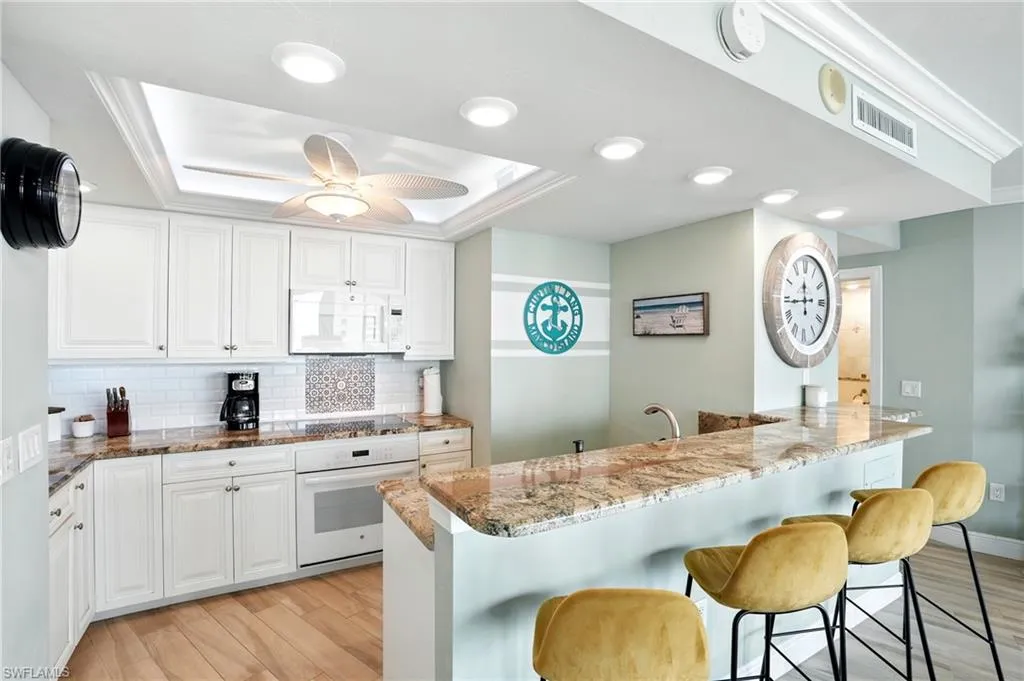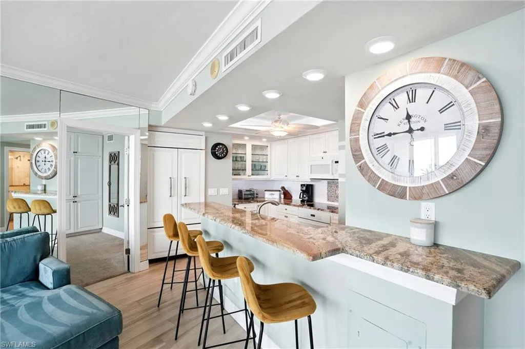 Welcome to this tastefully UPDATED BEACHFRONT Condo at the GULFVIEW APARTMENTS OF MARCO ISLAND which offers the perfect blend of luxury, comfort, and location. Perched on the 8th floor overlooking the Gulf of Mexico, the unit features breathtaking BEACHFRONT VIEWS—from morning tranquility over beautiful blue waters to unforgettable sunsets that paint the sky in vibrant hues each evening. Inside, the condo boasts a coastal design with clean lines, neutral tones, and high-end finishes. The kitchen has been remodeled with custom features including white cabinetry/granite counters, SUB-ZERO refrigerator, WOLF cooktop, CONVECTION oven, and FARMERS sink, open to views and a spacious living area. This open-concept living space flows effortlessly onto a private balcony, your front-row seat to the beach! The primary suite offers direct Gulf views, a custom built-in closet/wardrobe with drawers, and hidden TV cabinet to maximize storage. In the ensuite bath you can appreciate the soaking tub for a spa like experience, or the walk-in shower. For added space, the guest bedroom has been redesigned as 2 rooms to include a den or office with pocketing tempered glass doors, overlooking the gulf. Newer plumbing, electricals, doors and more! Impact-resistant windows complete the stylish, low-maintenance interior. PARKING GARAGE with assigned space and storage closet. If enjoy pickleball or tennis, it’s all here! Located in one of Marco Island’s most sought-after beach-front communities, adjacent to RESIDENTS’ BEACH, you’re just steps from the sand and a short walk to popular restaurants, boutique shops, and lively cafés. Whether you’re looking for a peaceful retreat or a vibrant coastal lifestyle, this pet-friendly building delivers the best of both worlds. Perfect for year-round living, a vacation getaway, or a high-demand rental opportunity. Come see what makes this condo different from all the others!