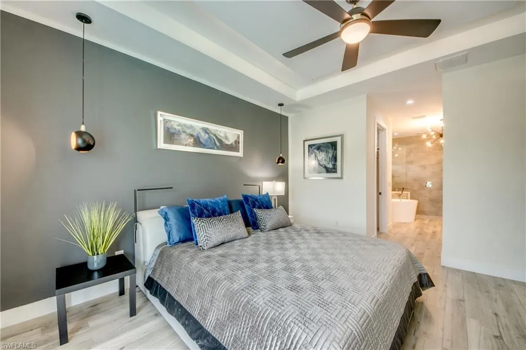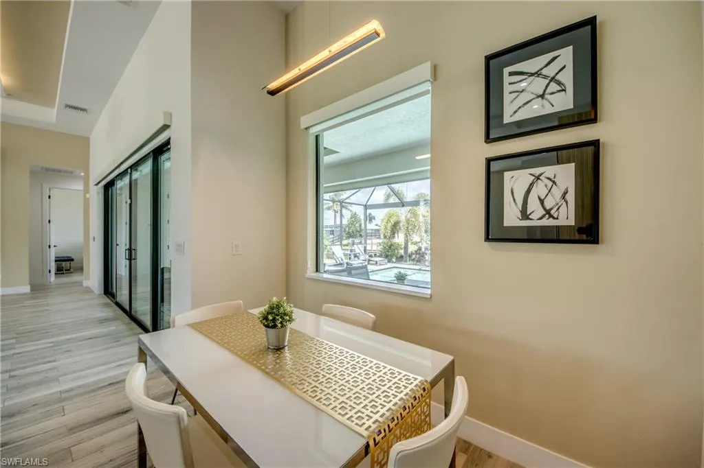 If you have been looking for a newer construction Single Family Home with an elegant European flair and a distinctive sophisticated style, this is the ONE you have been waiting for! A luxurious blend of thoughtfully designed spaces, upgraded interior features, open floor plan concept and the ultimate outdoor space complete your Florida lifestyle! The heart of the home is the great room that offers impressive 12 ft. trey ceilings with accent lighting, 9 ft. sliding glass doors to the lanai, wood look plank tile flooring and an electric wall-mounted fireplace. Gather in the kitchen with the massive island with breakfast bar, waterfall quartz countertops, slate finished Stainless Steel Appliances and the modern, high gloss, European style cabinetry. The Owner’s suite feels like a retreat with an extra large bedroom providing access to the lanai area, dual walk-in closet and the most spectacular bathroom around. The space includes a zero edge (curbless) walk in shower with multiple shower heads, deep soaking tub, double sinks, private toilet closet and linen closet. Don’t overlook the outdoor space that includes an outdoor kitchen with wine cooler, oversized heated pool, outdoor shower and space to entertain. For your piece of mind, the yard has a black chain linked fence for you furry friends, electric hurricane roll down shutter for the lanai and whole house impact windows and sliders. Plus a dock with lift that is a perfect location to park your boat. Come see what sets this house apart from all of the rest!