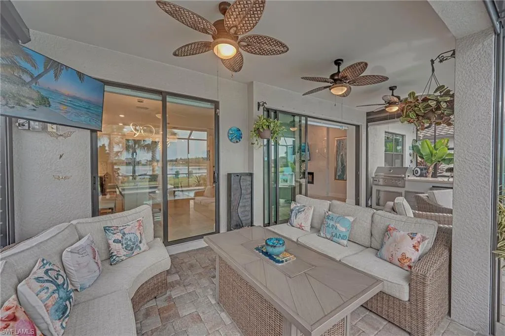 The OPEN-CONCEPT design includes CROWN MOLDING, 8-FOOT DOORS and a three-panel pocketing slider that disappears into the wall for SEAMLESS INDOOR-OUTDOOR LIVING. A custom ELECTRIC FIREPLACE creates a stylish focal point in the living room. The MODERN KITCHEN showcases a 9.5-FT QUARTZ ISLAND, custom walk-in pantry, Samsung B-Spoke Series SMART APPLIANCES, Wi-Fi CABINET LIGHTING, and upgraded faucets. A renovated laundry room (2024) features quartz counters, custom cabinetry, and SAMSUNG SMART WASHER AND DRYER. The FIRST-FLOOR PRIMARY SUITE offers serene lake and pool views, DUAL VANITIES, a walk-in shower, and a generous closet. All bathrooms are upgraded with built-in bidets, and an UPSTAIRS GUEST SUITE includes its own private bath. EVERY bedroom offers a walk-in closet. The outdoor living area is designed for entertaining with a SALTWATER HEATED POOL AND SPA, Paradise Grill OUTDOOR KITCHEN, EXTENDED COVERED LANAI with Wi-Fi lighting, STORM SMART HURRICANE SHADES, and SUPER SCREEN lanai enclosure.