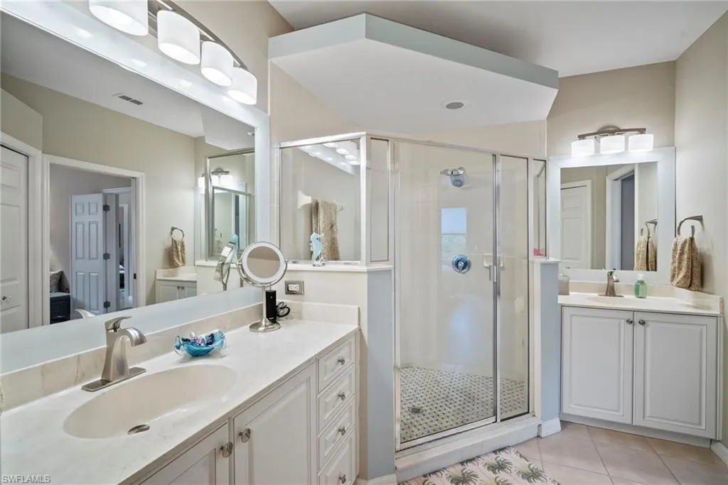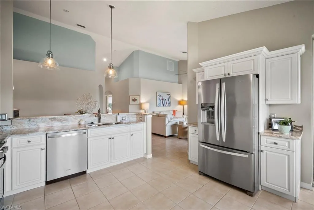 Step inside to find bright, open living areas, high ceilings, and stylish designer furnishings that complement the home’s elegant finishes. The screened lanai overlooks the 7th fairway and a lake — an inviting spot for morning coffee or sunset gatherings.