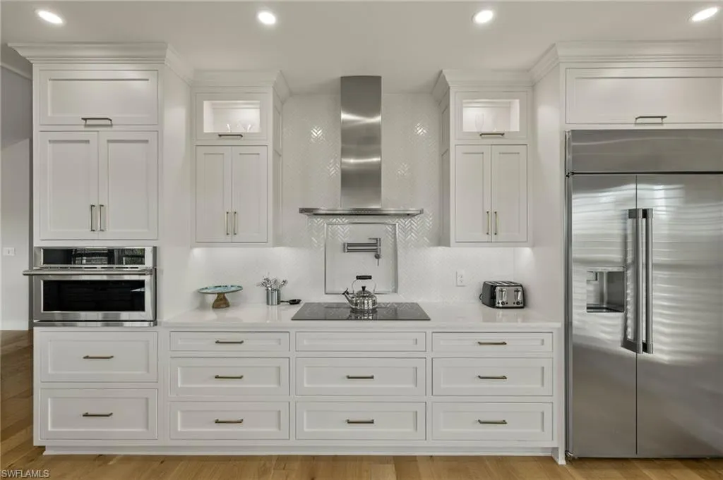 Welcome to 4460 Yacht Harbor Drive in desirable Windward Cay enclave in Windstar on Naples Bay. If you are considering Gulf Shore Boulevard, Moorings or Park Shore condo living Windstar offers the waterfront lifestyle while being set back and protected from the bay for true peace of mind. This stunningly redesigned and fully renovated corner end-unit penthouse unit is located in a boutique 6-unit elevator building with only 2 units per floor and features 2 Bedrooms and 2 Baths in almost 2200 square feet of truly luxurious living space. Enter into a welcoming foyer to a truly fabulous open-concept living space with a contemporary light and airy vibe with soaring vaulted ceilings and stunning natural views all around. Spacious living room with walls of glass boasting unparalleled Audubon Society-certified views overlooking the serene 8th fairway, lake and tropical mangroves. A true chef’s eat-in kitchen replete with custom shaker cabinetry, GE Monogram stainless steel appliances, pot filler, contemporary quartz countertops, open shelving with lighting, breakfast bar and custom built-in Brazilian walnut dining table ideal for daily dining and entertaining. Custom built-in office nook ideal for today’s work from home lifestyle. Convenient laundry room with side by side washer/dryer, custom built-in cabinetry and counter affording great storage. Master suite oasis features spacious bedroom, access to lanai, dual walk-in closets with California custom built-ins and a spa-like master bath with a gorgeous oversized walk-in shower with dual rain heads, contemporary floating double vanity and freestanding soaking tub. Large guest bedroom with a gorgeous view plus a lovely full hall bathroom. Oversized covered parking for 2 vehicles and electrical outlet for your golf cart. No expense spared in this truly custom renovation with the finest of materials and craftsmanship a rarity to find this level of high-design and finish in a condo in Windstar. Windstar on Naples Bay is the only gated golf community with Tom Fazio designed 18-hole golf course that offers direct bay access, a private beach plus dock on Keewaydin Island with seasonal October-July boat shuttle included in your Windstar HOA plus a full service 73-slip deep water marina. Newly renovated clubhouse (separate membership) with multiple dining areas with stunning views of Naples Bay and Port Royal, billiards room, 6 Har-Tru tennis courts, 3 bocce courts and a state of the art fitness center slated for 2026 completion. Preferred location just a short 2 mile drive via car, bike or golf cart to downtown’s 5th Avenue South and 3rd Street South known worldwide for its fine dining, shopping and beaches. Situated in the vibrant Bayshore Arts District, Windstar is walkable to Naples Botanical Garden and Naples Pickleball Center home of the pickleball US Open. Easy access to I-75, Naples and Fort Myers airports.