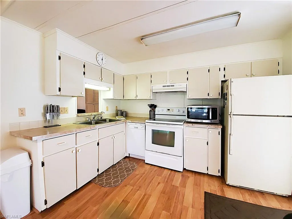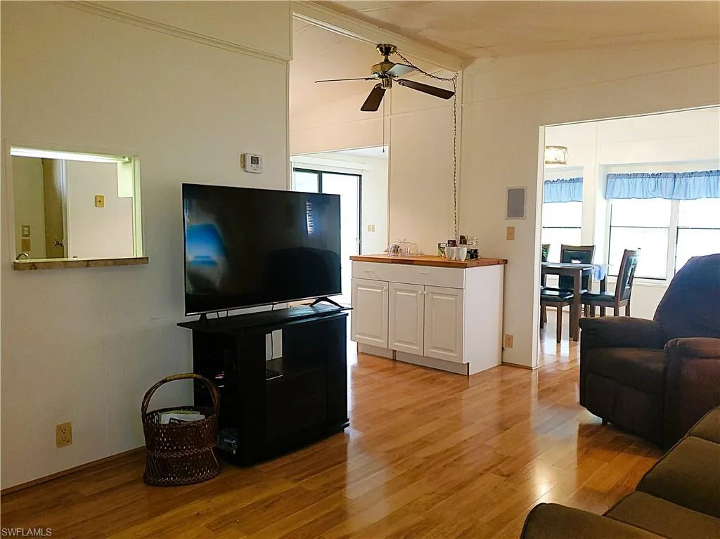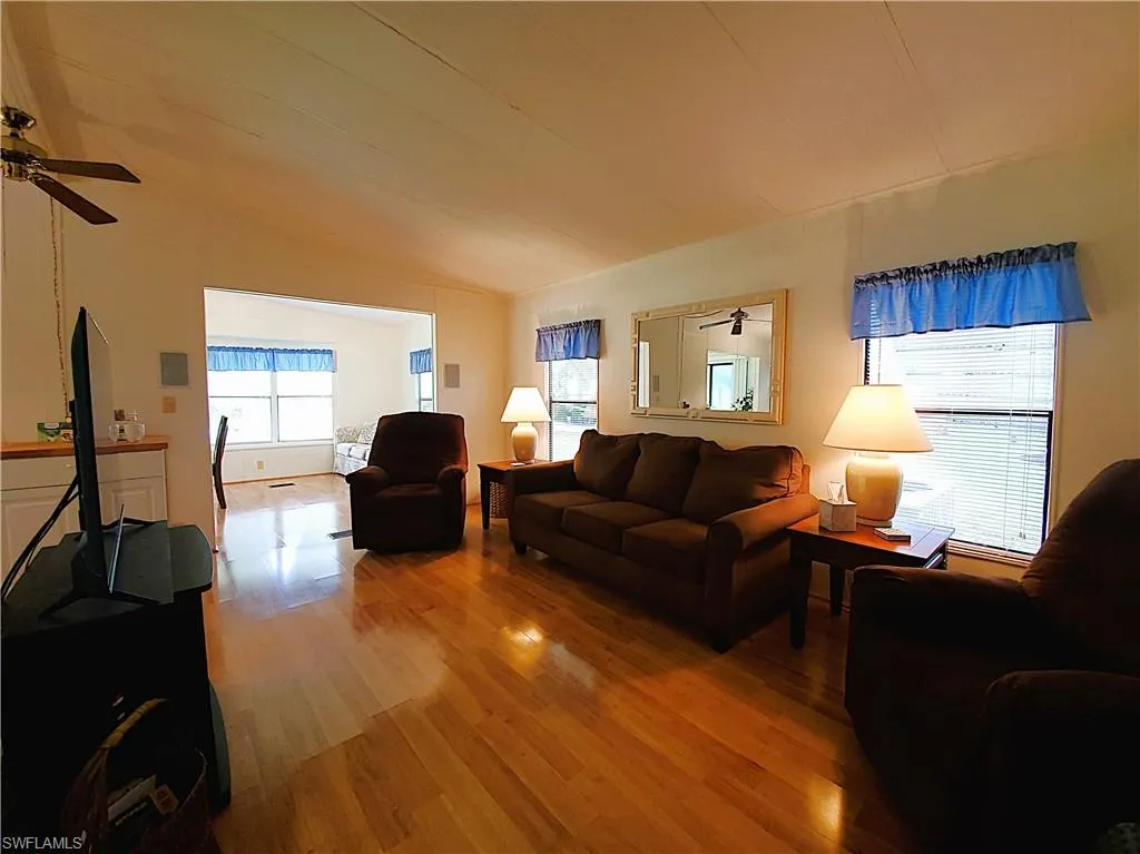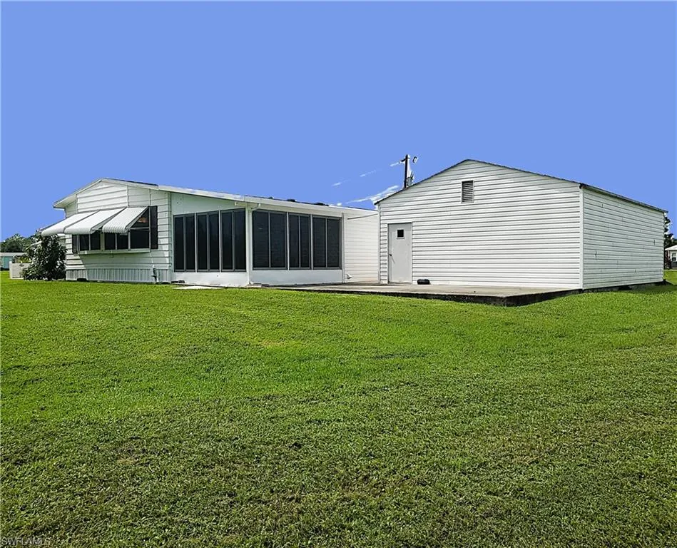 Lake Fairways Country Club, a highly desirable gated Golf Community in North Fort Myers. Active 55+ community offering a full calendar of events, plus an 18 hole executive golf course (no membership required), a putting green, pro-shop, tennis/pickle ball, bocci ball, shuffleboard, community pool and spa overlooking the lake, exercise room, game and crafts rooms, library, boat/RV storage, clubhouse with spacious banquet room, full kitchen and onsite restaurant, The Sandtrap. Enjoy all of this with an extremely low fee of $200/annual. This 2 bedroom, 2 bath home is located in the Estate section of the community, where you own the land. Situated on a spacious lot on a quiet cul de sac overlooking the 7th hole. Open eat in kitchen with buffet and coffee bar leads to a large dining/family room with bay windows overlooking the back yard and golf course. Hardwood floors throughout the main areas. Separate living room takes you to the primary and guest bedroom and baths. New storm rated glass enclosed lanai with views of the backyard. Full laundry room with storage conveniently located just off the entry of the home. A unique feature to this property is the additional 20’x30’ detached garage added in 2010, fully sided to match the home. Perfect for multiple cars, golf cart, and lots of extra storage. Roof and AC new in 2023. No flood insurance required. Easy access to shopping, dining and a short ride to Downtown Fort Myers. Fantastic opportunity to become a part of the Lake Fairways Community.