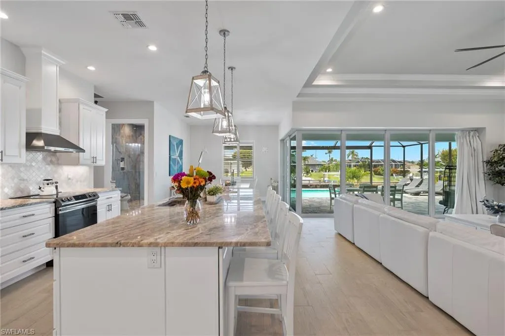 From the moment you arrive, curb appeal is undeniable: a wide paver driveway, tropical landscaping, swaying palms, and a stately coastal-modern façade welcome you home. Step inside and you’re greeted by soaring tray ceilings, plank tile flooring throughout, and zero-corner sliders that disappear to create seamless indoor-outdoor living. Natural light fills the open-concept layout, while designer finishes and custom touches showcase both elegance and functionality.