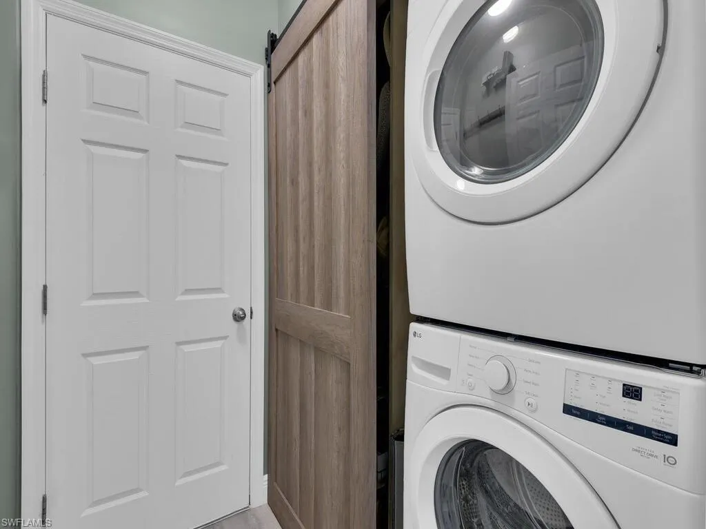 Additional features include an updated laundry room with full-size stackable washer and dryer (2024), extra storage, and a barn door. Durable luxury vinyl plank flooring flows through the living areas, kitchen, entry, and laundry, while tile enhances the bedrooms and bathrooms. A whole-house water filtration system ensures clean, refreshing water throughout.