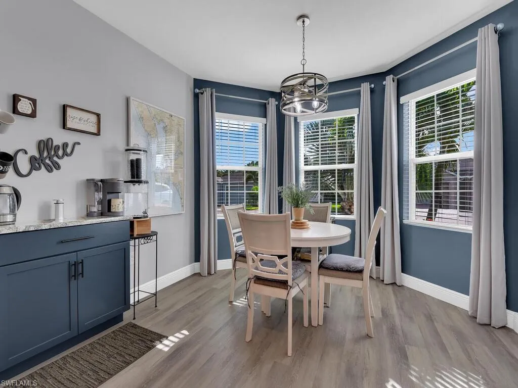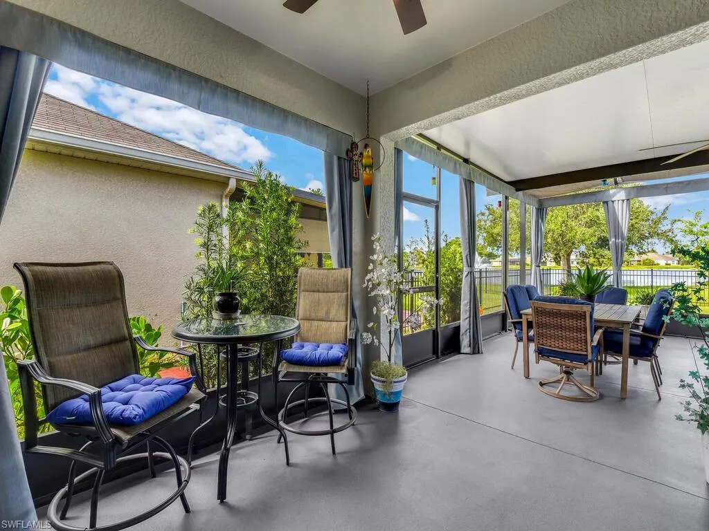Enjoy serene lakefront living in this beautifully maintained single-family home, featuring an expansive extended lanai with Sunbelt curtains for privacy and sun protection. Inside, the spacious eat-in kitchen is designed for both style and function, with dual-color shaker cabinets, granite countertops, custom pull-out drawers, a coffee station, and stainless steel appliances—including a new refrigerator installed in 2024—plus abundant counter space for cooking and entertaining.