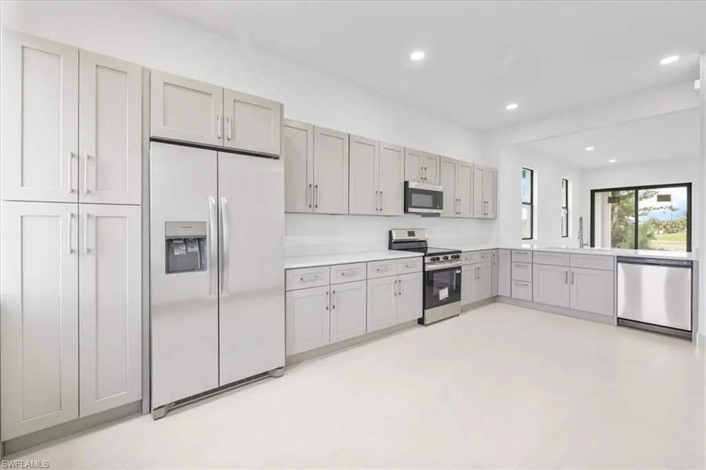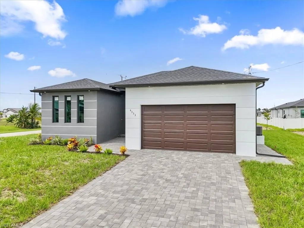 Seller to contribute $10K towards buyers closing cost!. This BRAND-NEW contemporary home boasts a bright and open Great Room floor plan, perfect for modern living. Situated on a corner lot near Burnt Store Road—just across from Gulf-Access canals—it is built on an elevated STEM WALL foundation that meets FEMA codes and features IMPACT-RESISTANT doors and windows for storm protection and energy efficiency. The spacious kitchen includes quartz-style countertops, gray cabinets, stainless steel appliances, and a pantry. High 10’ ceilings and 8’ doors throughout amplify the home’s open, airy ambiance. The master suite offers a generous walk-in closet with built-ins and a sleek oversized walk-in shower with double vanities. Secondary bedrooms include custom closets and flexible space for a desk or vanity. A fully equipped laundry room with cabinets and included washer and dryer, plus an epoxy-coated double garage with an IMPACT-RESISTANT side door, add convenience. Outdoors, enjoy a cozy lanai, a stylish paver driveway, and a large corner yard ideal for a future pool. Conveniently located near Burnt Store Boat Ramp, Crystal Lake Park, Sirenia Park, Joe Stonis Park, residents can enjoy playgrounds, pickleball, basketball courts, walking trails, fishing areas and more! Easy access to I-75 and US-41
