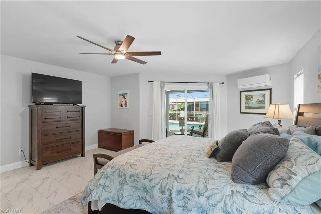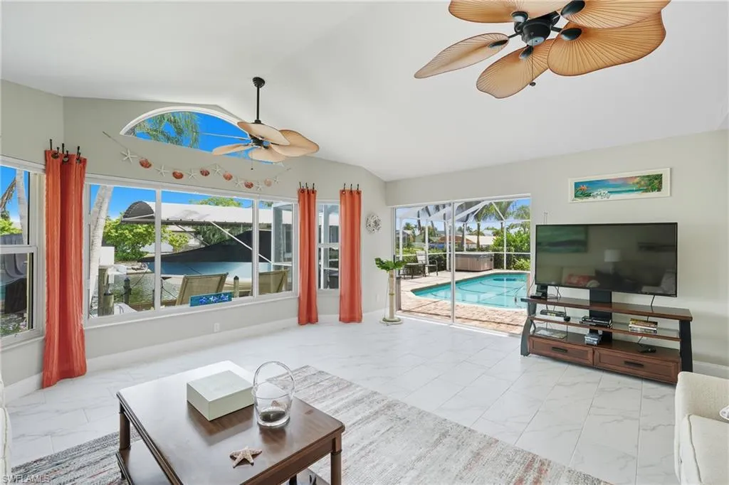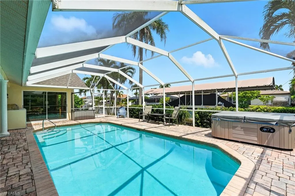 Beautifully updated 4-bedroom, 2.5-bath pool home with 2022 roof and 2024 A/C. No bridges to the Gulf and only 20 minutes to open water. Inside, an open floor plan features vaulted ceilings, a spacious living and dining area, breakfast room, and great room with sliding doors that open to the screened lanai. The kitchen offers granite countertops, stainless steel appliances, wine cooler, and breakfast bar. The split layout provides a private en suite master with direct lanai access and a bath with dual sinks. Three guest bedrooms complete the interior. Enjoy outdoor living with a heated in-ground pool, above-ground spa, built-in outdoor kitchen with gas grill, and a large covered seating area with ceiling fans. A patio, composite dock and boat lift lead directly to the canal. Located in the desirable Pelican neighborhood on a gorgeous Palm Tree lined street, this beautiful South Cape Coral home is nestled between Cape Harbor and the Westin Resort/Tarpon Point all with lots of restaurants, shopping, and just minutes to the river.