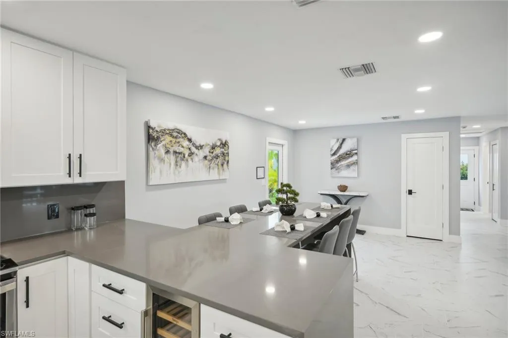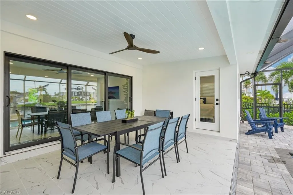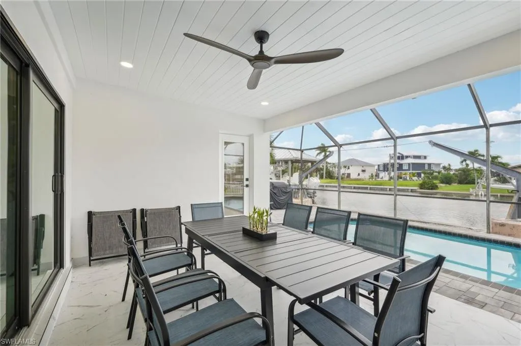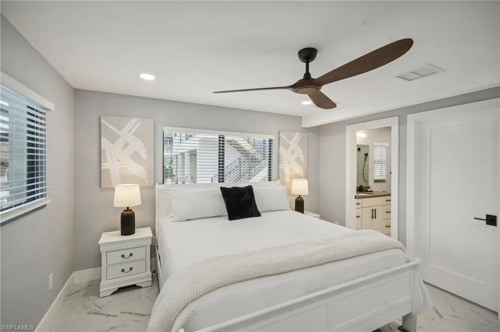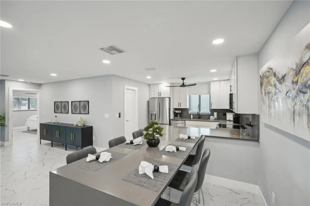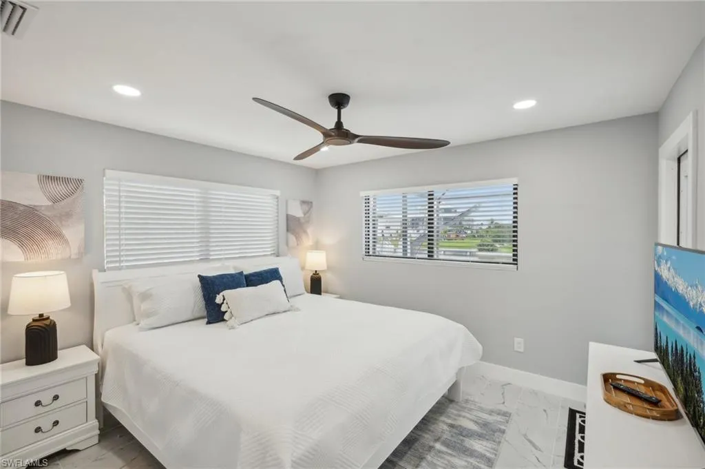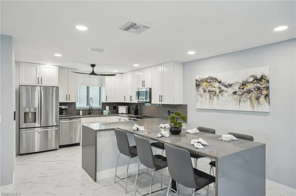 PRICED TO SELL! Stunning 3 bedroom 2 bath waterfront pool home ready for immediate occupancy or rental income. Modern elegance best describes this contemporary Ft Myers Beach home. This fully permitted remodel boasts all new electric, plumbing, impact doors and windows and so much more. The custom kitchen features shaker cabinetry, stainless steel appliances and a gorgeous, oversized quartz dining area great for entertaining. With the desired split floor plan, open concept and beautiful marble tile throughout the home, there is