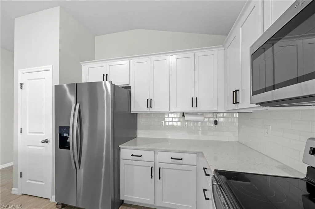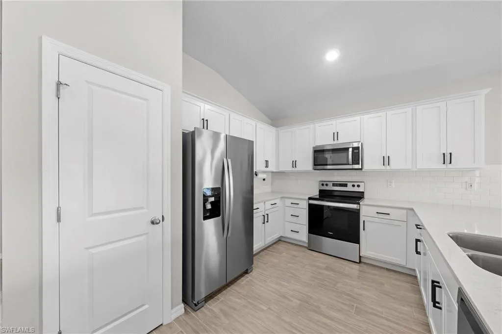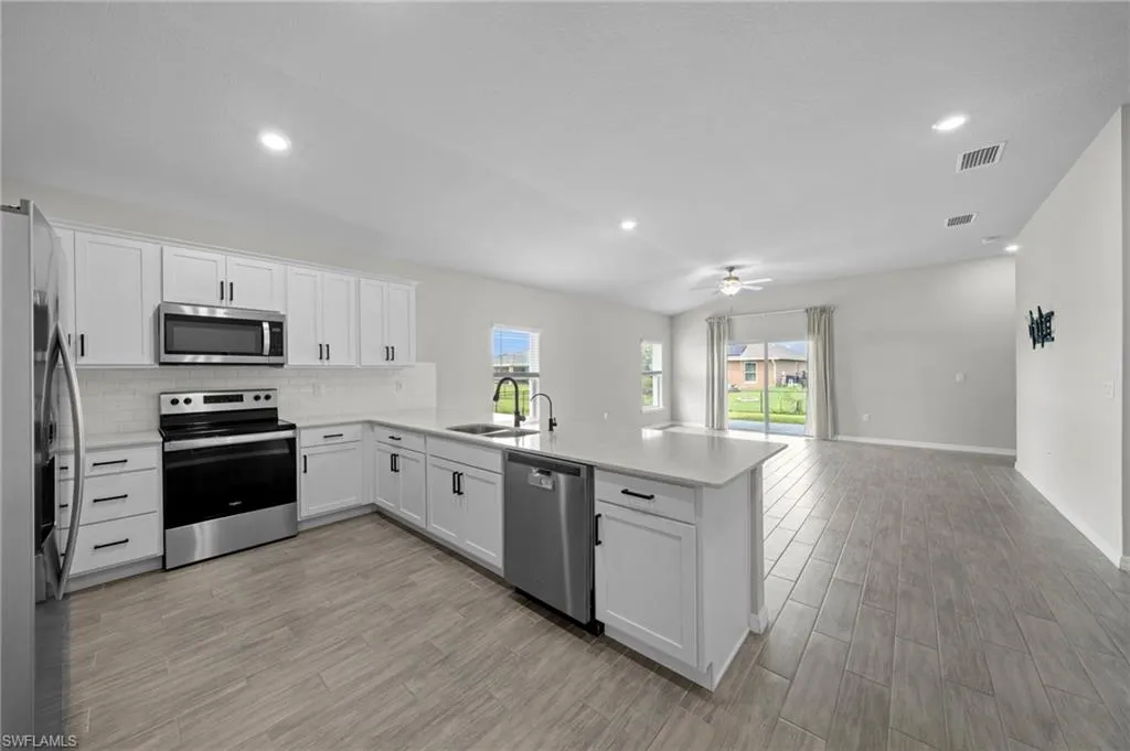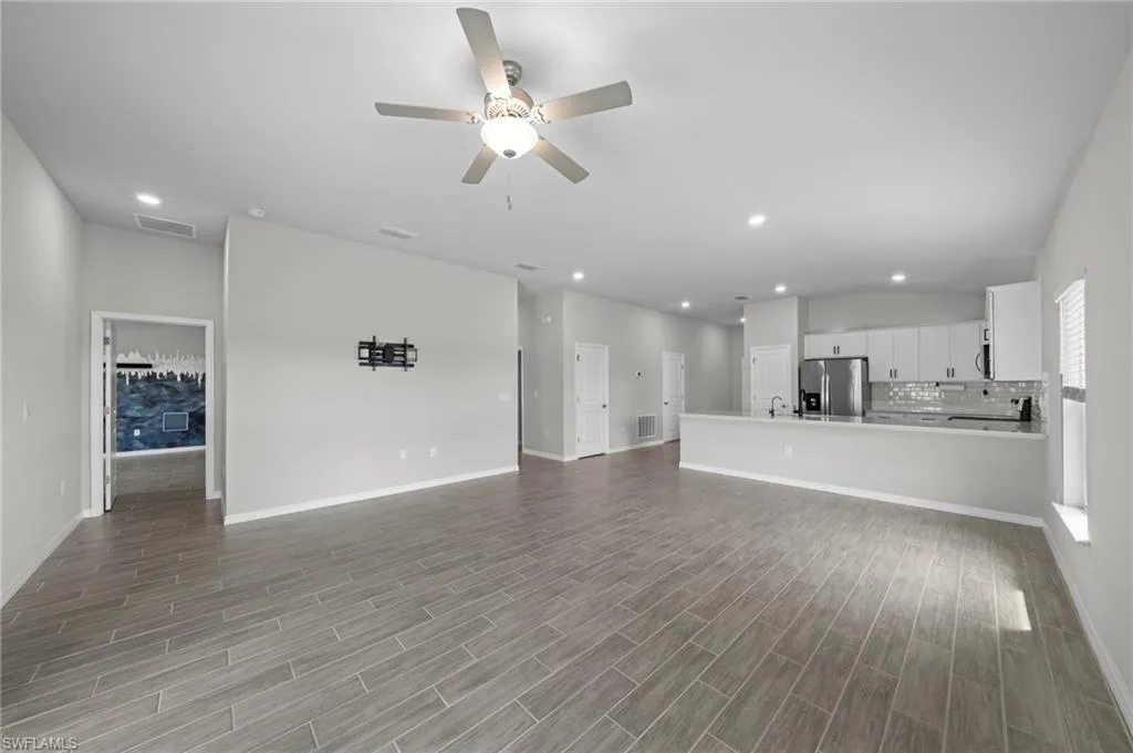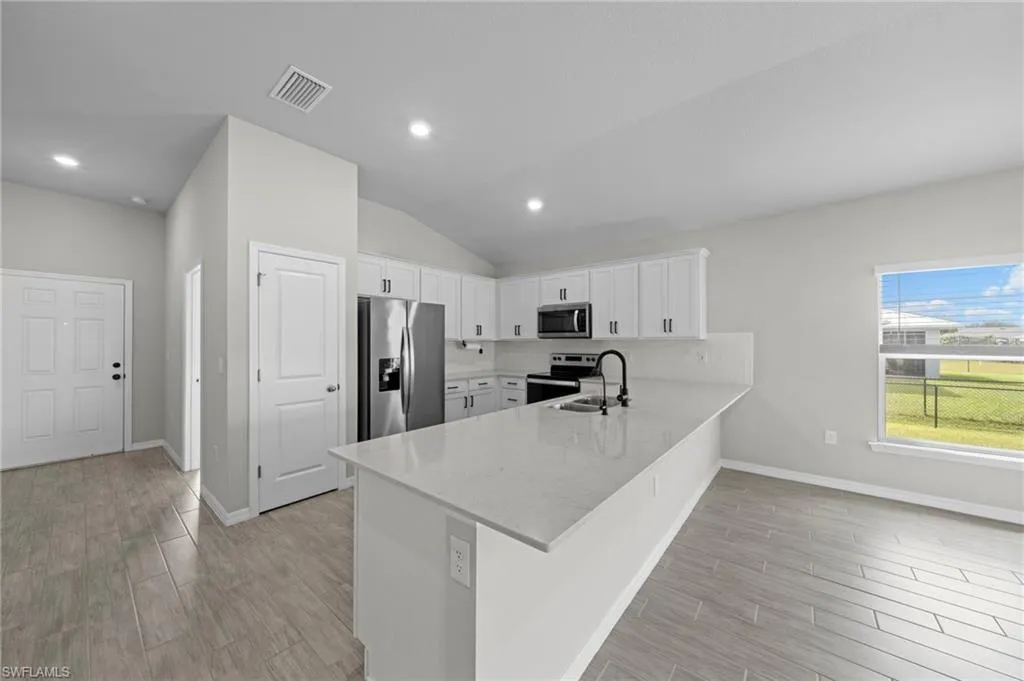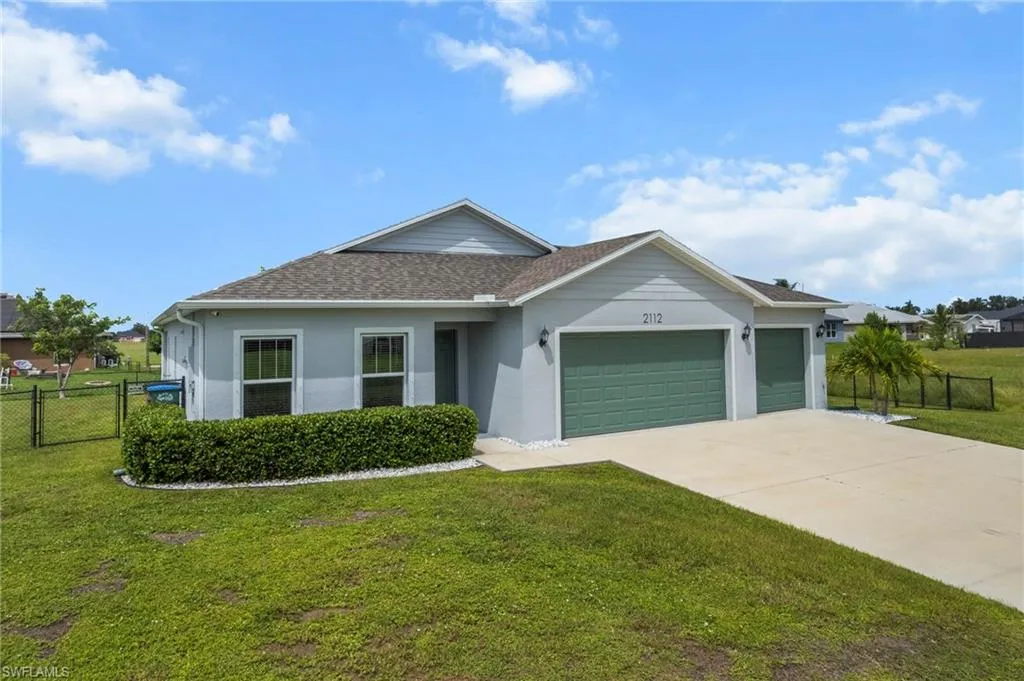 2022-built FGBC Green Certified home on a triple lot! Featuring 4 bedrooms, 2 bathrooms, and 3 car garage. There’s room for everyone, or you can easily use a bedroom as a home office, playroom, or guest suite. The fenced-in oversized lot with gates is ideal for boat storage, a future pool, or transforming the large yard into your outdoor oasis! At the heart of the home is the kitchen featuring upgraded 36” painted cabinets, elegant quartz countertops, and stainless-steel appliances. The expansive counter space and bar top seating for up to 4-5 people! The kitchen flows seamlessly into the great room, where soaring 10-foot ceilings and abundant natural light create an inviting atmosphere. The master suite serves as a private retreat with a spacious walk-in closet and a luxurious master bathroom complete with a walk-in shower and dual vanities. Wood-look ceramic plank flooring. Tile throughout – No Carpet! Step outside to a covered lanai overlooking the oversized, fully fenced backyard with dual entry gates for easy access and added convenience. This private outdoor space is perfect for relaxing, entertaining, or planning your future pool. Premium upgrades include a whole-house water filtration system, a generator transfer switch (great for when there is a power outage!), hurricane-rated screens and fabric panels, rain gutters, an irrigation system, and a utility room with extra storage and laundry space. The 3 garage offers plenty of room for vehicles, boats, or storage. With all the upgrades included, this home is in like-new condition but a much better value – think of the tens of thousands you would have to spend to get all that comes with this house! Located in one of Cape Coral’s fastest-growing areas, this home is minutes from exciting future developments. The upcoming Cape Coral Grove, a 131-acre mixed-use town center, will feature upscale retail, dining, hotels, public parks, and community events projected to generate over $1.3 billion in economic impact. The anticipated Seven Islands Project will bring restaurants, boutique shops, marinas, green spaces, and possibly even a beach area, creating a premier waterfront destination. Also The Cove at 47th, the Bimini Basin Project, and Slipaway Marina, offering waterfront dining, boutique shopping, boat slips, nightlife, and entertainment. The reimagined Cape Coral Yacht Club. This location also provides quick access to shopping, dining, top-rated schools, and parks. A quick drive takes you to Fort Myers, pristine beaches, and Golfers will be near Palmetto Pines Country Club & Coral Oaks Golf Course.