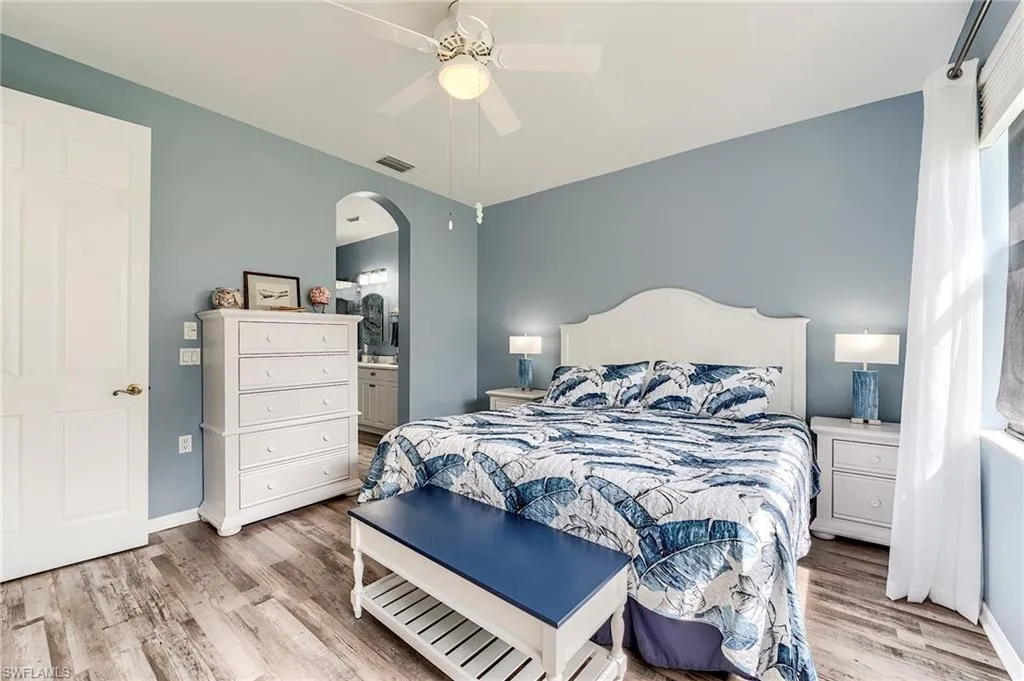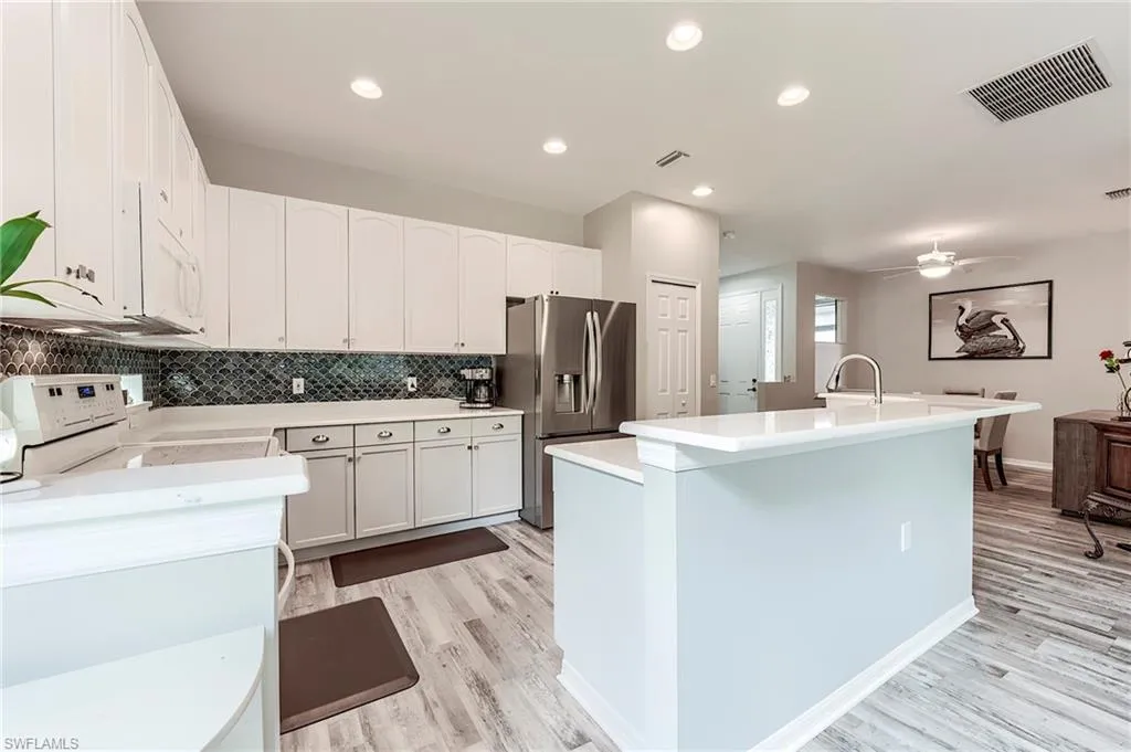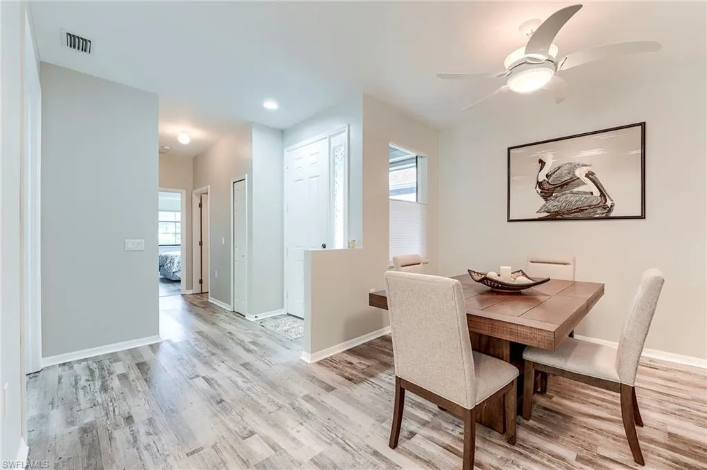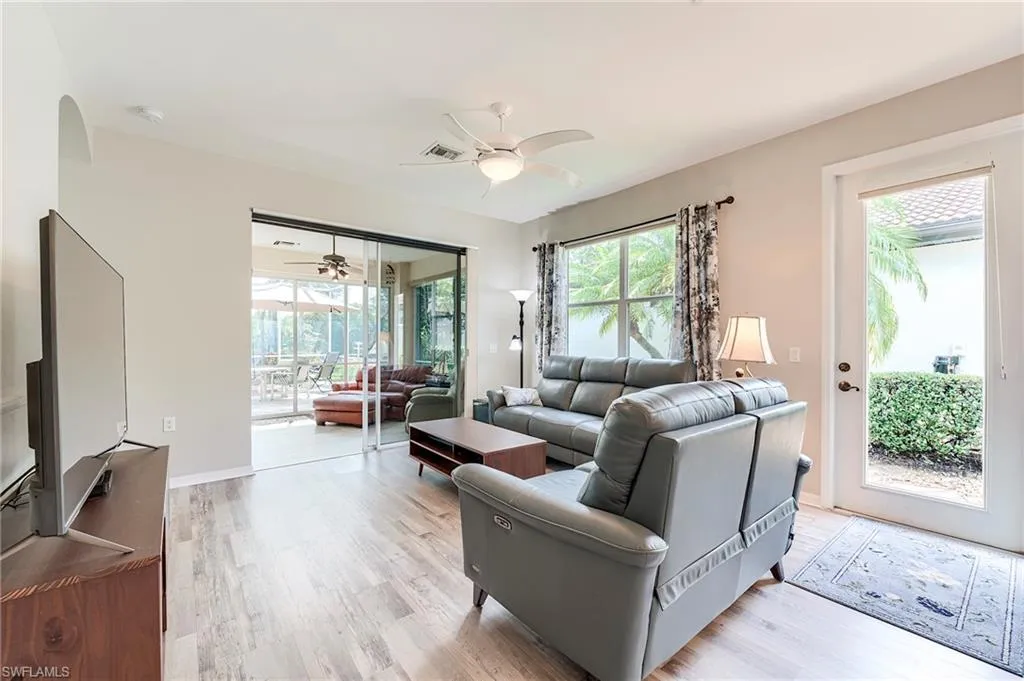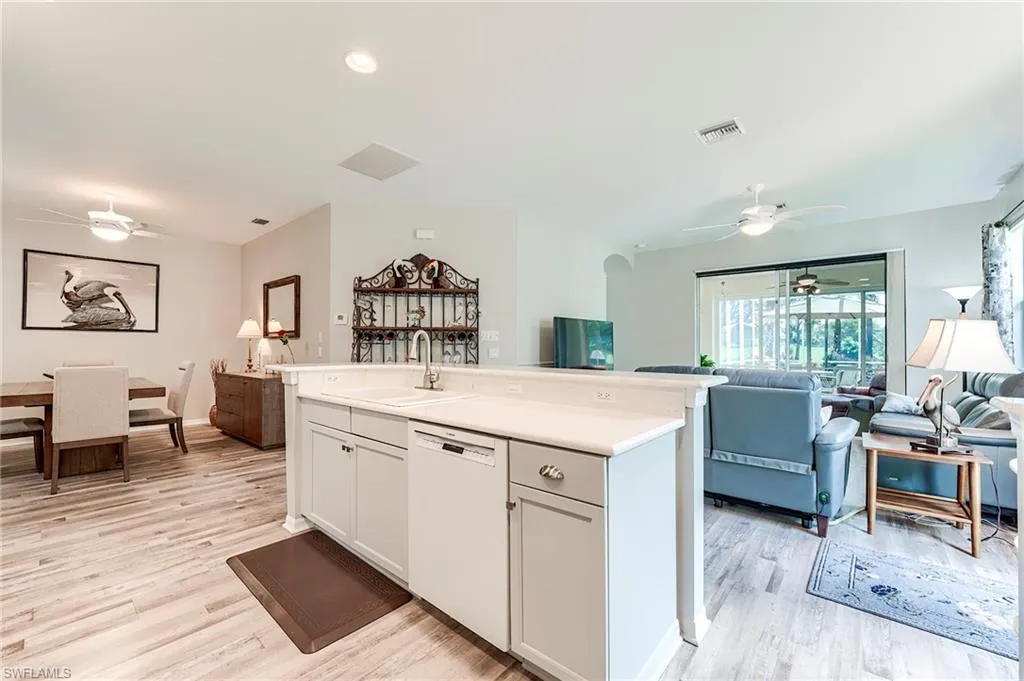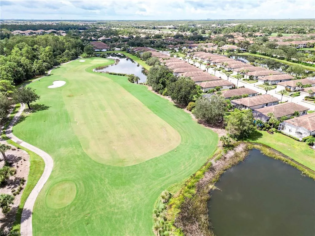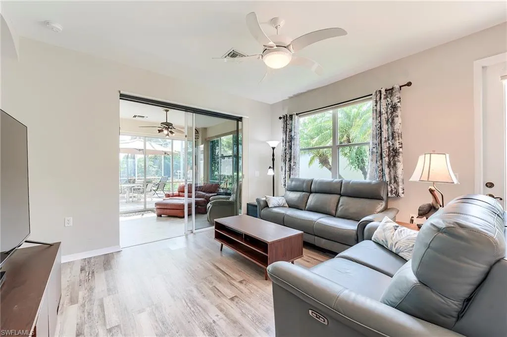 Welcome to this WCI-built Picasso model home in the Avila community of Pelican Preserve, a “walls-in only” insurance community where the HOA handles all exterior maintenance. The HOA/Condo replaced the roof, gutters, downspouts, and painted the exterior in 2021. Pelican Preserve is a nationally recognized active lifestyle 55+ gated master-planned community. This single-family home overlooks the #2 Heron Hole on the membership optional 27-hole golf course. Featuring 2 bedrooms, 2 bathrooms, a den/office, dining room, 2-car garage, and an enclosed Florida room with sliders for an indoor-outdoor feel, the floor plan is both functional and inviting. The screened lanai offers beautiful views and space for a potential pool. All windows and doors have electric roll-down shutters for peace of mind. The home has gas availability but currently uses electric for cooking, along with a tankless gas water heater for endless hot water. Move-in ready, with new LVP flooring, fresh paint and updates throughout. This house offers access to 3 pools, a fitness center, spa, game room, billiards, woodworking shop, 2 restaurants, a preserve with a boardwalk, dog park, fishing pier, 27-hole golf course, pickleball, tennis, and a theater. Fiber Internet and TV service is included so you only have to pay for electric, gas, and water.