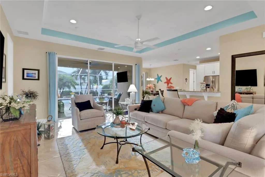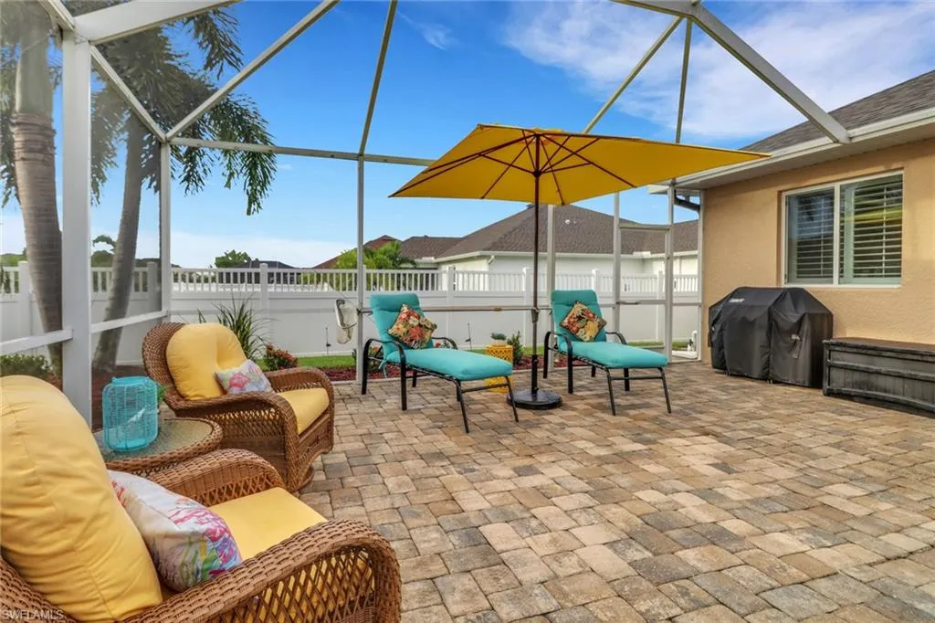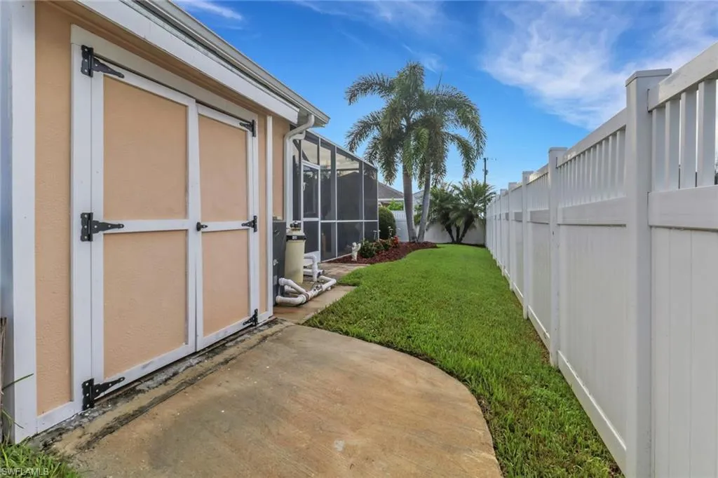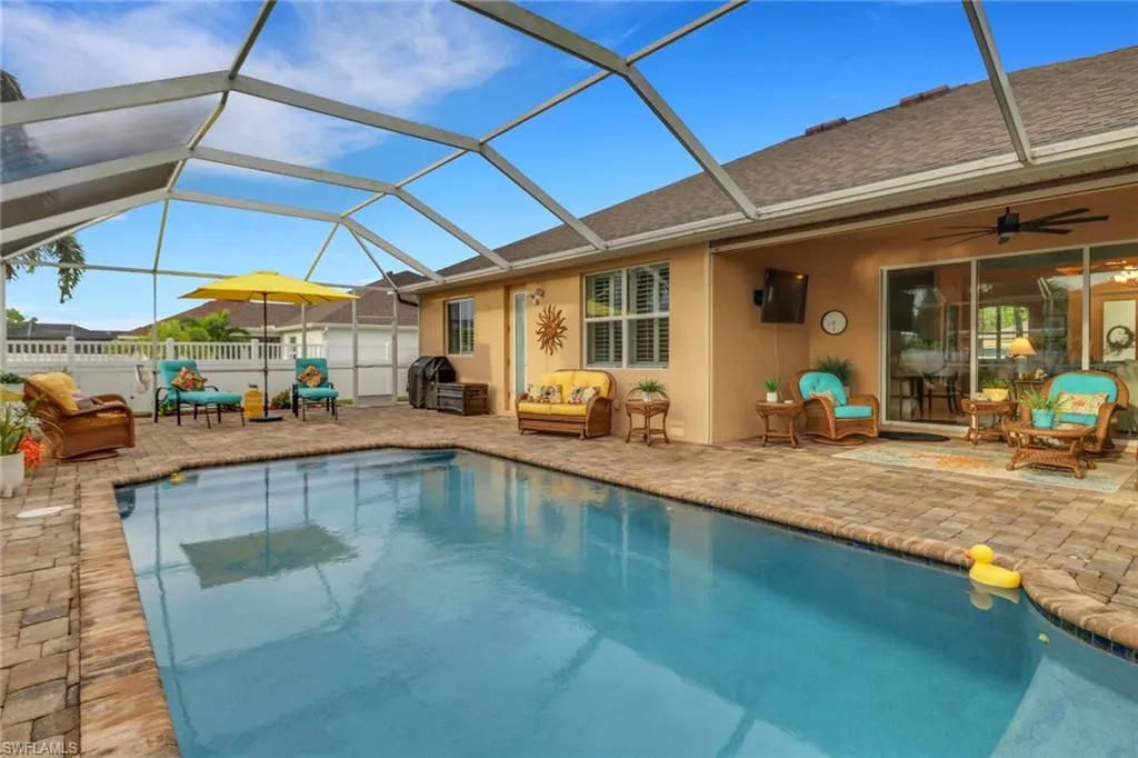 Welcome to your dream home in the heart of highly desirable SW Cape Coral, where the Florida lifestyle shines bright! This pristine, model-like home, just shy of 1,900 sqft, radiates pride of ownership and offers the perfect blend of luxury, comfort, and tropical charm. As you approach, the meticulously manicured landscaping and majestic royal palm trees set the stage. You are welcomed to tile flooring that flows seamlessly throughout, complemented by elegant plantation shutters, hurricane impact windows/doors, 8 ft. doors, and 5.25-inch baseboards that add a touch of sophistication. In the kitchen you will find an abundance of cabinetry, granite countertops, and stainless-steel appliances. Perfect for entertaining, this open kitchen flows effortlessly into the spacious living areas. Retreat to the luxurious main suite, featuring a tray ceiling, a spacious walk-in closet, and a bathroom with dual sinks and frameless glass shower. The second bathroom conveniently opens to the pool area, making outdoor living a breeze. Your private oasis features a heated pool that comes equipped with an expansive pool deck, salt cell, and screened pool cage. Enjoy the morning sun with rear facing eastern exposure. The lanai is equipped with Storm Smart screens for added protection. Whether you’re lounging by the sparkling pool or hosting friends on the patio, this outdoor space is designed for relaxation and fun. The fenced-in yard is perfect for pets or kids, providing a safe and spacious area. Car enthusiasts and hobbyists will love the oversized 3-car garage with a sleek epoxy floor, providing ample space for vehicles, storage, or a workshop. Near restaurants, shops, golf courses, and boat ramps, this location is truly unbeatable! This is the Florida home you’ve been dreaming of, inquire for more details!