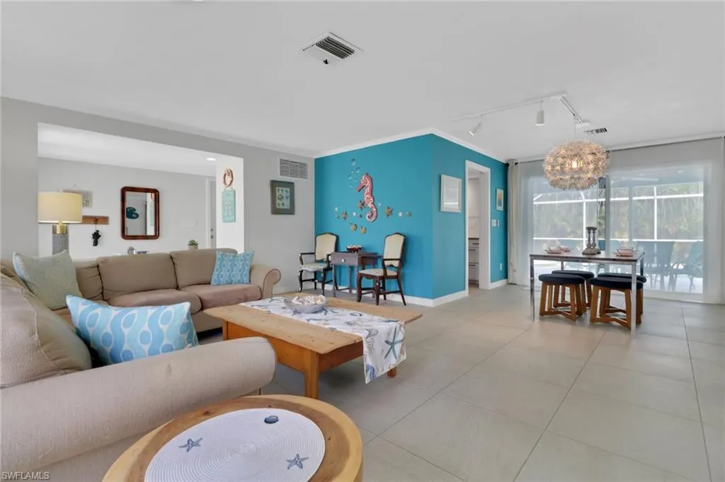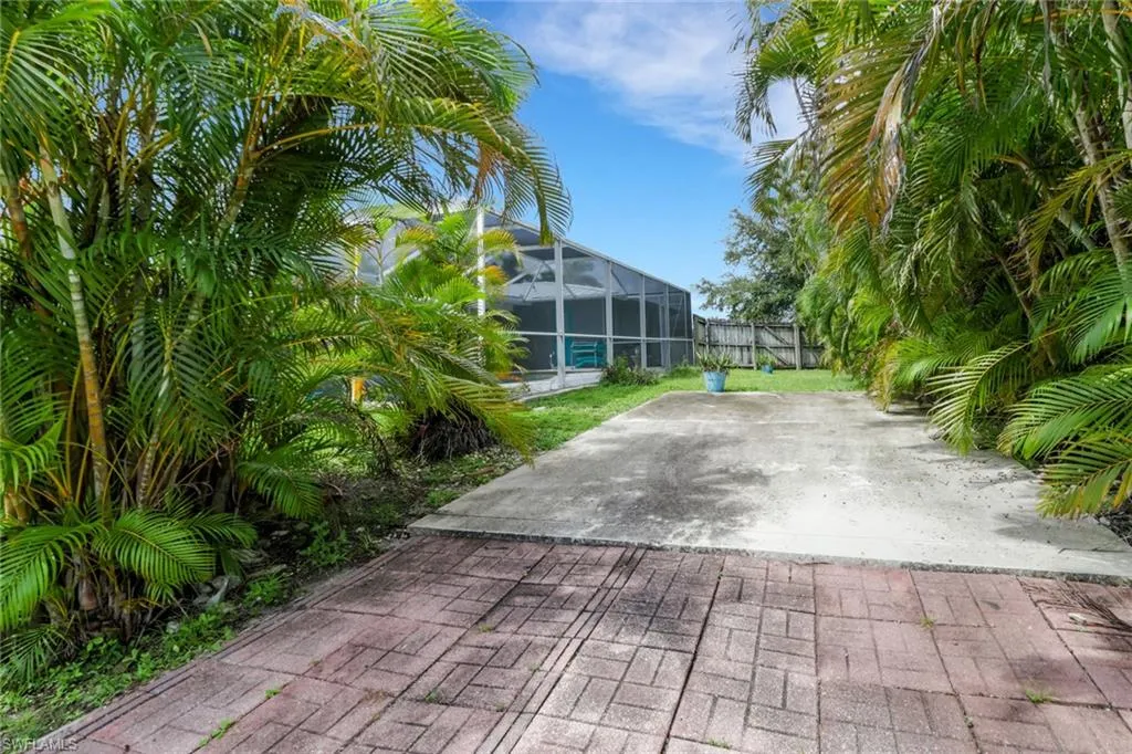 NEW METAL ROOF 12/22! WATER AND SWER IN AND PAID IN FULL! Beautifully maintained and updated 3/2/2 pool home in the prettiest part of Cape Coral. Offered turnkey and furnished in a very tasteful and tropical style. The over sized corner lot curb appeal starts with the mature, tropical landscaping, and extends to the pavered extra parking spot in the rear. Extra high elevation means the home never flooded. Modern and updated kitchen with two toned cabinets and plenty of storage space. Quartz counters and appliance package match the custom backsplash, and large pass through windows to the lanai make entertaining and clean up a breeze. Large covered lanai and spacious pool are are the perfect place to enjoy the weather and entertain family and friends. Owner’s suite features large sliding glass doors to the pool area, bring in lots of natural light, and a large fashionable barn door leads to the updates contemporary bath. Updated guest bathroom doubles as the pool bath. Newer water heater, paint and updated lighting fixtures round out this beautiful remodel.