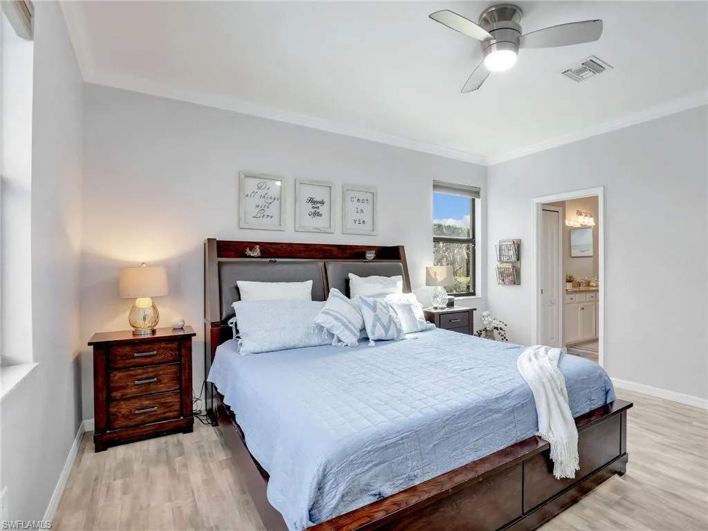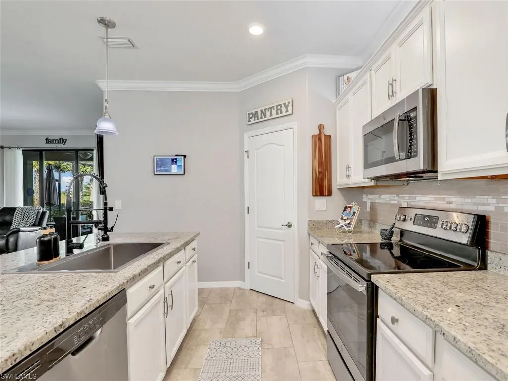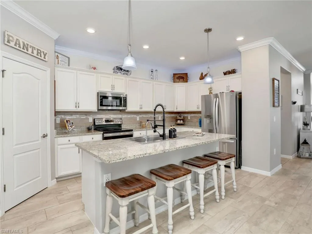 Located in the highly sought-after gated community of The Place at Corkscrew in Estero, this home is designed with both style and functionality in mind. It features an open floor plan with tile and LVP flooring throughout, meaning no carpet anywhere. Customizations include crown molding throughout, newly added wainscoting in the foyer, and a custom feature wall in the dining room.