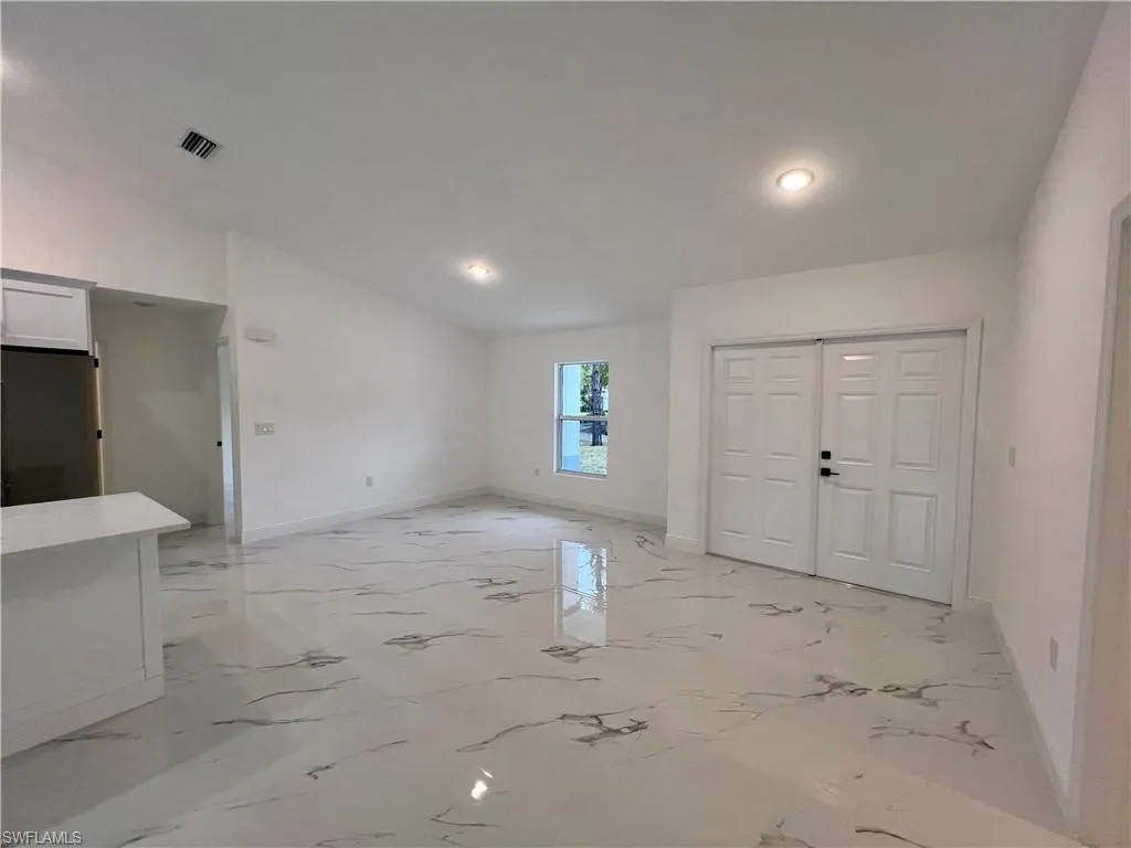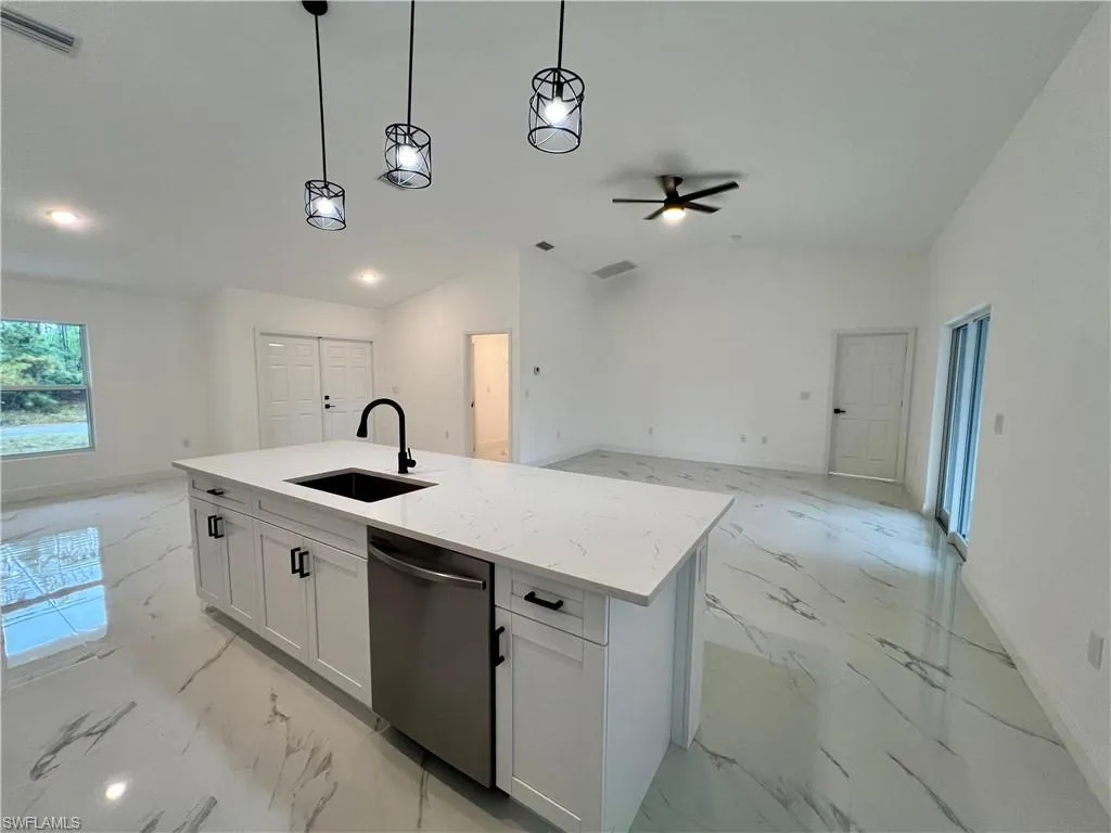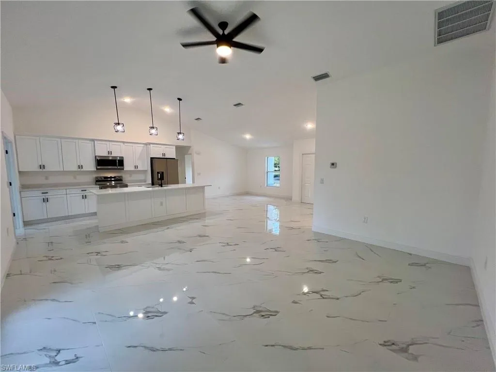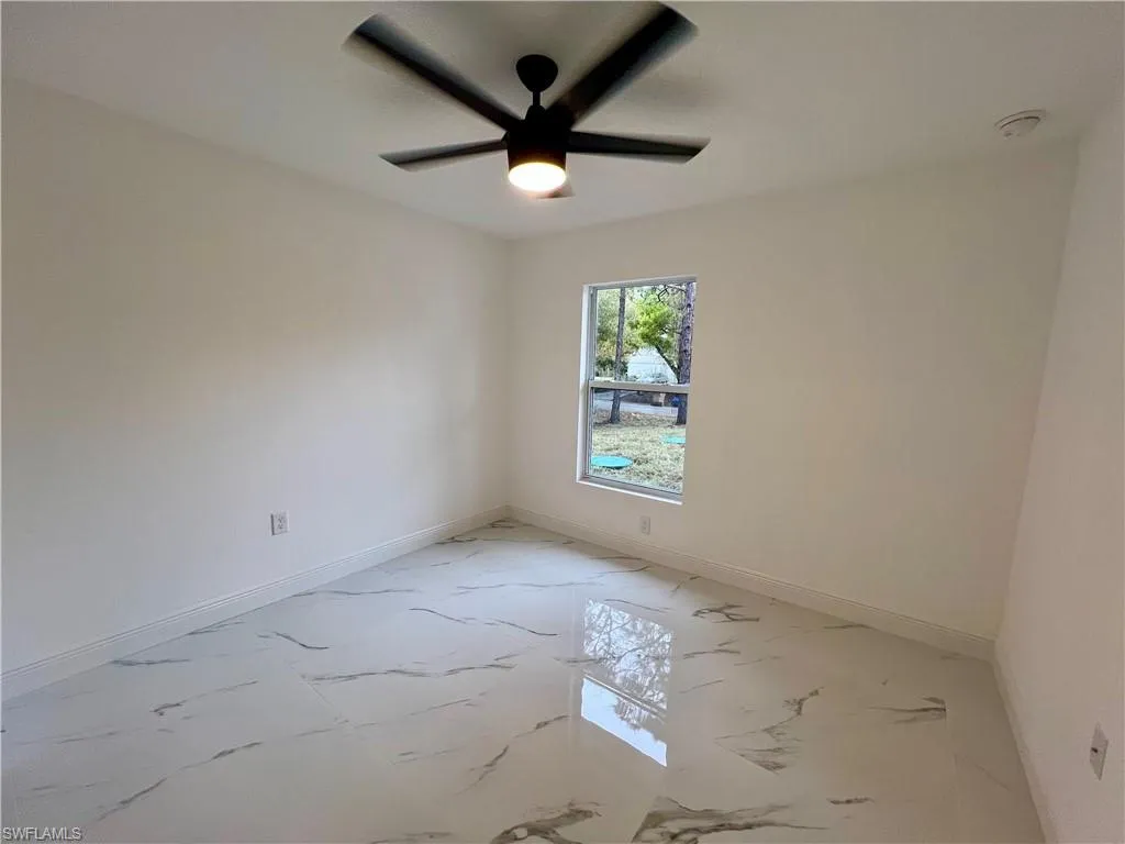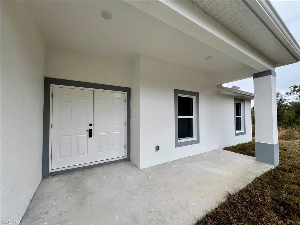 Brand New Home located in Northeast Lehigh on a HALF ACRE LOT at the end of a QUIET DEAD END STREET, MOVE IN READY 3 BEDROOM 2 BATH WITH A DEN with a closet that may be used as 4TH BEDROOM. C.O. HAS BEEN ISSUED, double door entry to the den for privacy, 32 X 32 POLISHED PORCELAIN TILE FLOORS THROUGHOUT THE ENTIRE HOME with 5 inch baseboards, impact resistant windows, covered front porch leads to large great room, high ceilings throughout with tray ceilings in the living room and master bedroom, shaker cabinets with soft close doors and drawers, pendant lighting over breakfast bar, QUARTZ TOPS in kitchen and baths, stainless steel appliance package, pantry, large dining area off of the kitchen, spacious master bedroom with walk in closet, private bath with dual sinks and tiled walk in shower, indoor laundry room, covered porch in rear overlooking the HALF ACRE backyard with plenty of privacy, double garage with auto opener, extra long driveway with plenty of parking, excellent location just minutes to SR 80, I-75 and Ft Myers.