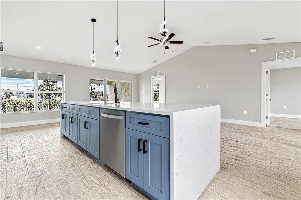 The spacious open-concept great room is designed for everyday living and entertaining, featuring soaring ceilings, durable tile flooring throughout, and the security of impact-resistant windows and doors. At its heart is a designer kitchen showcasing crisp white cabinetry accented by a bold blue island base, elegant quartz countertops, modern pendant lighting, and a full suite of stainless steel appliances. The oversized island invites gatherings, while abundant storage and stylish hardware complete this show-stopping space.