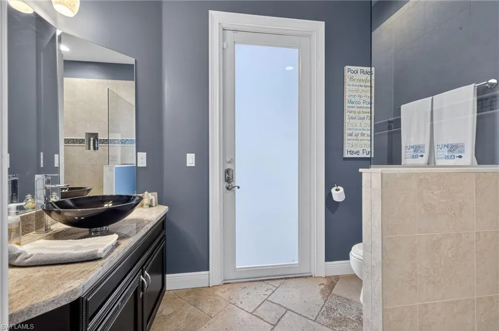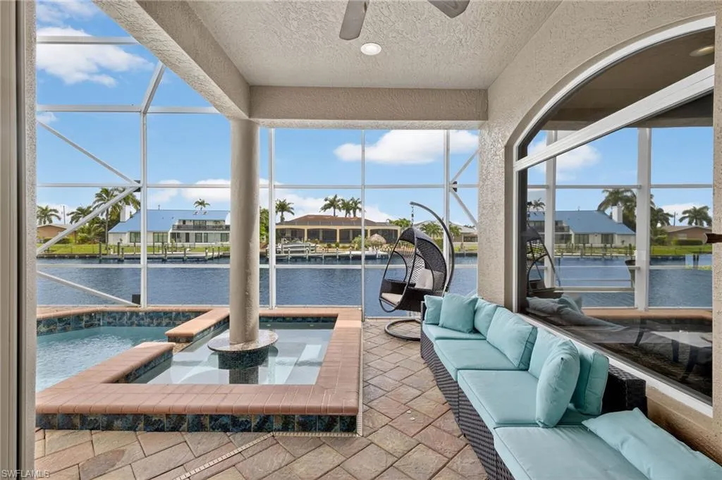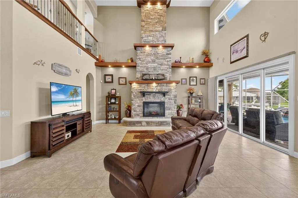 SE “Gold Coast” area of Cape Coral with Direct access boating just 5 minutes to open water! Expansive water views best describe this large custom built estate home with almost 5000 square feet of living space, 5 bedrooms, 4 1/2 bathrooms with an additional 1000+ square foot garage. Enter the home through massive 10-foot-tall iron entrance, doors you will look up to 20-foot coffered ceilings, a sweeping staircase to the left leading upstairs as well as an Office/guest bedroom to the right. The impressive 20-foot-tall stone faced fireplace wall is the centerpiece of this home. The downstairs plan gives both open entertaining to the pool and family room area as well as a private hallway, that leads to an additional guest bedroom, a full guest bath, and a large movie/ game room with a built-in bar/serving area with a full-size refrigerator and even a full bathroom with direct access to the pool. There is a second bar/serving area Outside and off of the game room with a double sink, beer, serving refrigerator, and plenty of storage for the outdoor entertainment area. Upstairs, there is a catwalk that overlooks the great room and kitchen area. On one side of the catwalk, you will find a large bright and open flexible space for guests to have their own private sitting area. Upstairs guest bedrooms, share a large bathroom with a clawfoot, soaking tub with 2 separate vanities. The upstairs guest suite area has a huge walk-in laundry room with tons of custom cabinet storage, as well as a wash tub with views that overlook the canal. On the opposite side of the second floor you will find an oversized main bedroom with six windows, warm lighting in the coffered ceiling, crown molding and a brand new state of the Trane air-conditioning system for the owners personal comfort. The walk-in closet has custom built-in shelves. The owners closet is separated by cabinetry to allow for more storage. There is even a washer dryer hook up in the closet. The main bathroom highlights the oversized soaking tub, dual sinks with a 9’ long vanity, walk around shower with beautiful views of the intersecting canals as well as a double door, entrance to a private deck, overlooking the pool and waterfront. The pool area and waterfront blend as one space with multiple seating areas a 6+ person hot tub, 6 seat bar area, sitting and dining options, full outdoor barbeque with built-in refrigerator and storage. The boat dock has 90 linear feet of captains walk with viewing windows to into the water. The boat lift is rated at 14,000 pounds and features a walk-around dock. There is plenty of room for a 30 or 40 foot boat. Other things to note a 250 gallon propane tank, 200 foot of water frontage, Impact windows and doors and a new roof in 2025.
