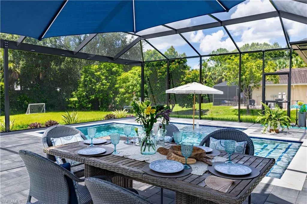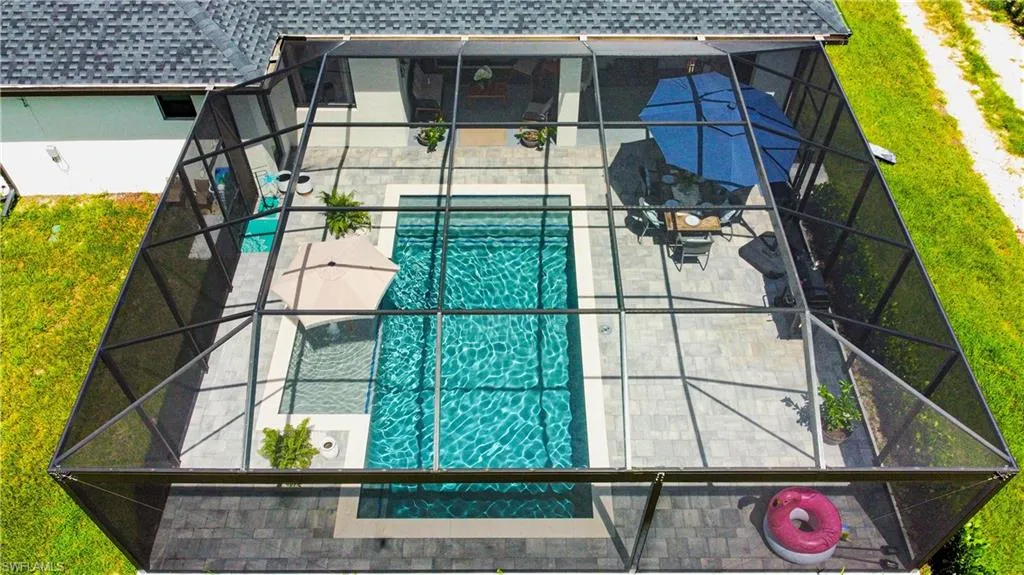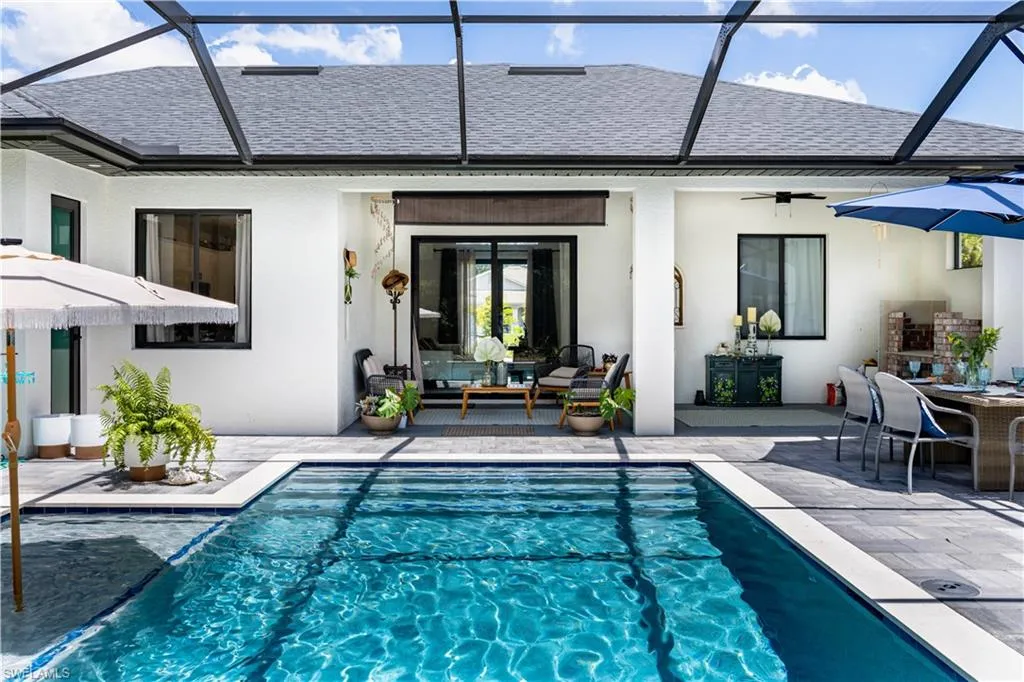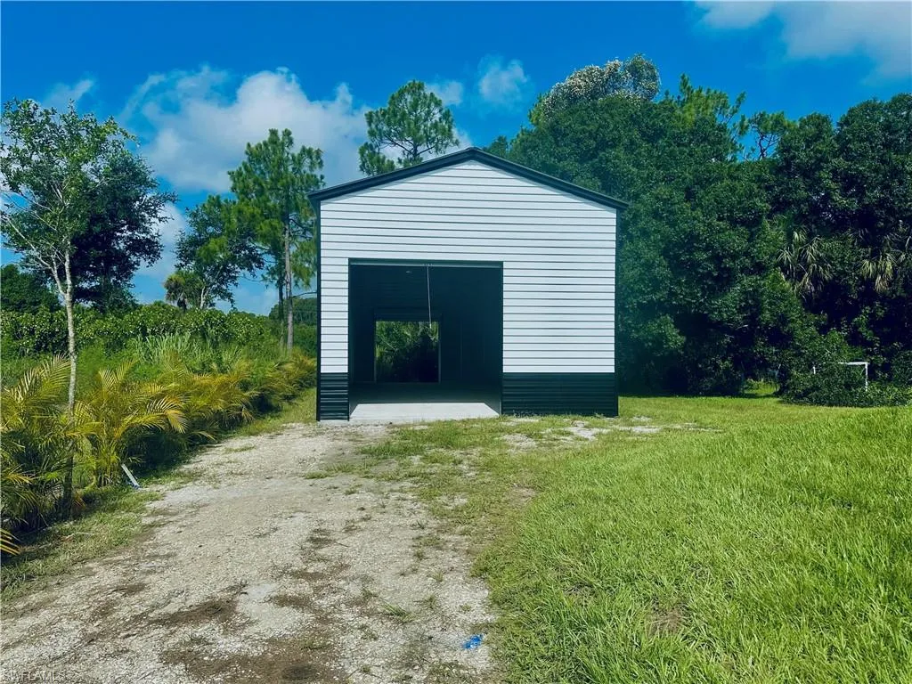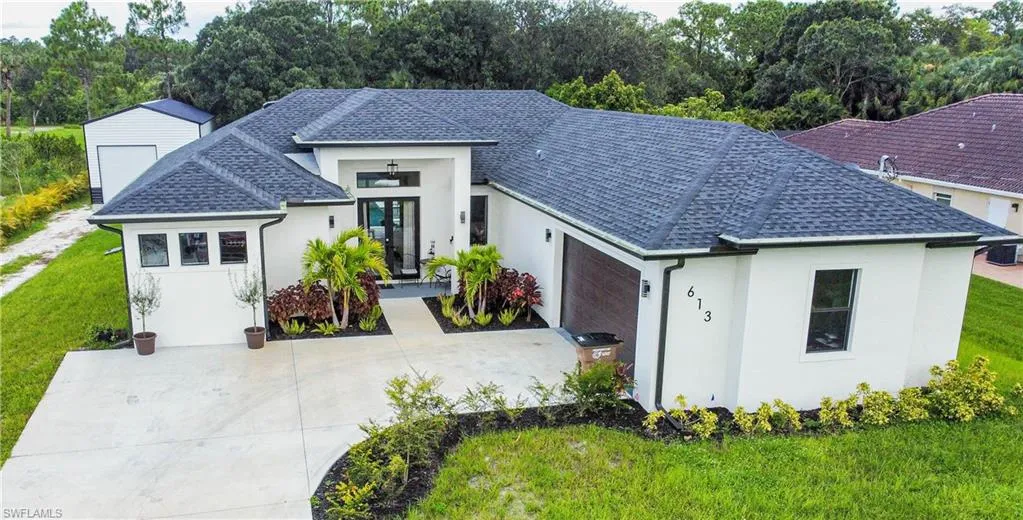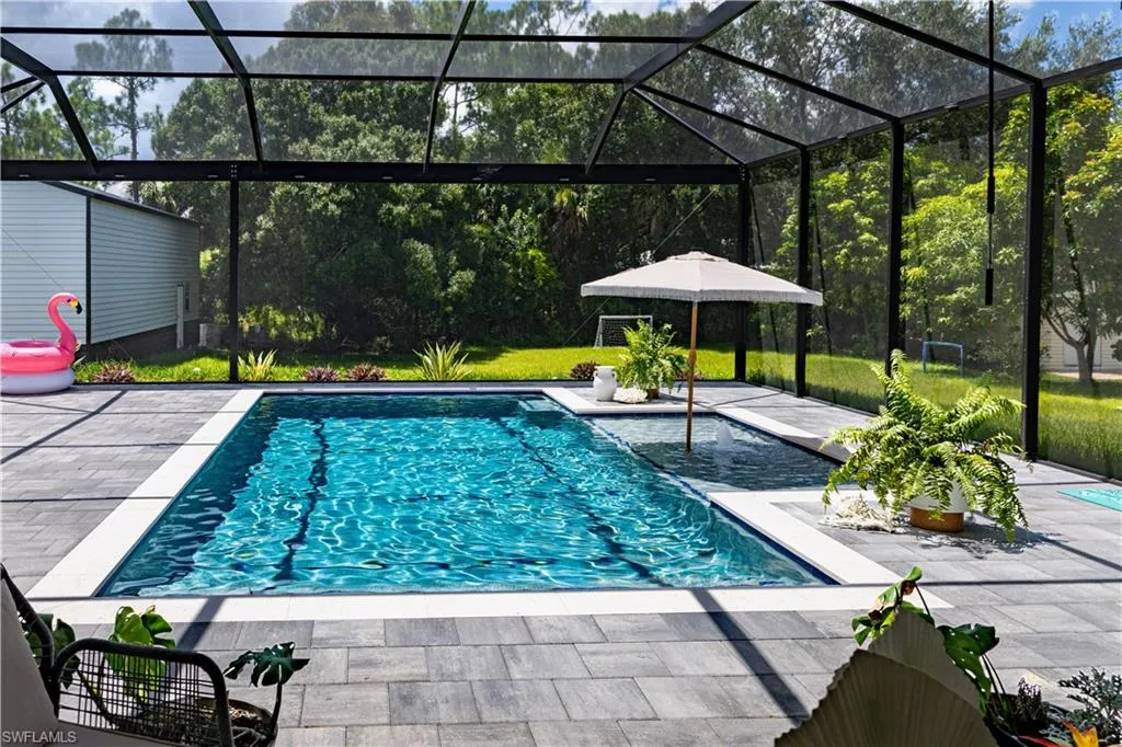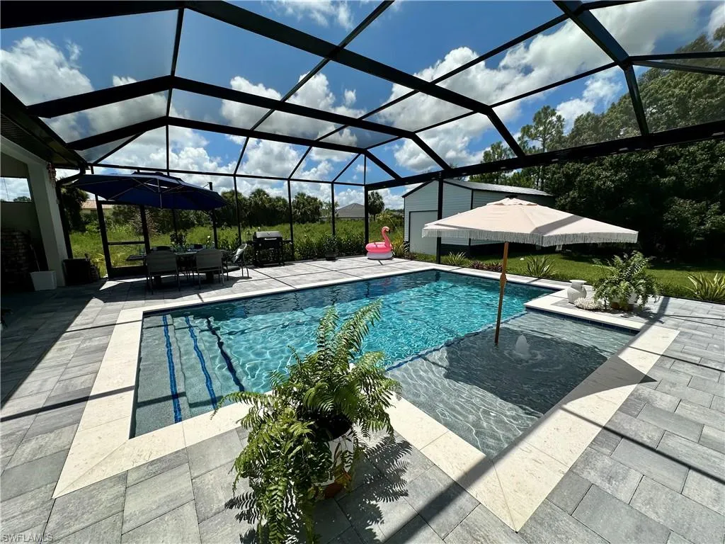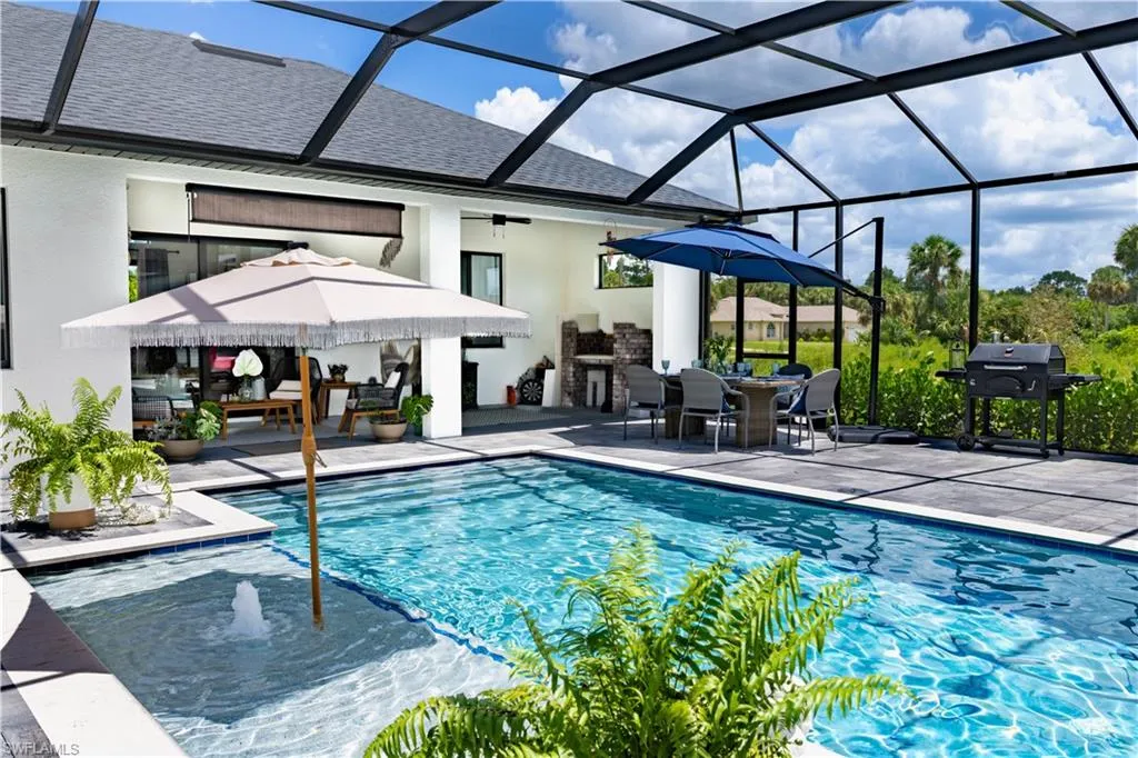 Discover this stunning, newly constructed 4-bedroom, 3-bathroom pool home designed for both luxurious living and functional space. The open floor plan is bright and airy, featuring sleek porcelain tile floors that reflect natural light, creating a clean, resort-style feel. Seamlessly connect indoor and outdoor living through the expansive sliding glass doors that open to a breathtaking screened lanai. This private oasis is perfect for entertaining, featuring a sparkling pool surrounded by a large deck. The home offers a flexible layout with two master suites, providing exceptional privacy and comfort for a multi-generational family or guests. Beyond the main house, a massive 20′ x 40′ detached workshop is a standout feature. This dream space includes two 12-foot high rollup doors and closed-cell spray foam insulation for maximum efficiency—ideal for a business, car collection, or serious hobbyist. Situated on a spacious half-acre lot, there’s ample room for your RV or boat. Enjoy the freedom of no HOA fees or restrictions in a highly sought-after area. You’ll be just minutes from local amenities, 40 minutes from beautiful beaches, and 30 minutes from Southwest Florida International Airport.