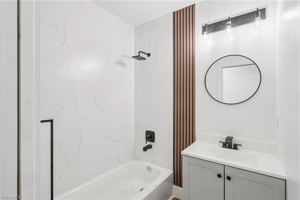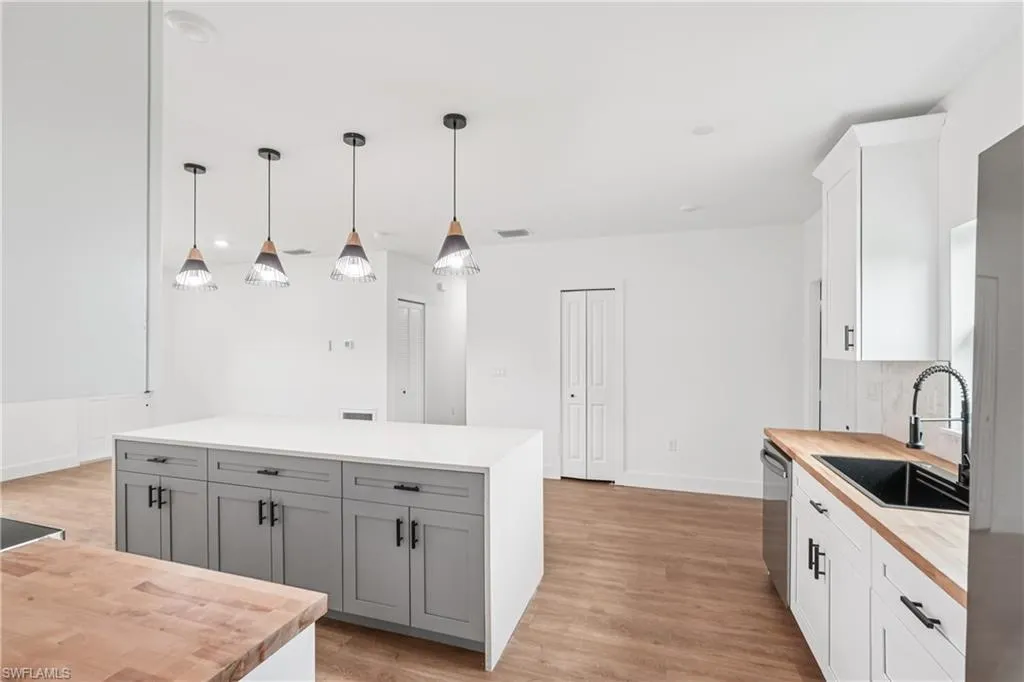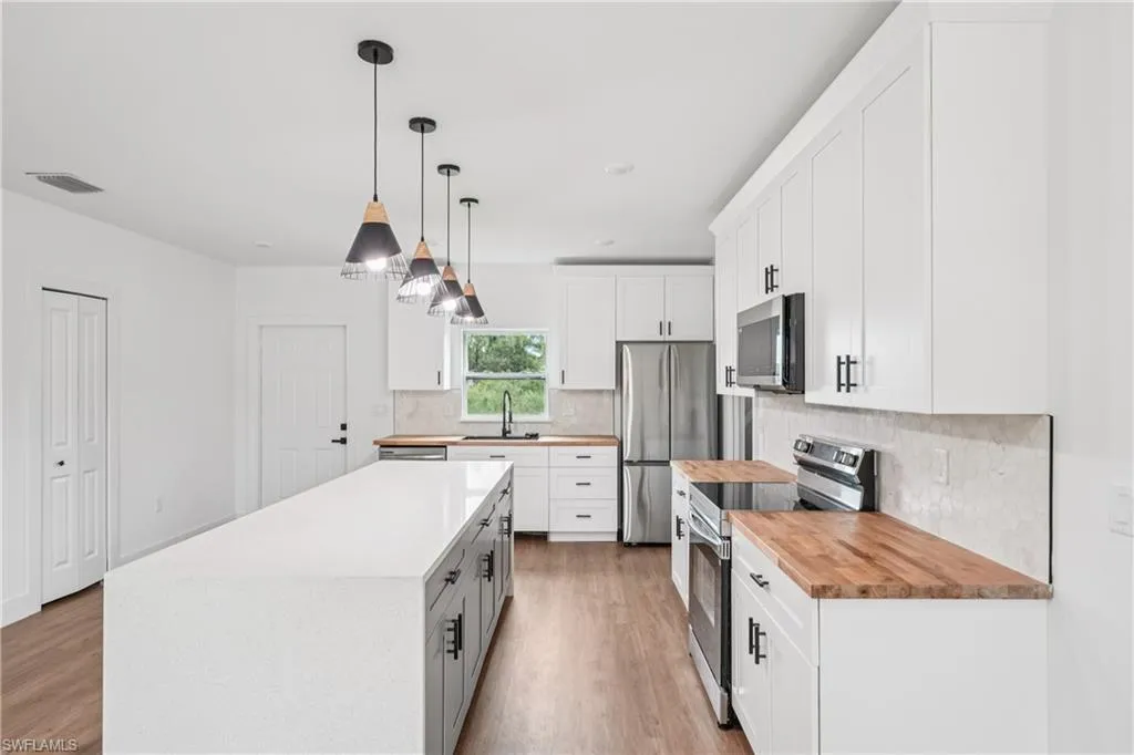 Step into this inviting 3 bedroom 2 bath home with 1,101 square feet of smartly designed living space. The open kitchen is a true highlight with Samsung appliances, plenty of cabinets, and a mix of quartz and butcher block countertops that add both character and function. Bathrooms are tastefully finished and the flooring throughout the home is waterproof and fire resistant luxury vinyl that combines style with easy care. A washer and dryer are already included. The property offers a one car garage with exterior access, a driveway that fits two vehicles, and a backyard with an automatic sprinkler system ready for whatever you imagine. Built with solid concrete block construction, this home is move in ready. Conveniently located minutes from SR 82, I 75, The Forum, and Southwest Florida International Airport, you are close to shopping dining and major routes while still enjoying a quiet setting.