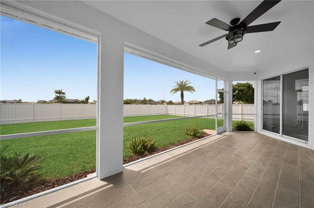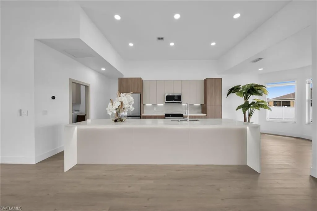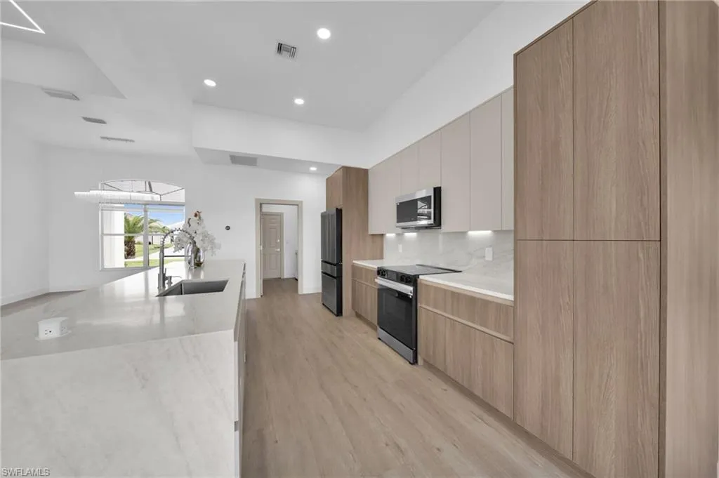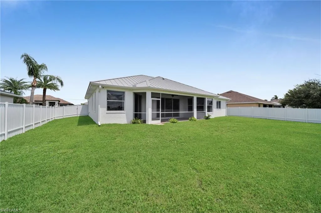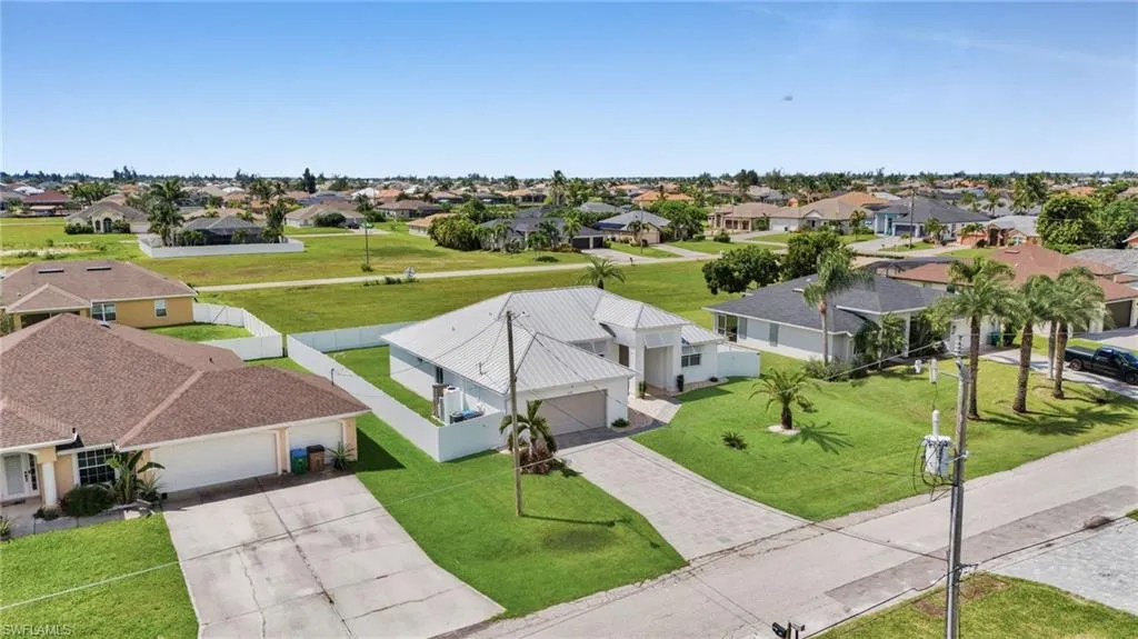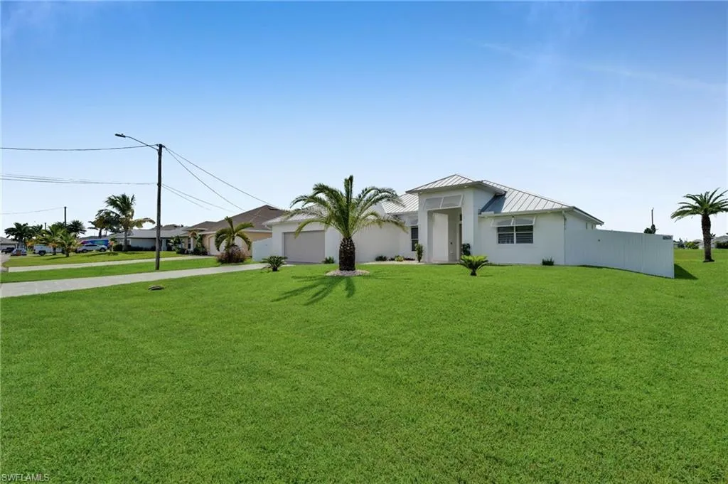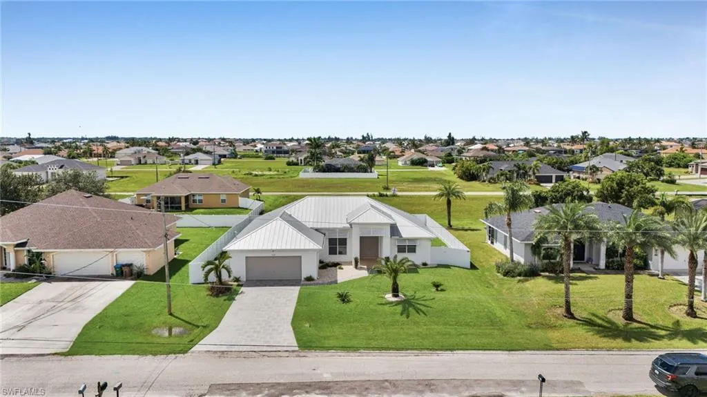 This beautiful 3-bedroom, 2-bathroom modern-style home offers nearly 2,100 sqft of living space in Burnt Store area one of the most desired areas in Cape Coral. The property provides ample space for a future pool. Less than 5 minutes from future 7 ISLANDS Hotels, Restaurants and Marina Development. The home is newly fully fenced. You will find high-end finishes throughout, including brand new modern appliances, new modern cabinets and Taj Mahal Quartz island and bathrooms. Home features a brand new A/C system, a new Full-House Reverse Osmosis water filtration system with maintenance included for 1 year, a new metal roof, new floor, new driveway, garage floor and lanai floor, new bathrooms, security camera system, zebra privacy curtains and much more. House was fully renovated inside and out to the detail by owner. This is a good opportunity for AirBnB investors.