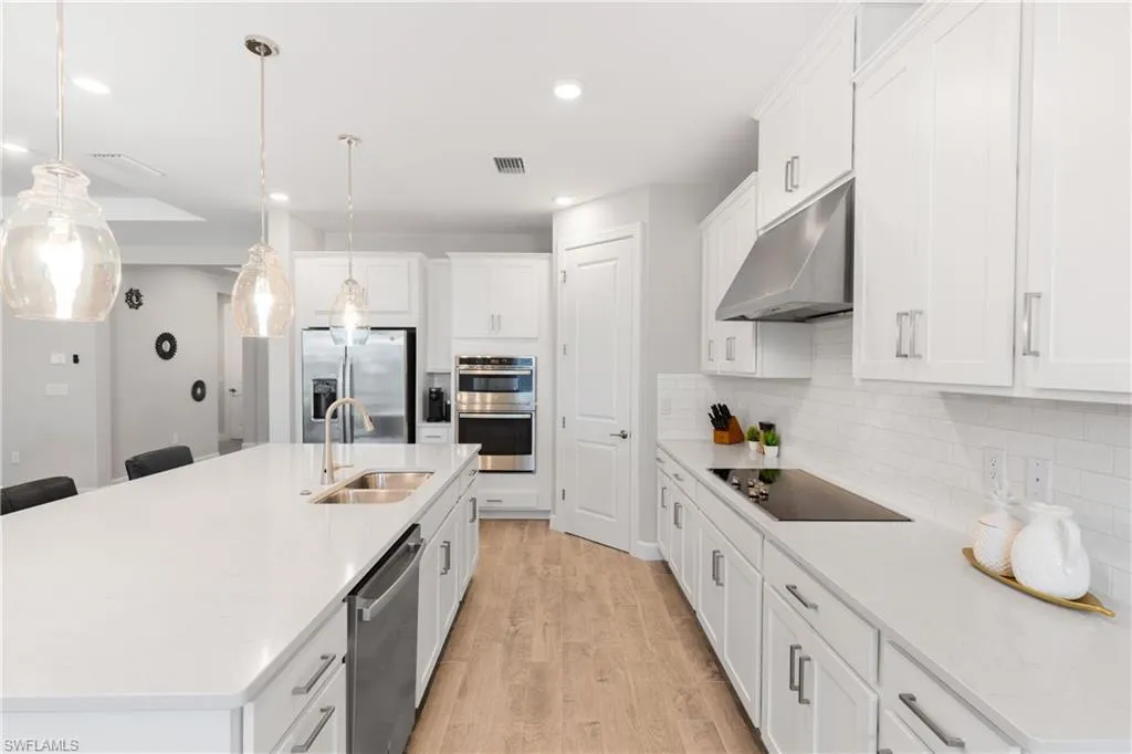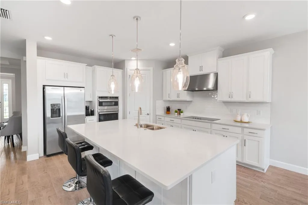 The gourmet kitchen is a true showpiece, boasting sleek stainless steel appliances, 42″ upper cabinets, a spacious pantry, and a quartz-topped island that seamlessly connects to the living area.