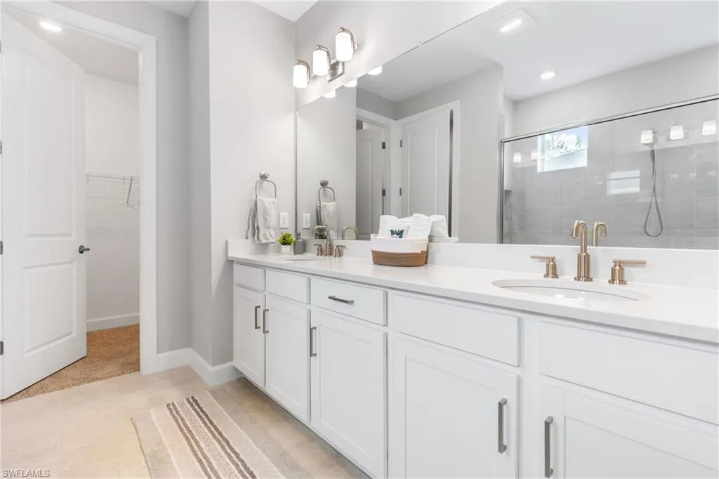 Your private retreat awaits in the luxurious primary suite, featuring a spa-like walk-in glass shower, dual sinks, and a spacious walk-in closet. Throughout the home, refined details—porcelain tile, tray ceilings, 8′ tall doors, crown moldings, and designer lighting—enhance the modern elegance.