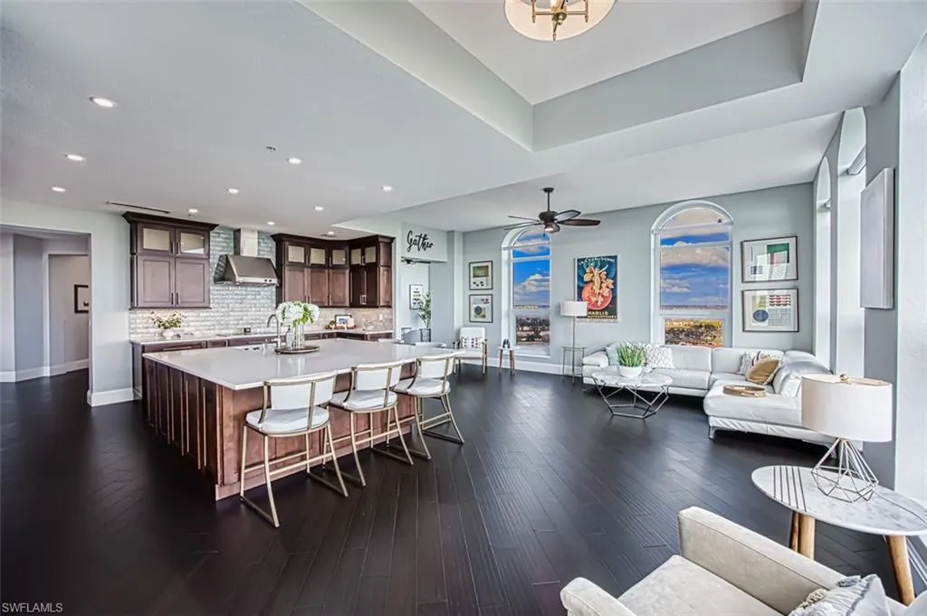This RARELY avail 4,300+ sq ft, 20th fl PH is as STUNNING inside as the view is outside. The interior has been completely renovated & updated w/high end finishes (a complete list is attached to the listing) while the exterior vistas offer panoramic views equal in the WOW factor! The moment the secured elevator opens into a private foyer & you continue through the tall, double doors, your eyes are drawn out to the Gulf & Bay. The waters shimmer from the sunlight by day & moon beams by night. Catch The Key West Express, FMB Pirate’s ship, shrimping & fishermen’s boats heading out every morning and returning each evening. Floor to ceiling sliding glass doors & tall, arched windows frame the mesmerizing horizon from almost every room. The N end of FMB & E end of Sanibel, including the historic lighthouse, are bookends flanking the endless view. Two generous, tiled, screened lanais – #1 is 10’ x 20’ and accessed exclusively from the primary retreat while #2 is 34’ X 15’ and accessed by the living, dining & family rms – offer outdoor living & entertaining space. The sliders & windows are hurricane impact & both lanais are out-fitted with Storm Smart shades. 10’ ceilings offer additional volume & light. The main living area, currently used as a media room, has a custom, built-in, floating entertainment console. This area flows into a formal dining rm where you can enjoy family gatherings while witnessing colorful sunsets. Adjacent is a Butler’s Pantry w/wet-bar & wine refrigerator. A chef’s kitchen, featuring a sizable island & countertops w/quartz & SS appliances, is open to the family room allowing the family chef to interact w/guests while prepping meals. A den/office, located just off the family room, could easily be turned into a 4th bedroom. The ½ BA w/pedestal sink & 2 in-suite guest bedrooms & ample laundry w/deep sink & storage complete this end of the condo-home. For privacy, the primary suite is located on the opposite end from the guest bedrooms and has a private lanai, 3 sizable walk-in closets w/California Closet organizers. The in-suite primary BA features dual sinks & separate vanity w/quartz, private water closet, large walk-in shower & free-standing tub. A generous 19’W X 35’D private, under-bldg garage conveys. A detached 1-car garage is available for an extra cost. All of this is situated on 50+ acres providing privacy due to the low-density. Enjoy a 25-acre crystal clear lake, lush, tropical vegetation & resort style amenities including a 6000+ sq ft completely renovated clubhouse w/fitness center, yoga studio, billiard rm, gathering space, dining area, kitchen & media center. The grounds feature tennis/Pickleball courts, bocci, dog park & 1-mile long shell path surrounding the lake. The property backs up to 700+ acres of preservation land & offers a prime location for walking to a beach, restaurants, shops, grocery & close enough to a bike to Sanibel & FMB.