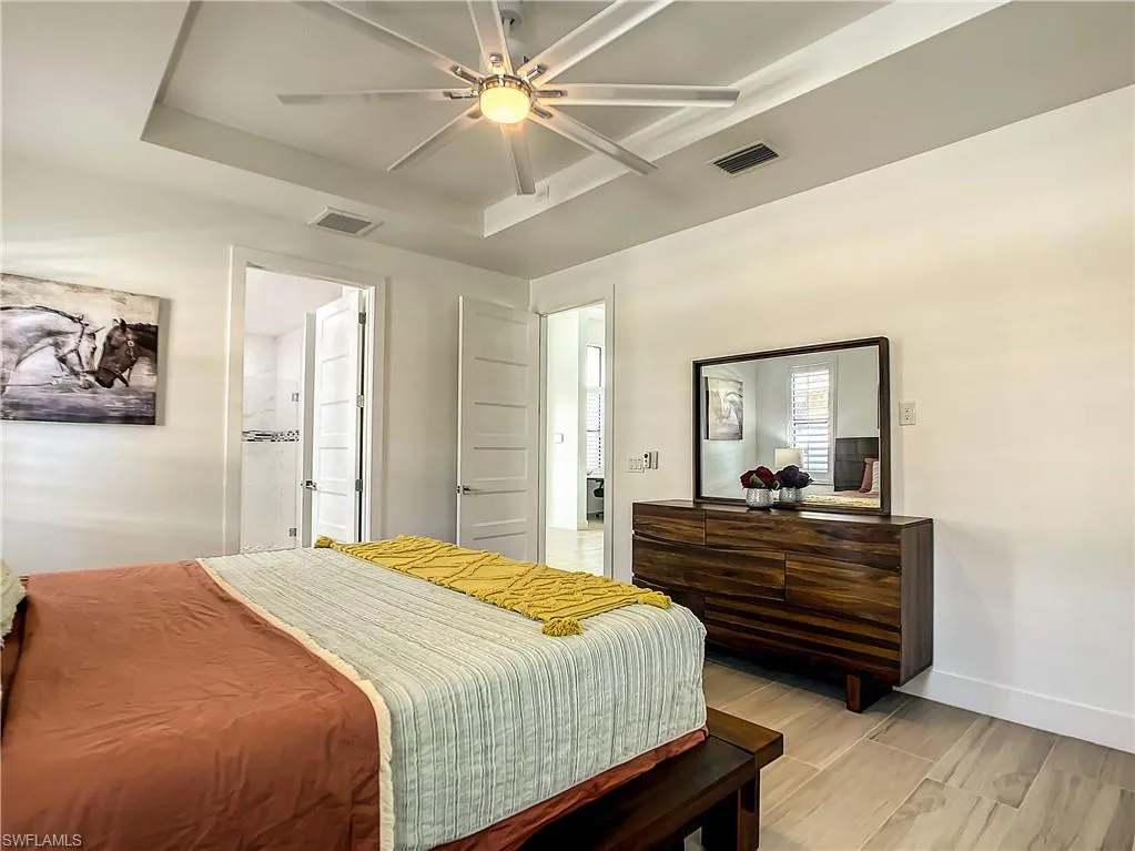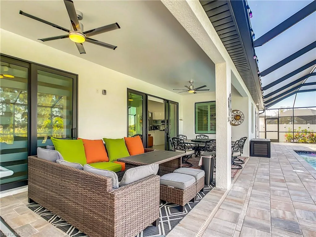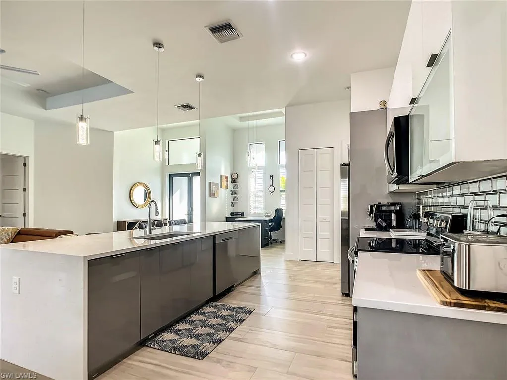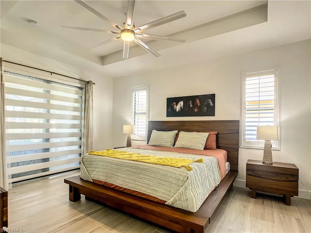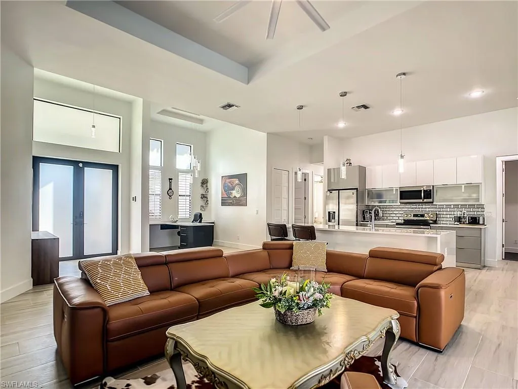 Ever dreamed of owning a waterfront home in SW Cape Coral? This stunning 4/3 pool home is equipped with all the modern amenities and luxurious features you could desire. Step inside, you’ll be captivated by the fine touches and attention to detail. The kitchen boasts European-style cabinets and exquisite quartz countertops, creating a sleek and sophisticated atmosphere. 12-foot ceilings add an extra touch of grandeur, while the tile plank flooring throughout the home exudes elegance. Hurricane impact windows, ensuring your peace of mind. Plantation shutters add a touch of classic charm to every room. A built-in home office, allowing you to separate work and personal life. Built-in wet bar and modern entertainment center provide the perfect setting for hosting guests. Custom ceiling fans are installed throughout the home, ensuring optimal airflow. The heated saltwater pool offers a refreshing oasis for relaxation and enjoyment. One highlight of the property is the concrete dock, which overlooking the canal. Imagine sipping your morning coffee while taking in the serene beauty of the water. Don’t miss out on the opportunity to make this dream home yours.